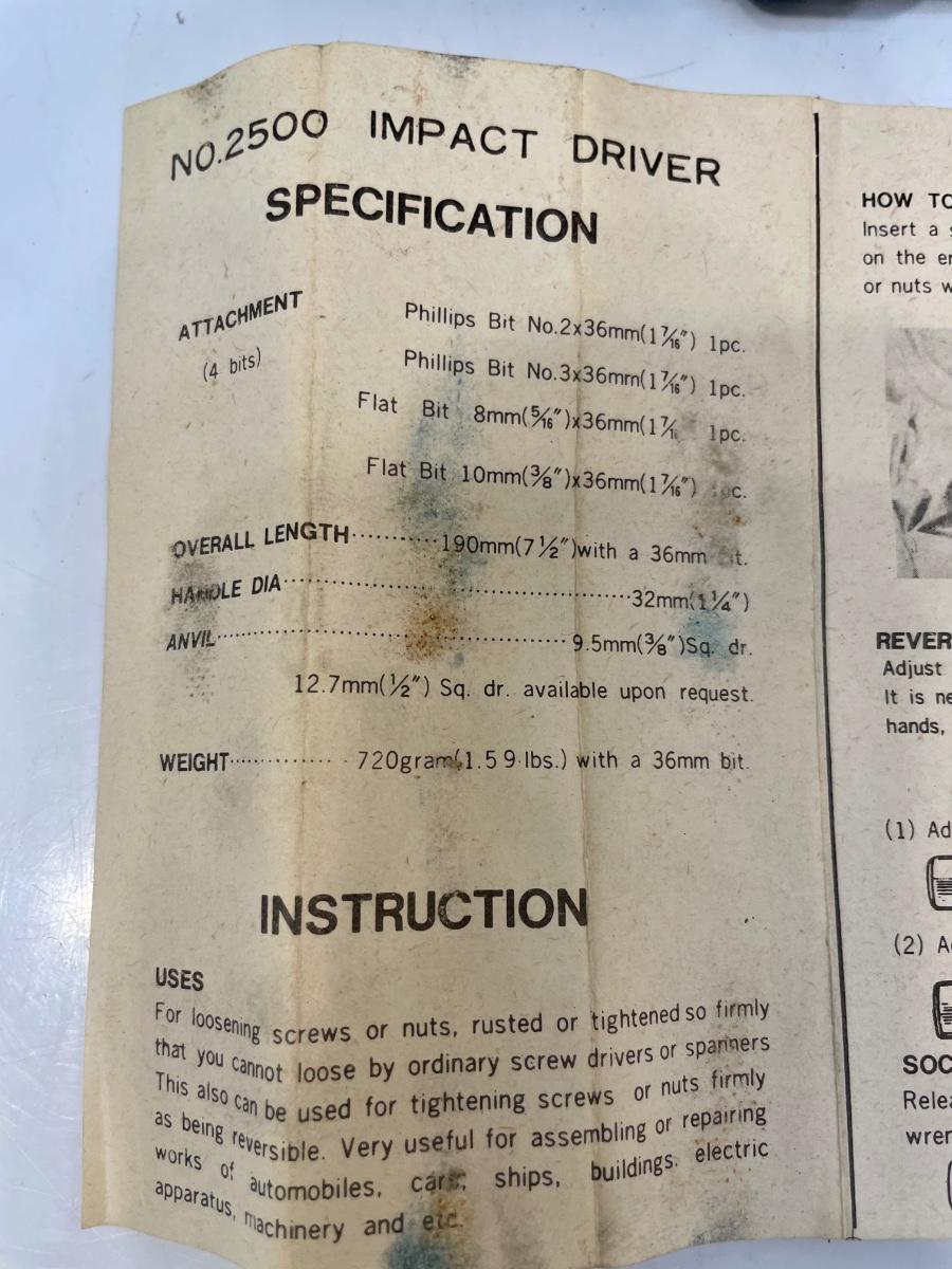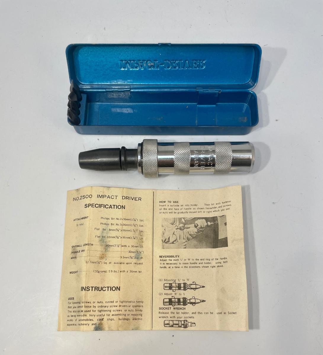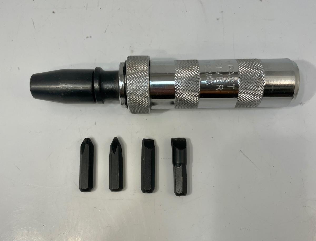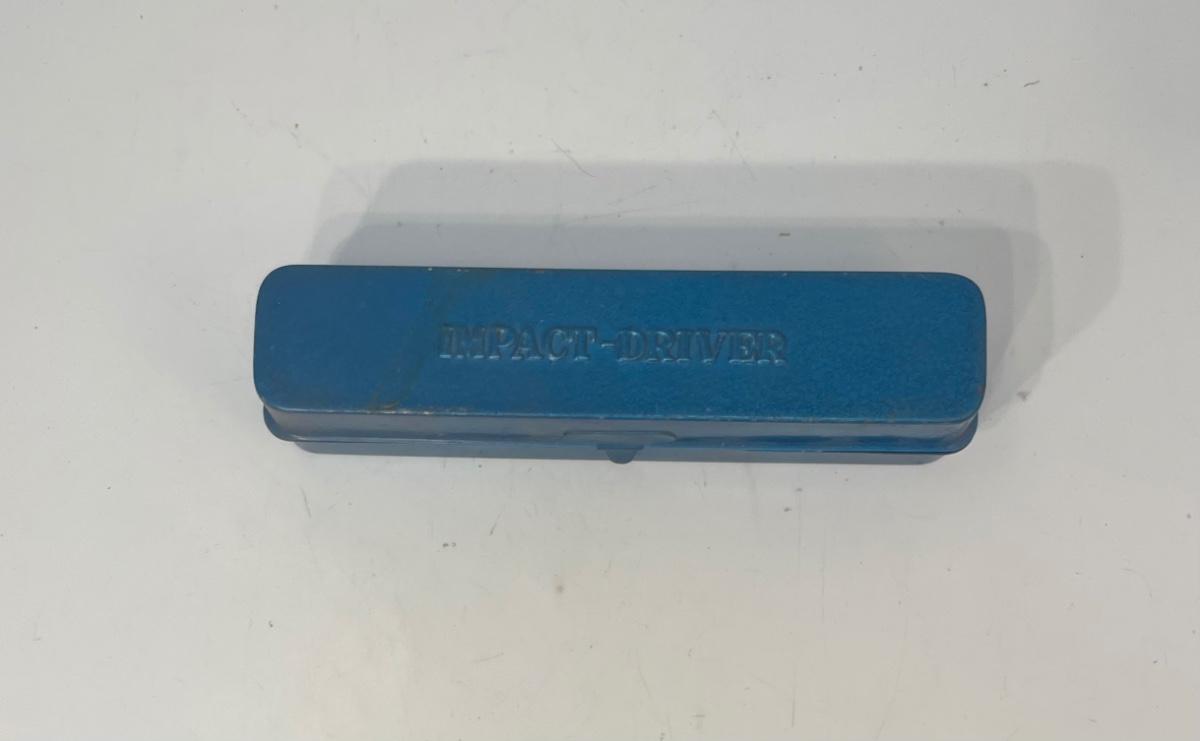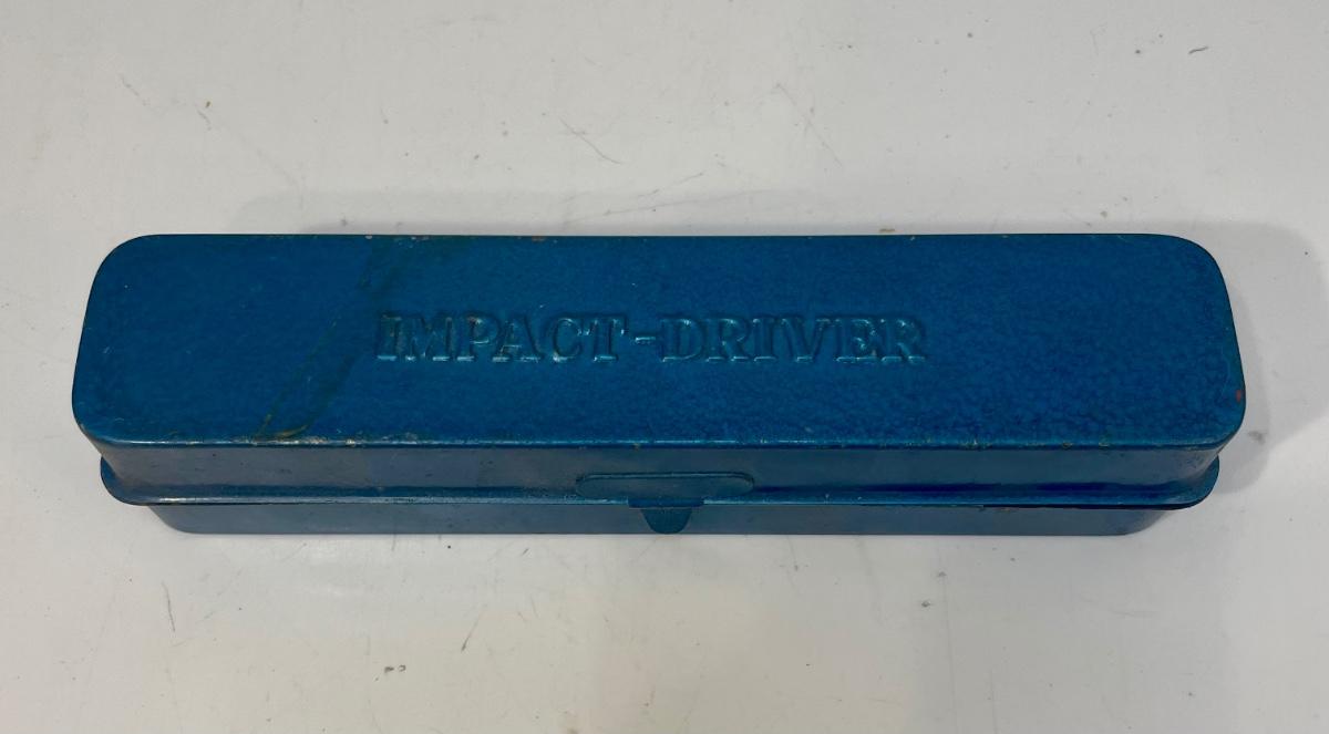 Impact Driver Set, includes 4 bits and metal storage case. For loosening stuck screws. Made in Taiwan.