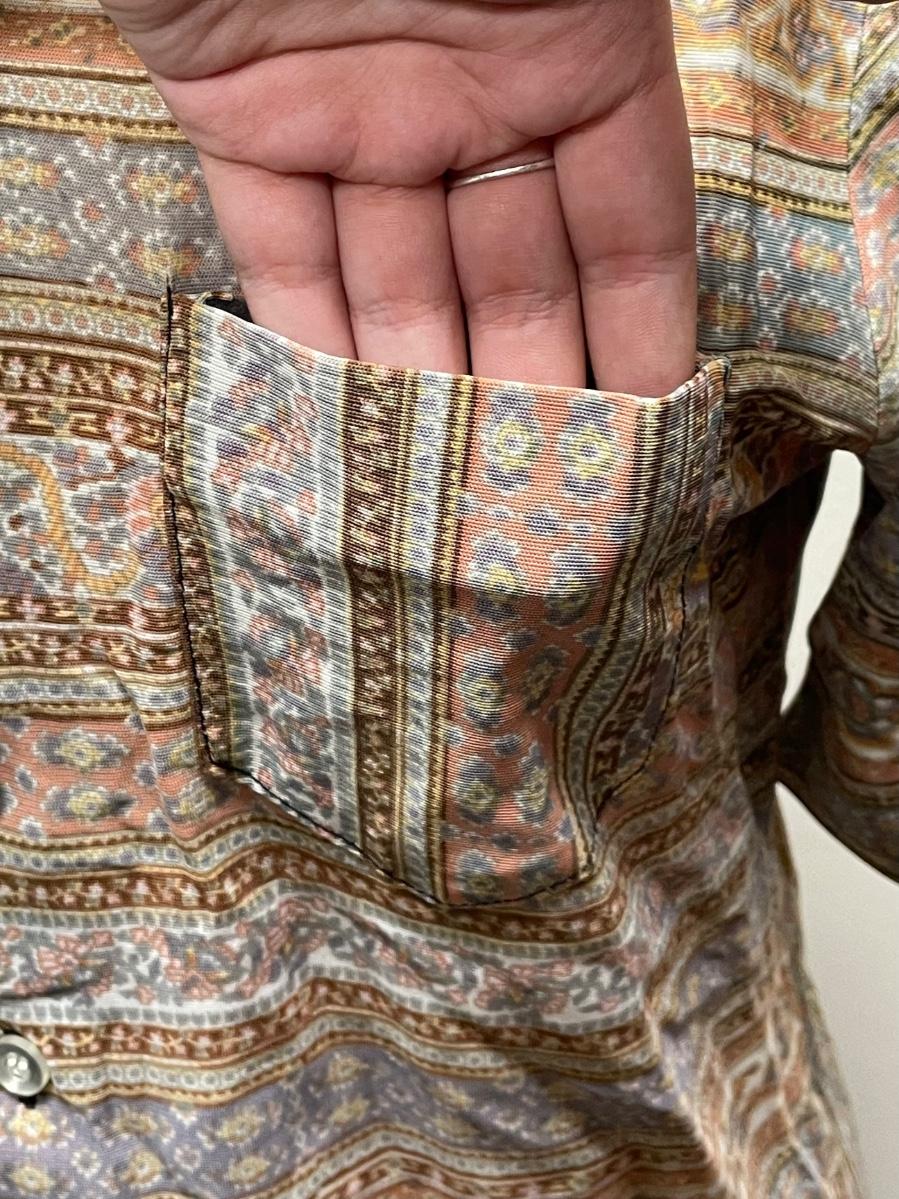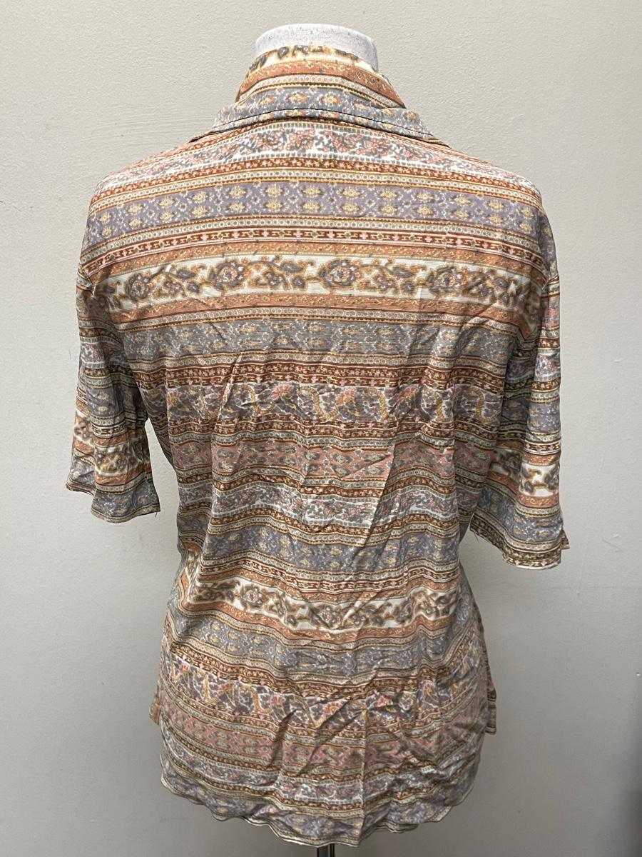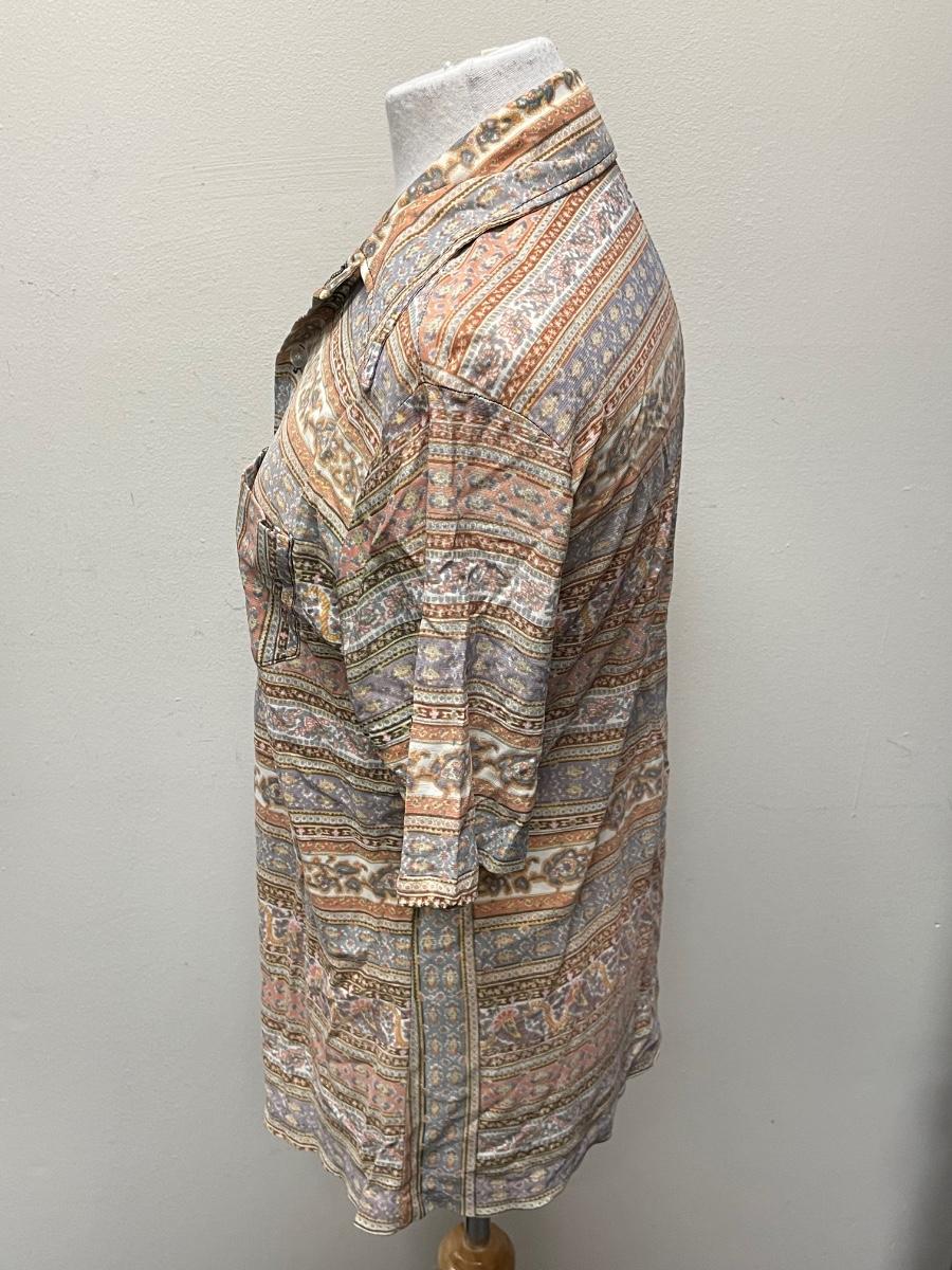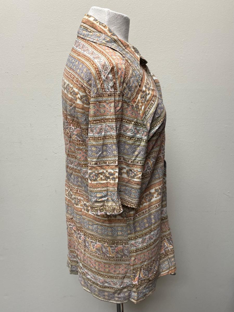 This item is in good condition. It is a bit wrinkly due to being folded. The item comes with all of its buttons, none are missing. It doesn’t contain a size but it seems to fit a medium, maybe a large.