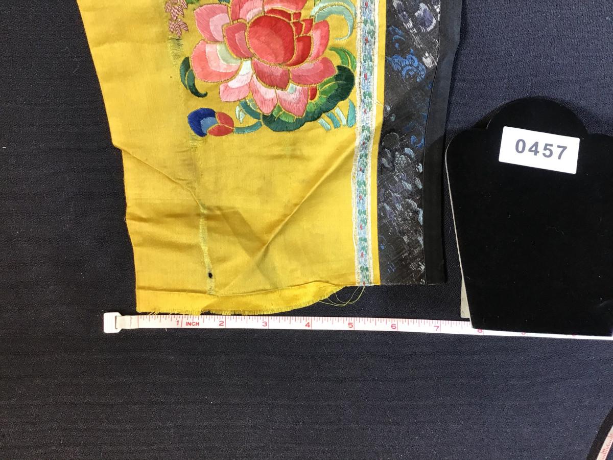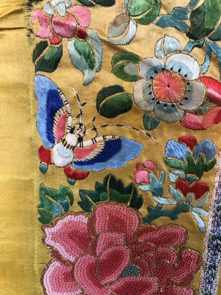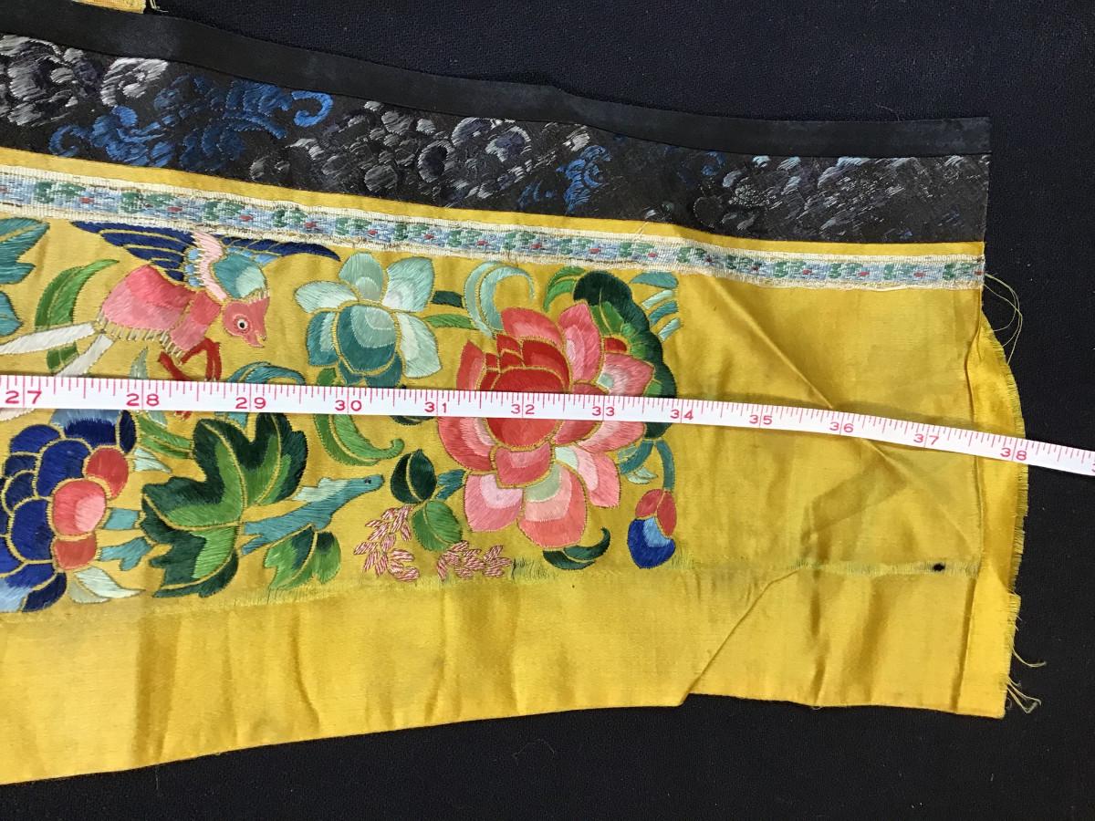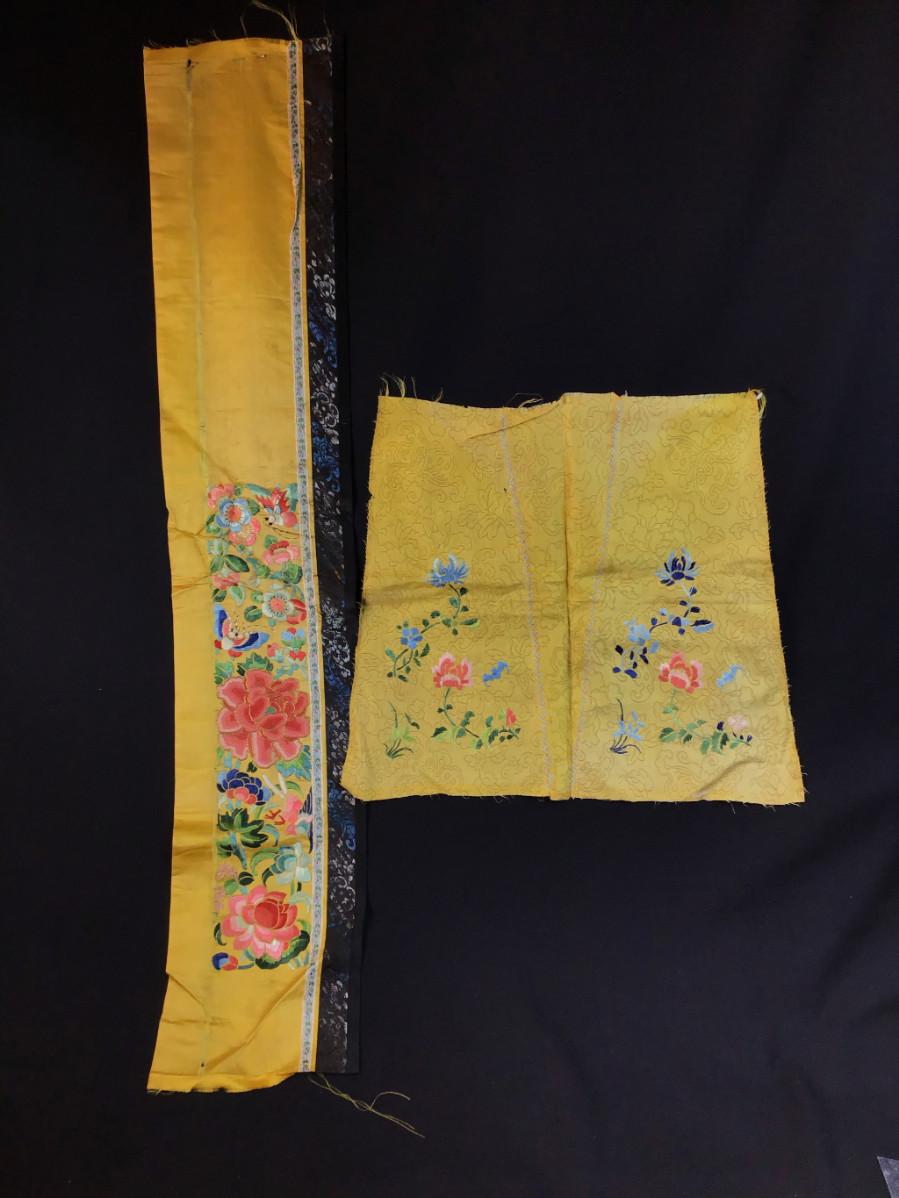 DESCRIPTION: These antique silk fragments include a finely worked embroidered panel detailed with chrysanthemums and butterflies, and a square fragment worked with colorful floral sprays.
