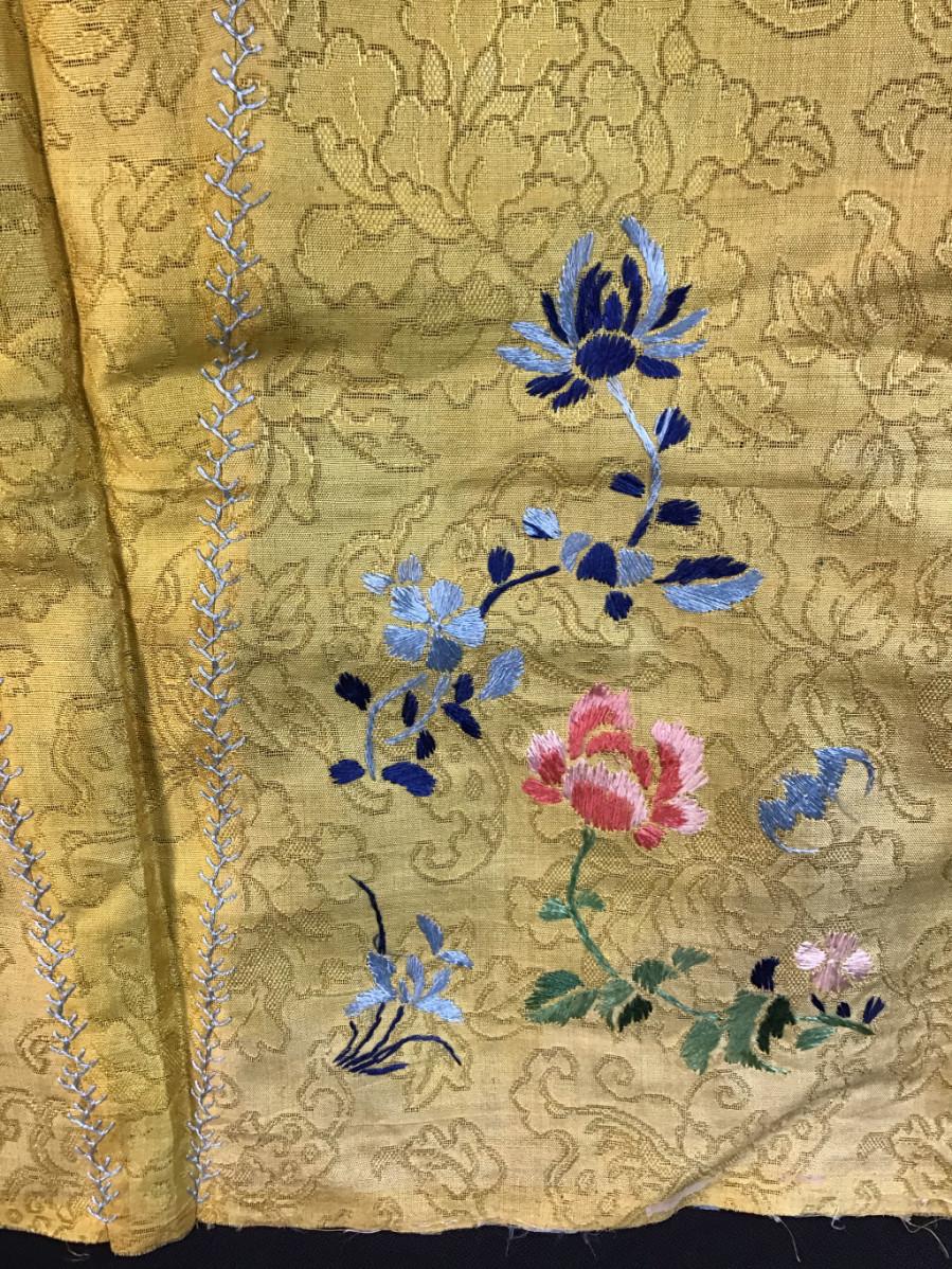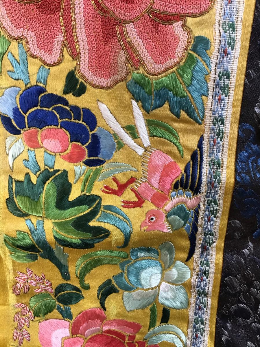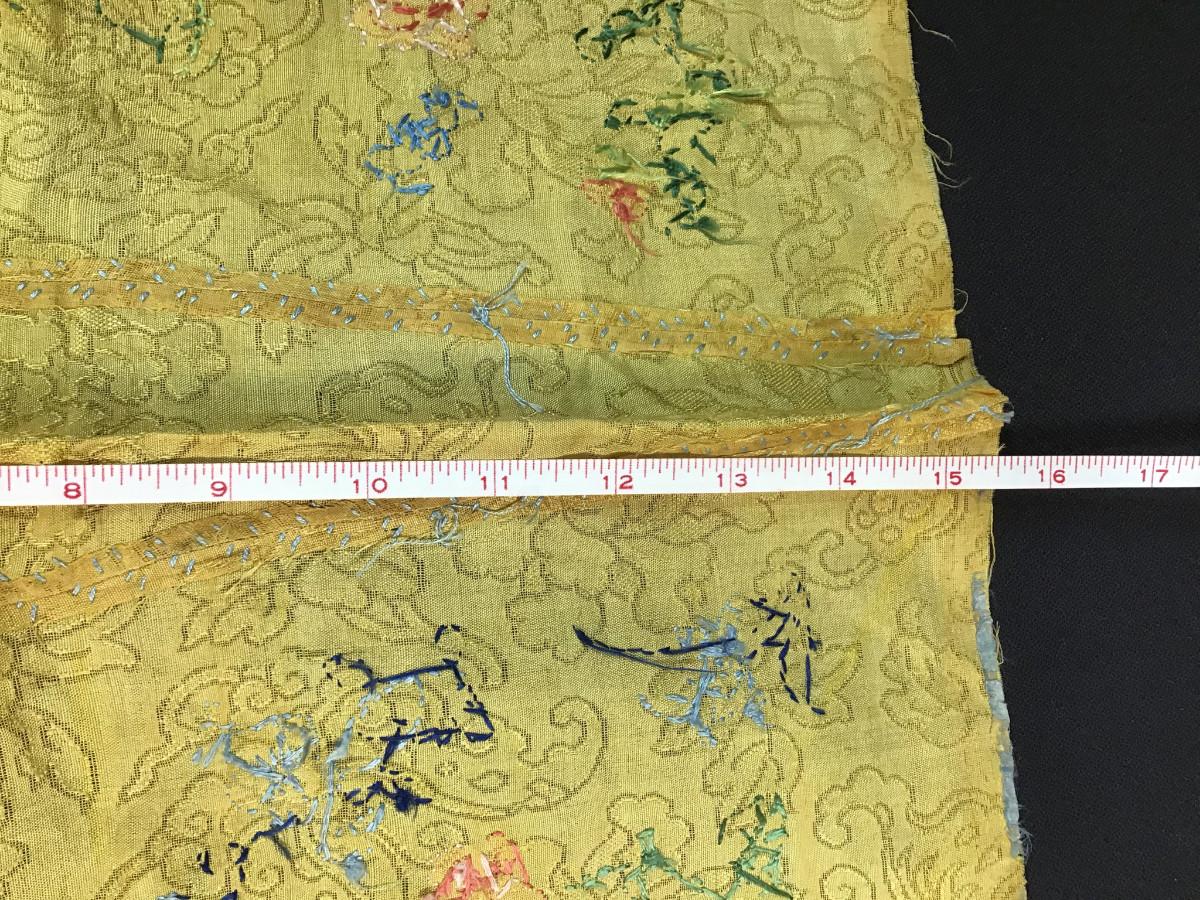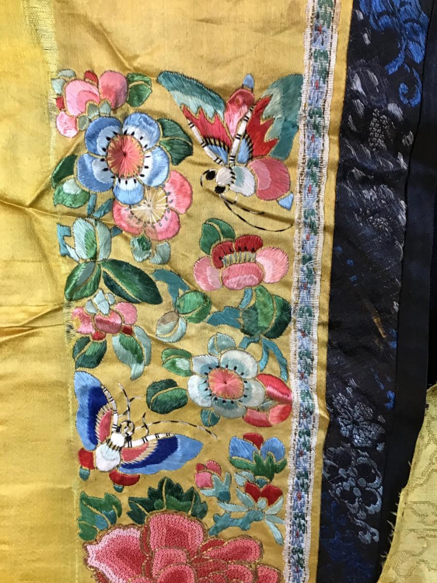 DESCRIPTION: These antique silk fragments include a finely worked embroidered panel detailed with chrysanthemums and butterflies, and a square fragment worked with colorful floral sprays.