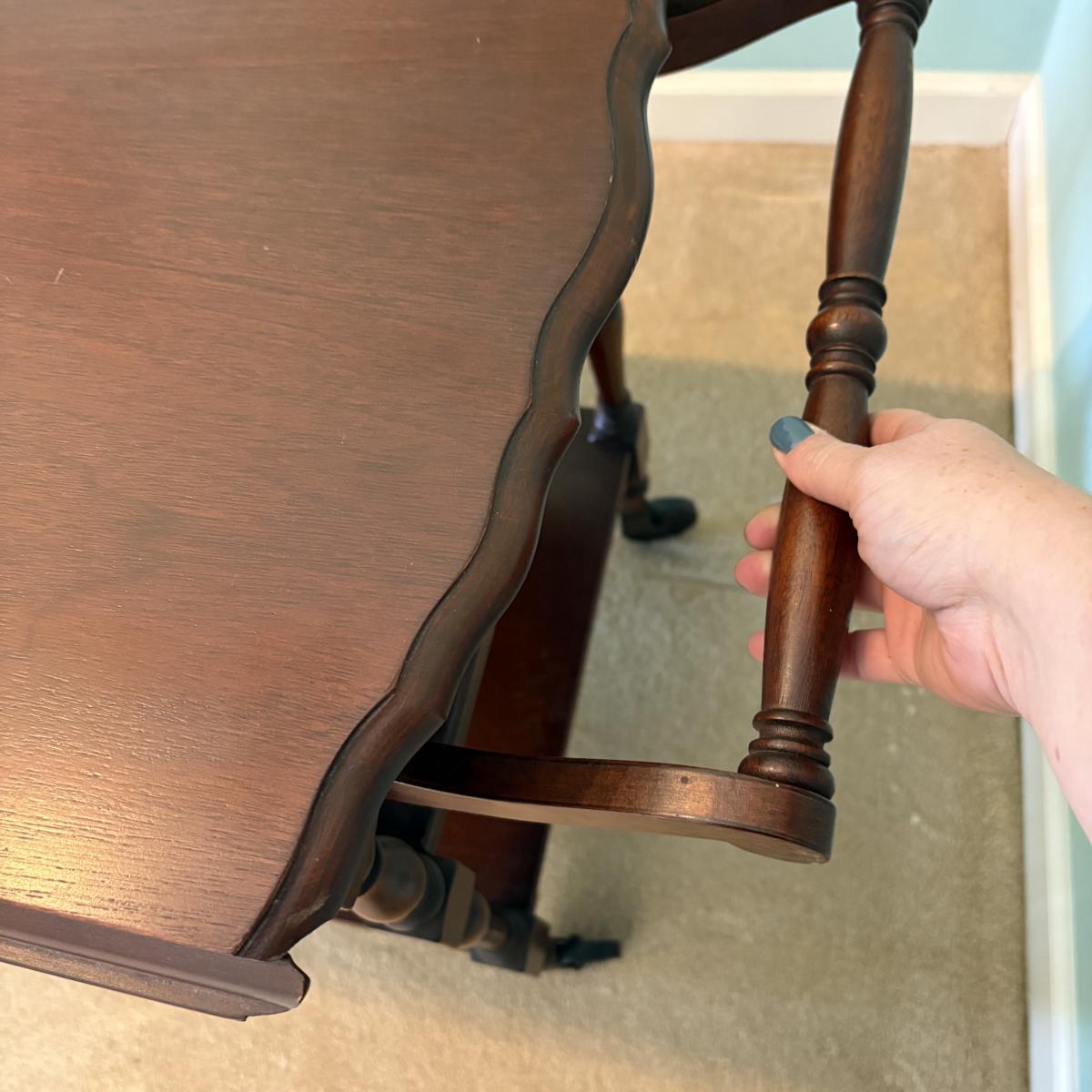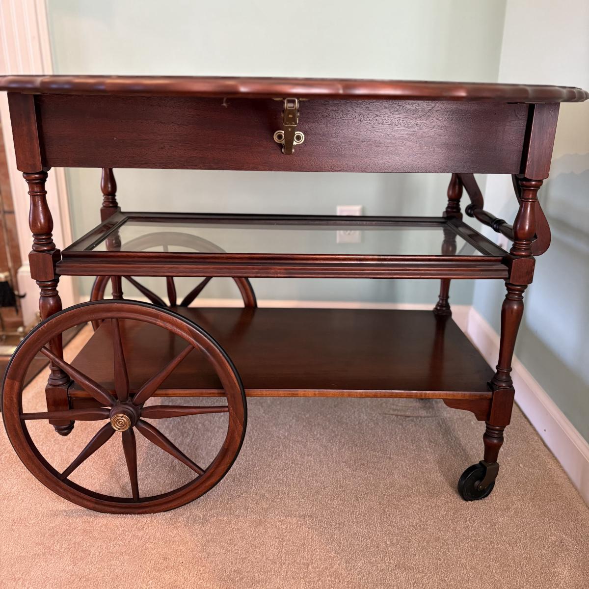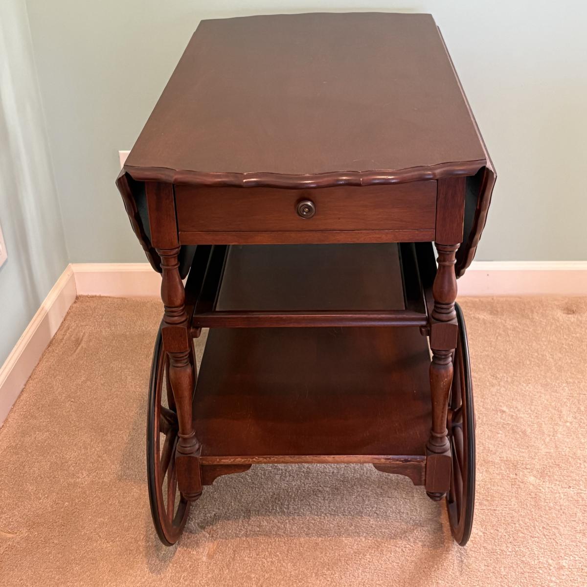 This Imperial rolling tea cart has drop leaves, a shaped edge to the top, single drawer to one end and a pull up handle to the other, lower single shelf, pair of large spoke wheels and small swivel wheels.