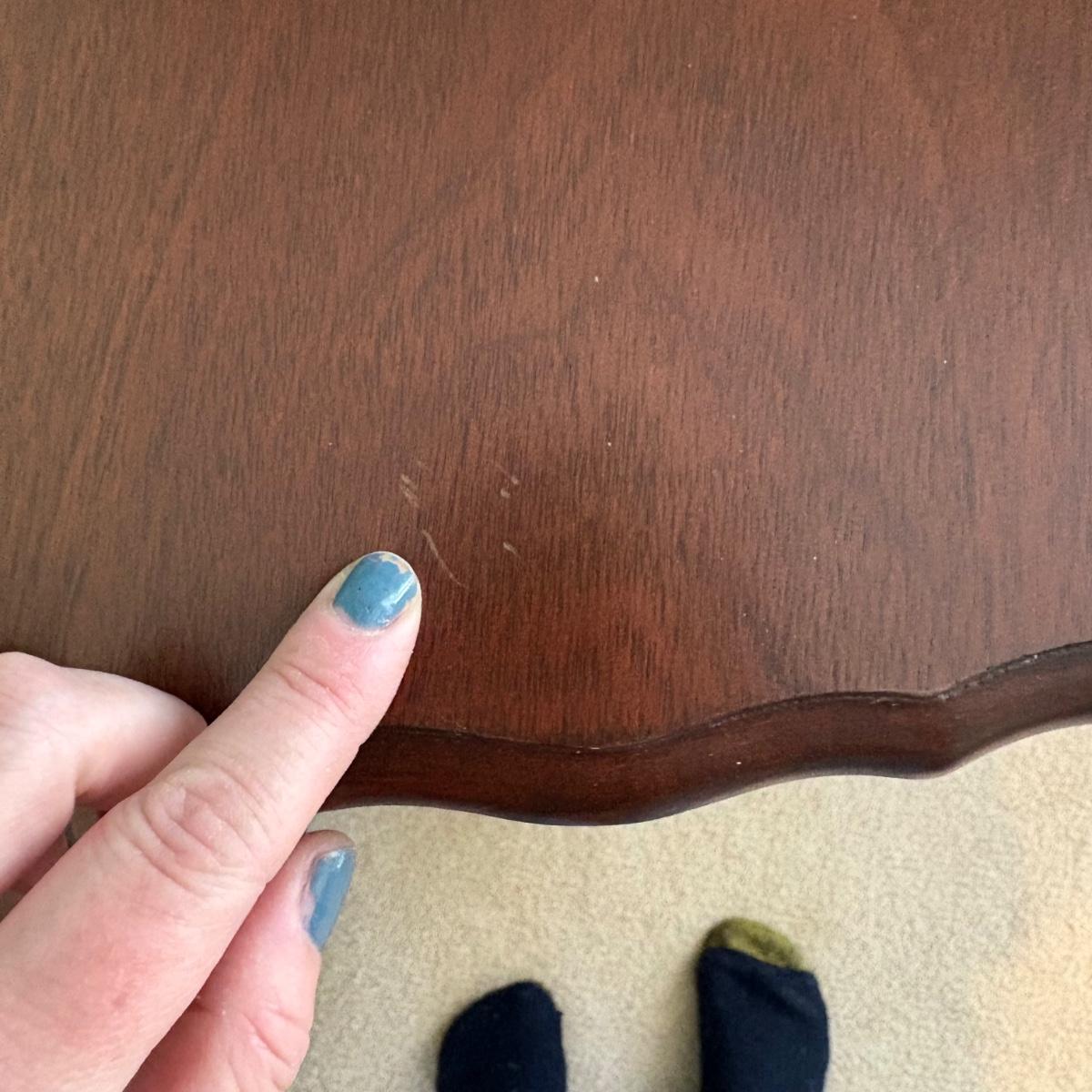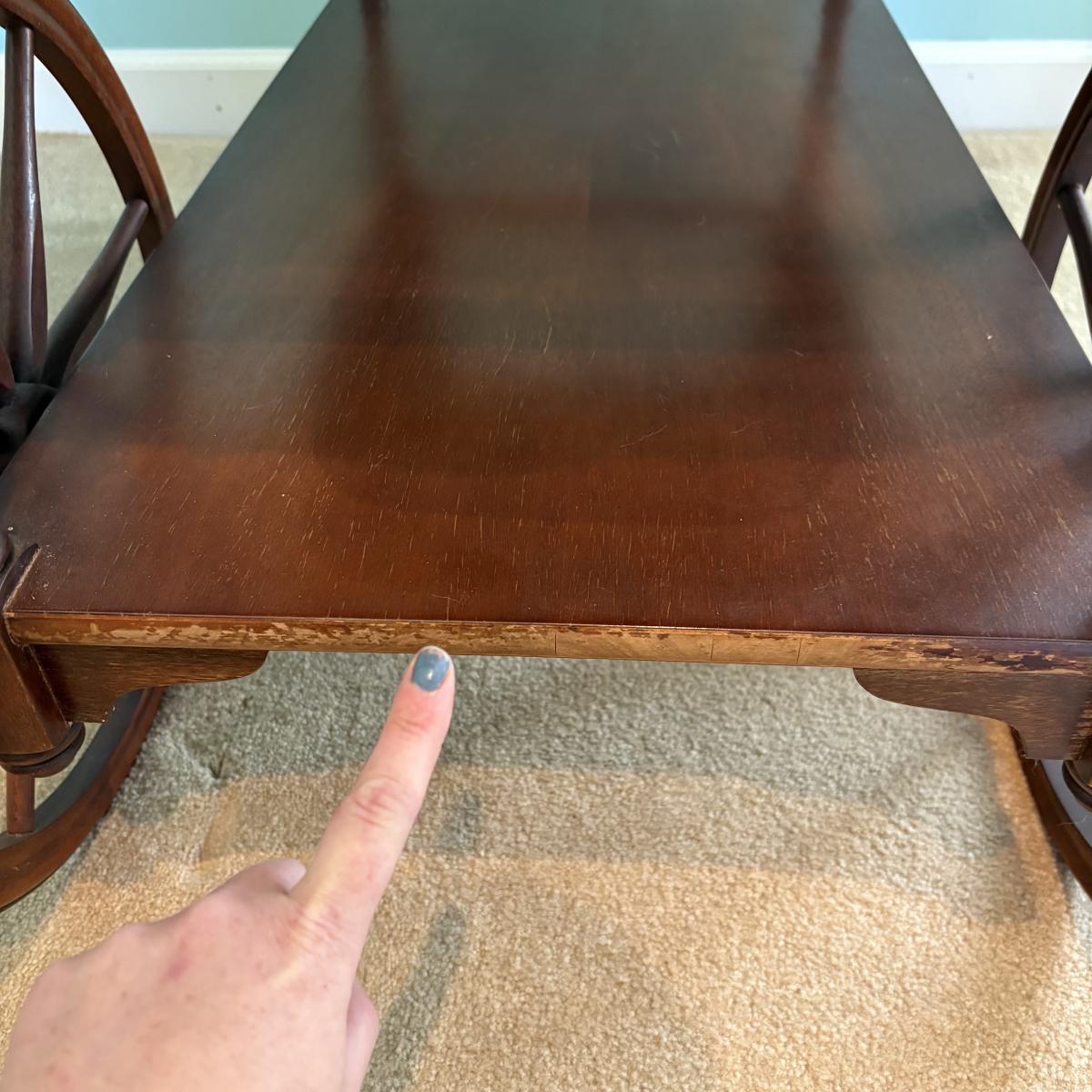 The measurements are approximately 38" x 19" x 29"H. When the drop leaves are extended, the approximate measurements are 43" x 38" x 29"H. There are several blemishes in the wood, see pictures for reference.