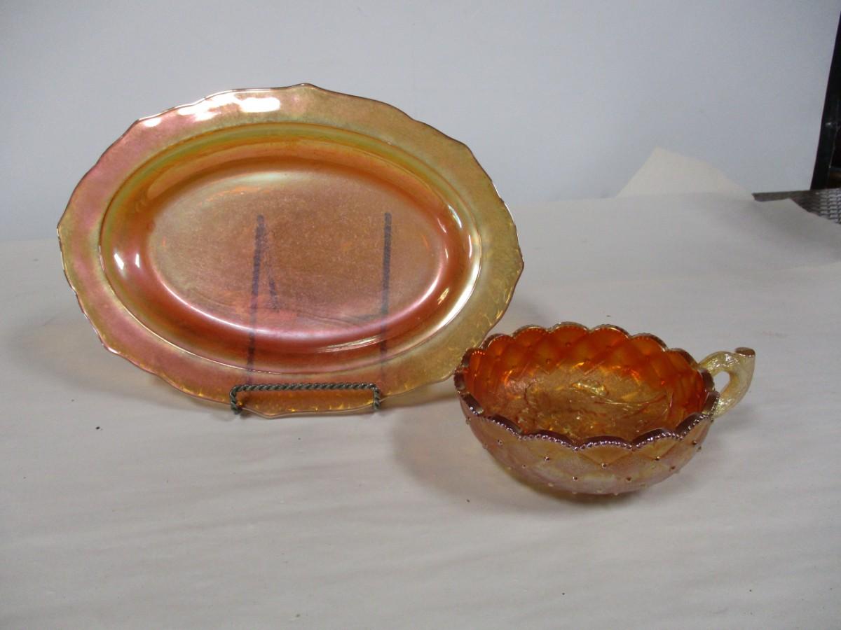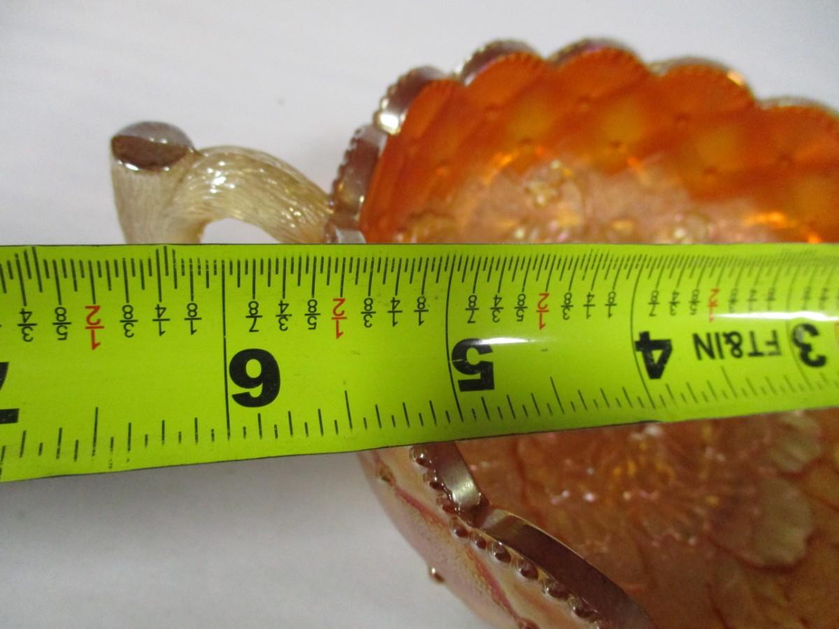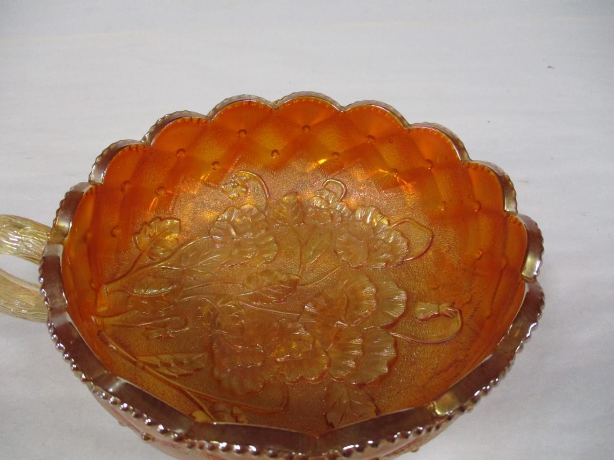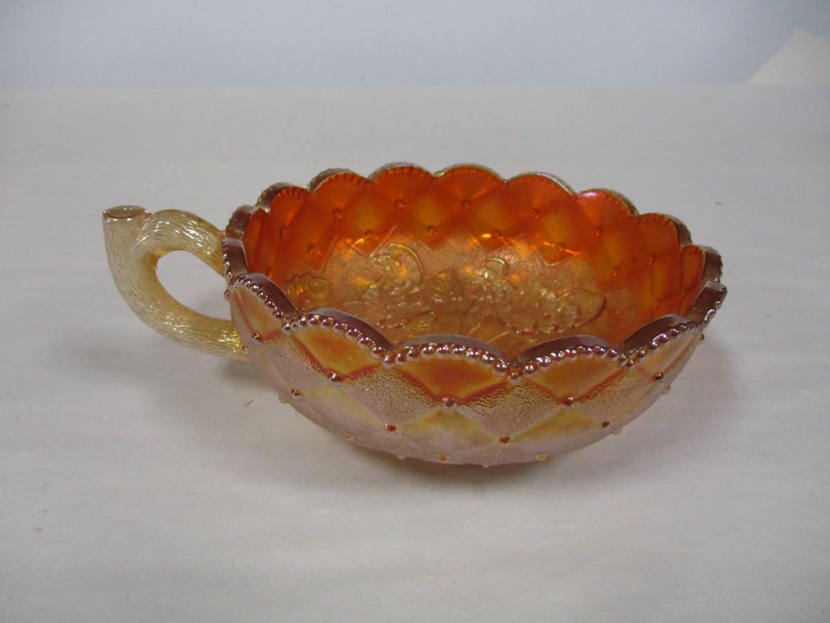 Imperial Marigold Carnival Glass Pansy Diamond Quilted Nappy With Handle