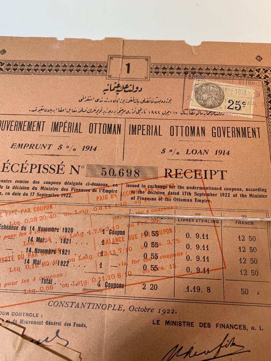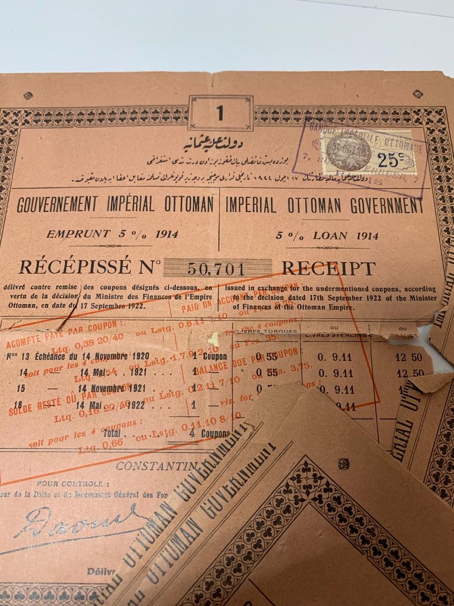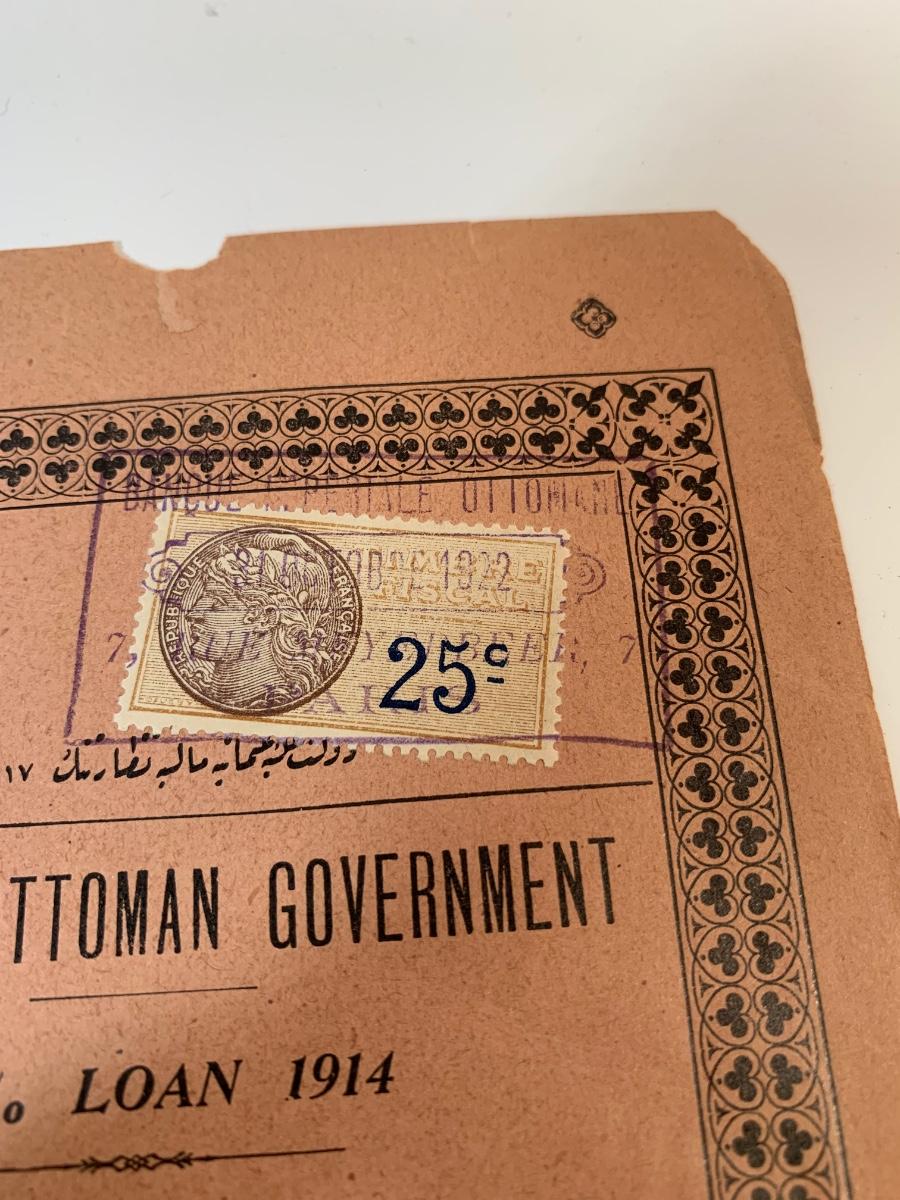 Interesting and very collectible imperial ottoman papers including an imperial otterman bank stamp on the postage stamp
