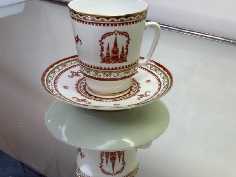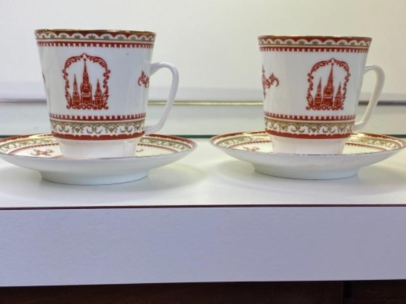 Imperial Russsian USSR Lomonosov Porcelain Pair Tea Cups / Saucers with Palace