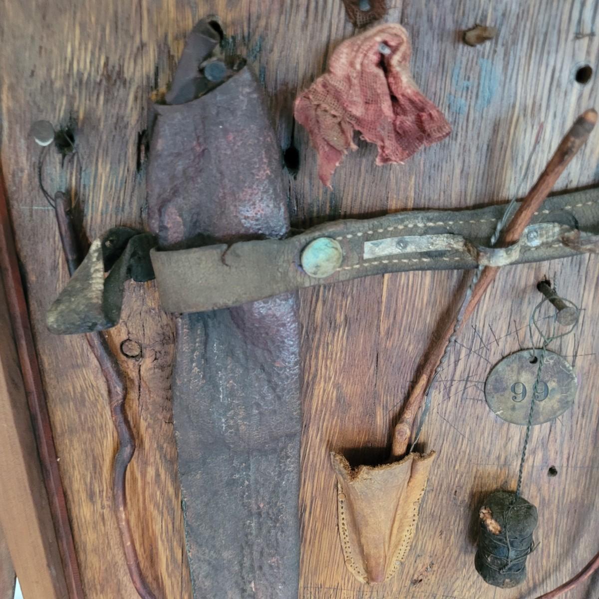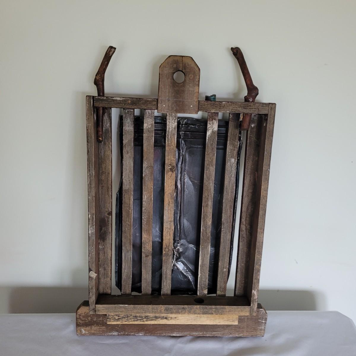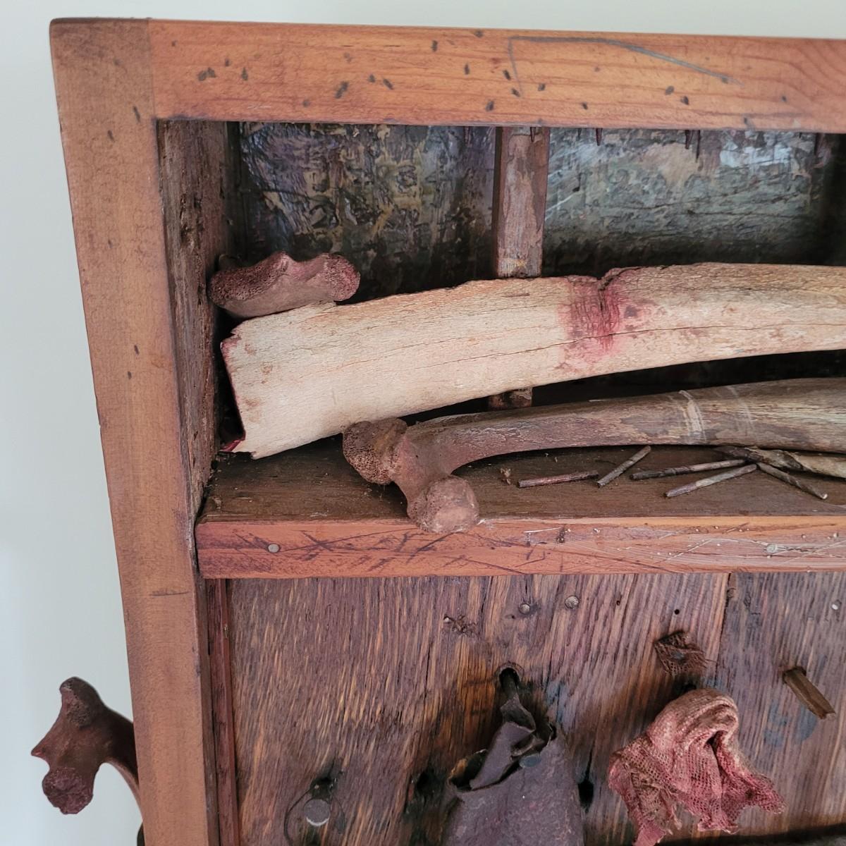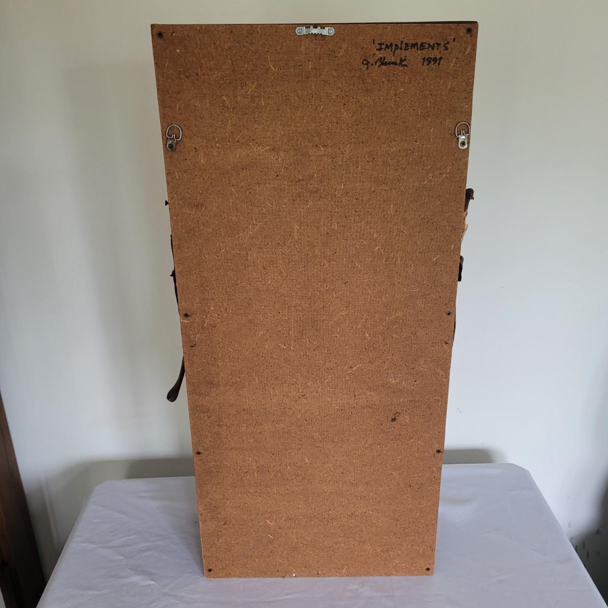 This lot includes two original pieces by Asheville, NC local artist Joyce Blunk. The first piece titled "Implements" is a mixed media piece using many different natural materials. It is built into a large wooden box that measures 13.5" x 6.5" x 30"H. It is titled, signed, and dated by the artist on the backside. The other piece is an untitled original by the same artist. It is also mixed media and measures 15" x 23"H. It is unsigned and untitled.