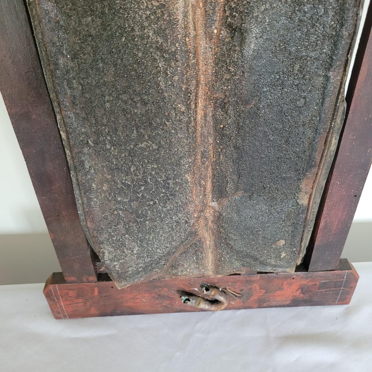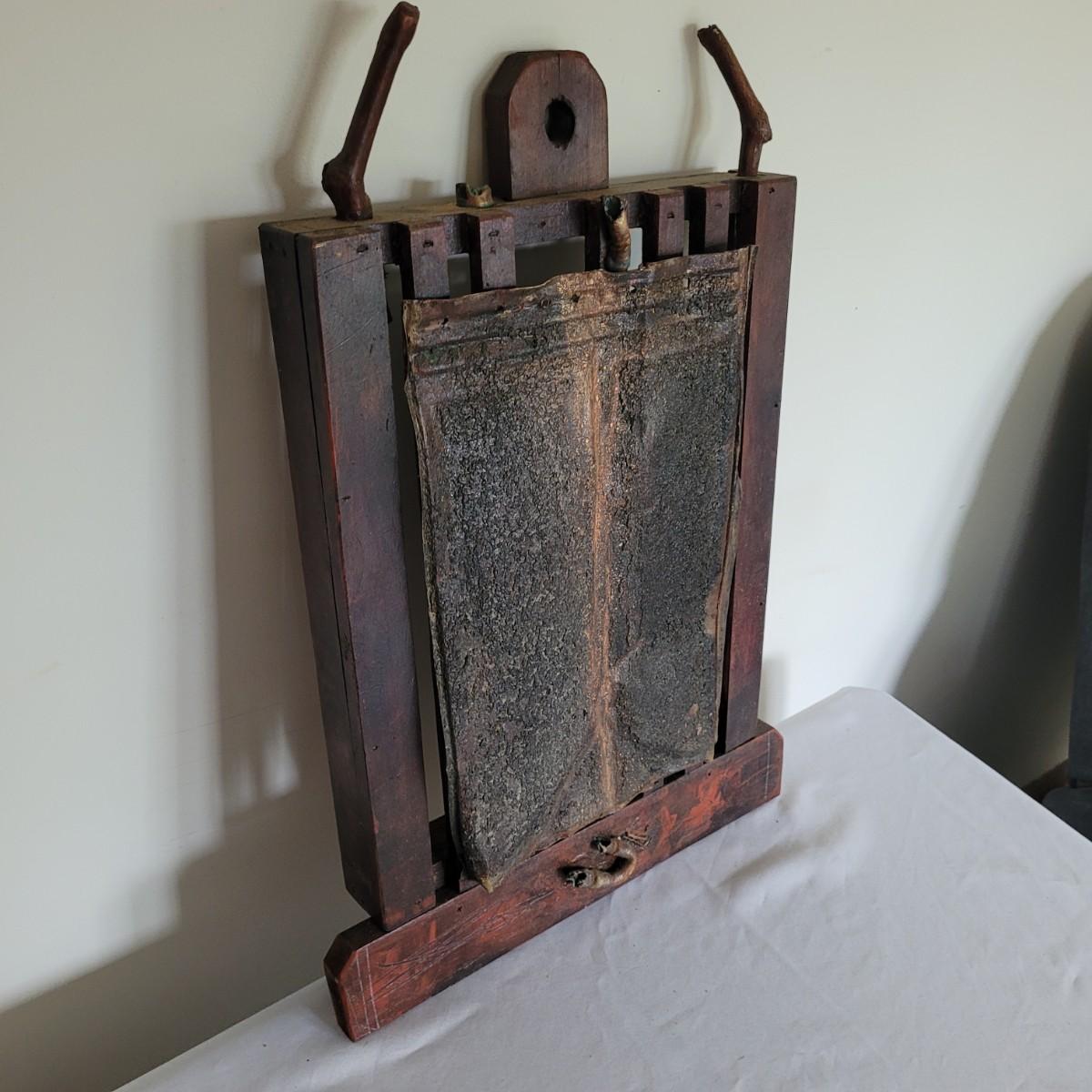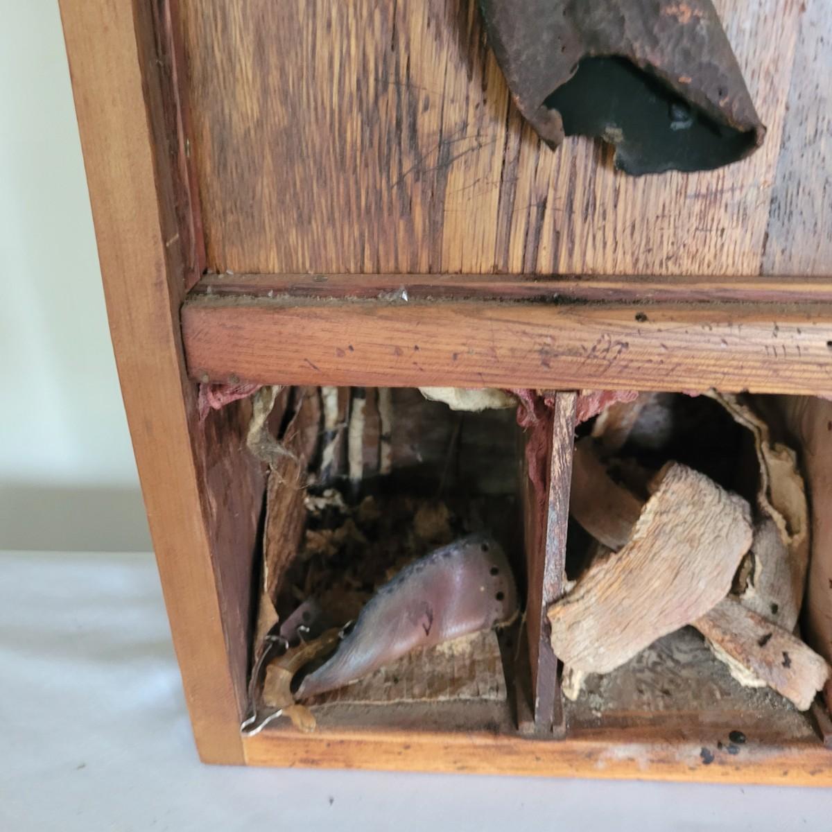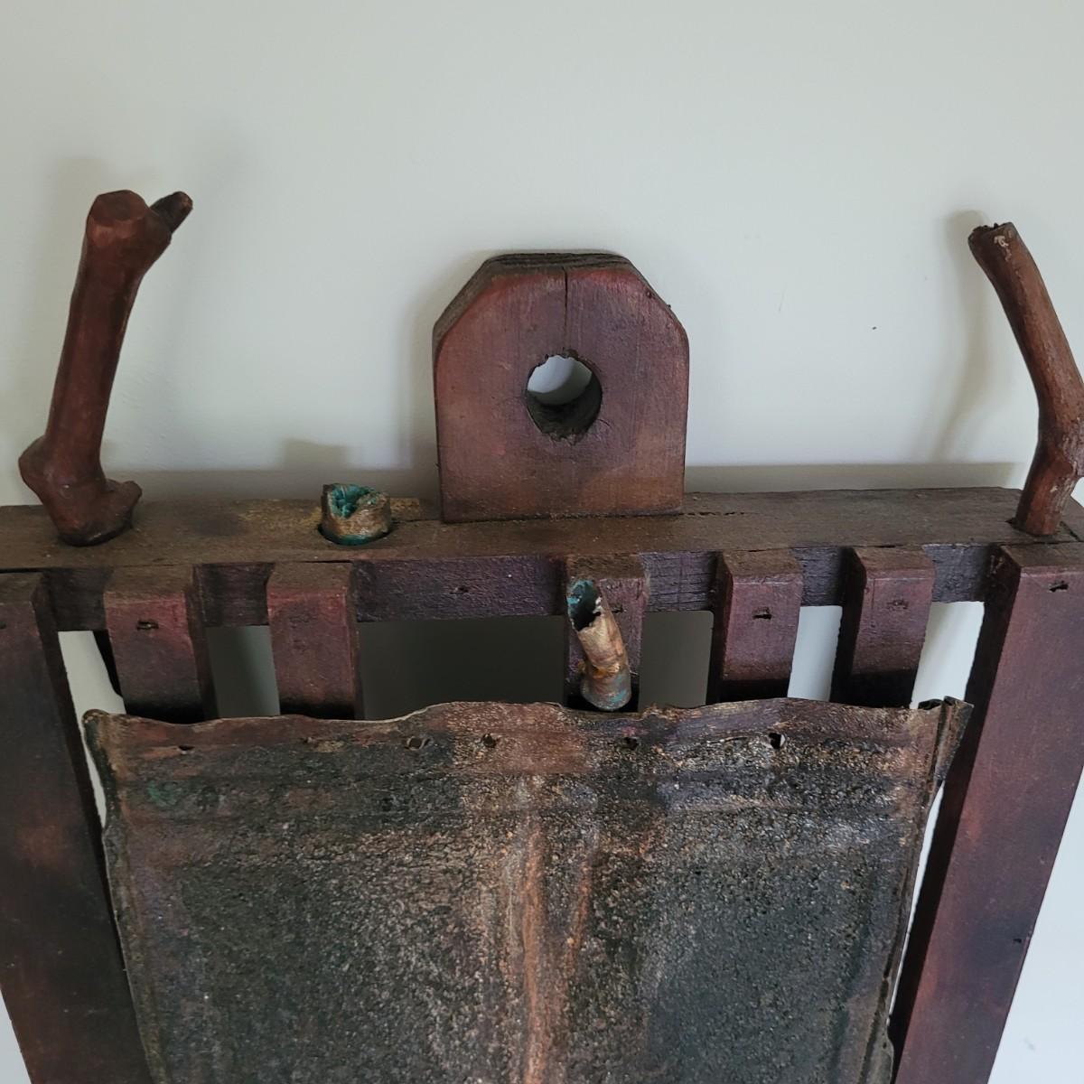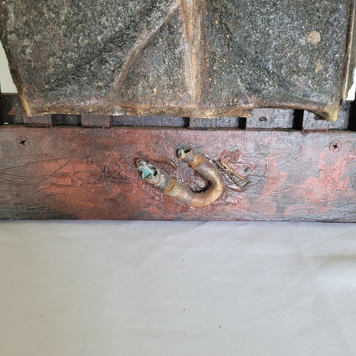 This lot includes two original pieces by Asheville, NC local artist Joyce Blunk. The first piece titled "Implements" is a mixed media piece using many different natural materials. It is built into a large wooden box that measures 13.5" x 6.5" x 30"H. It is titled, signed, and dated by the artist on the backside. The other piece is an untitled original by the same artist. It is also mixed media and measures 15" x 23"H. It is unsigned and untitled.