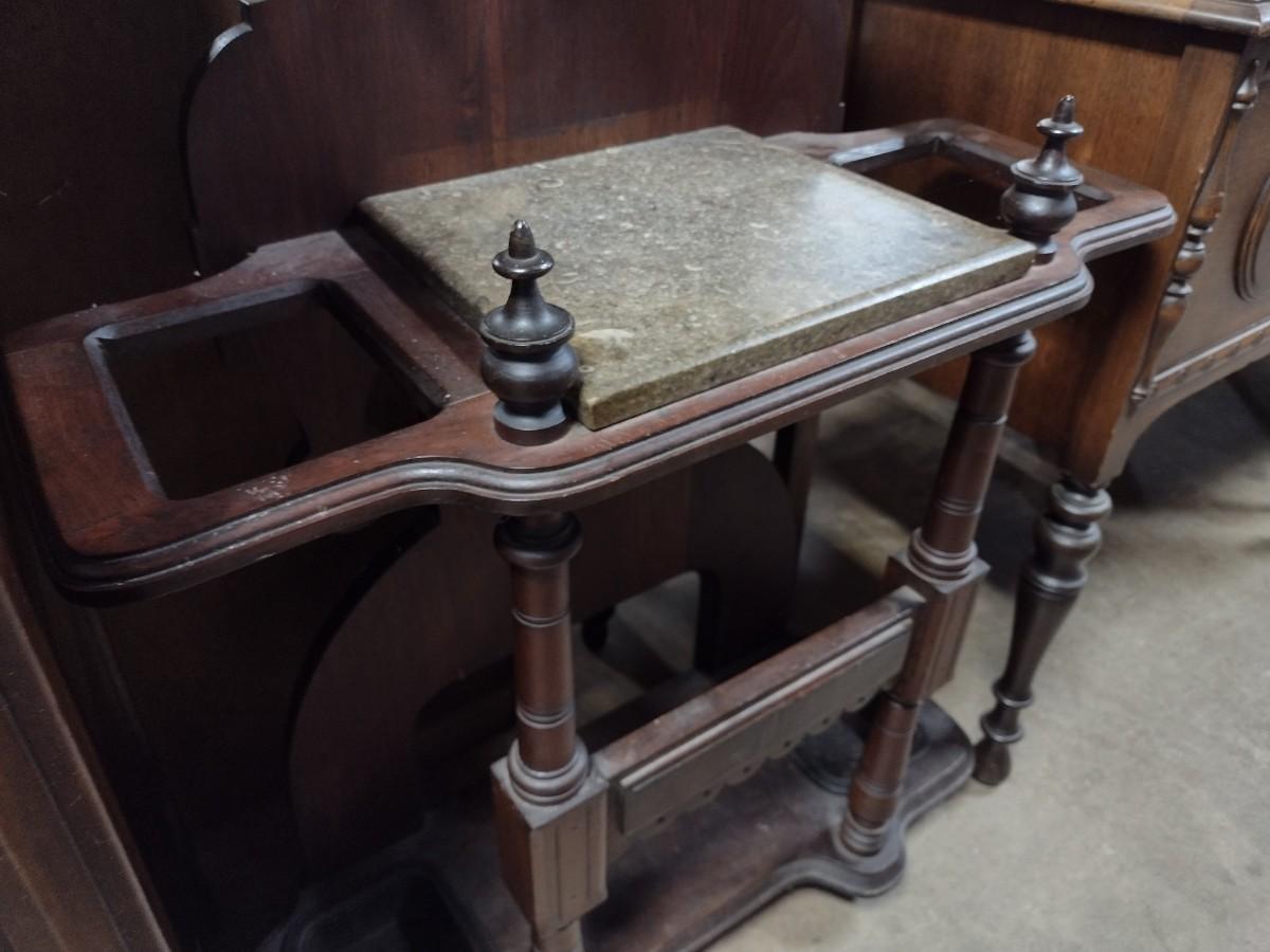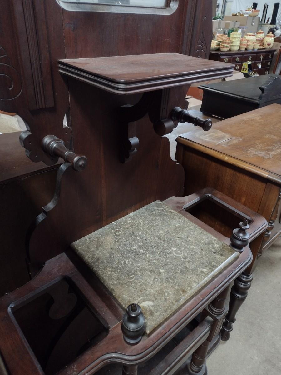 Impressive Antique Hall Tree with Marble Top Shelf and Cast Iron Catch Cups