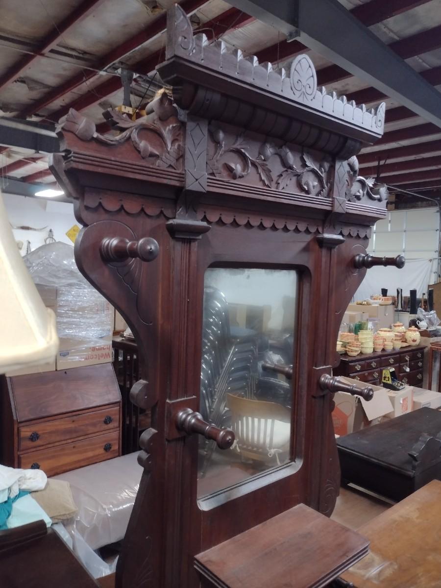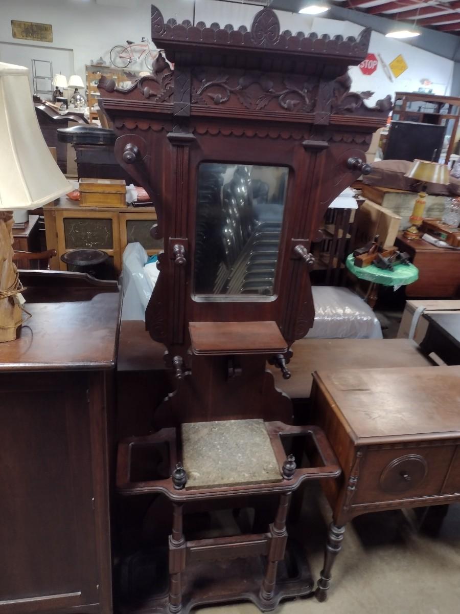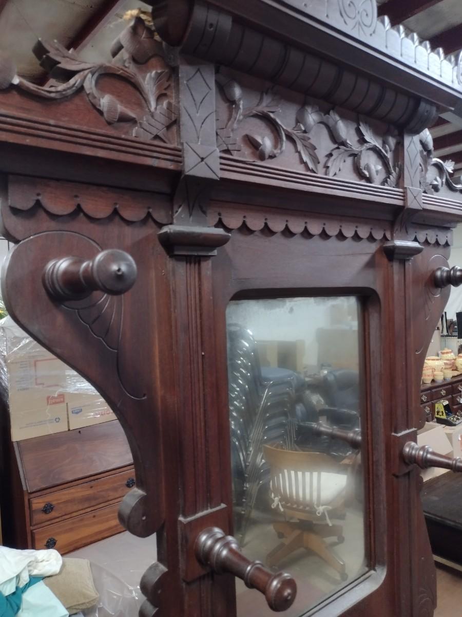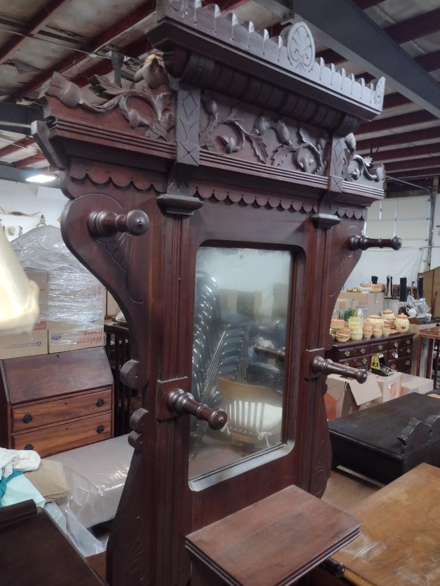 Impressive Antique Hall Tree with Marble Top Shelf and Cast Iron Catch Cups has a small separation at joint around the mirror as shown