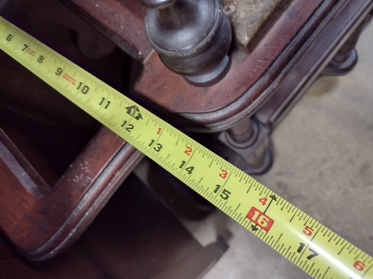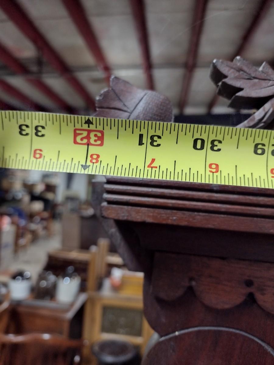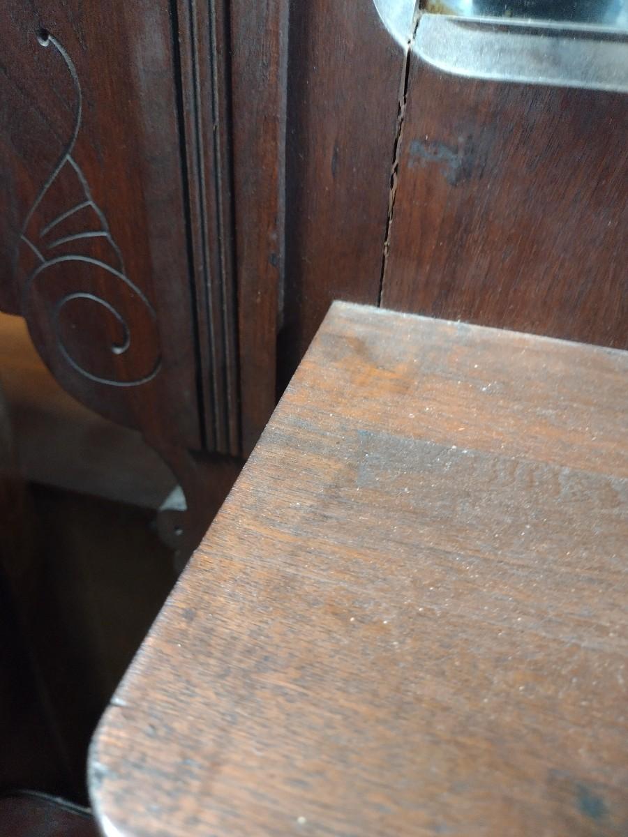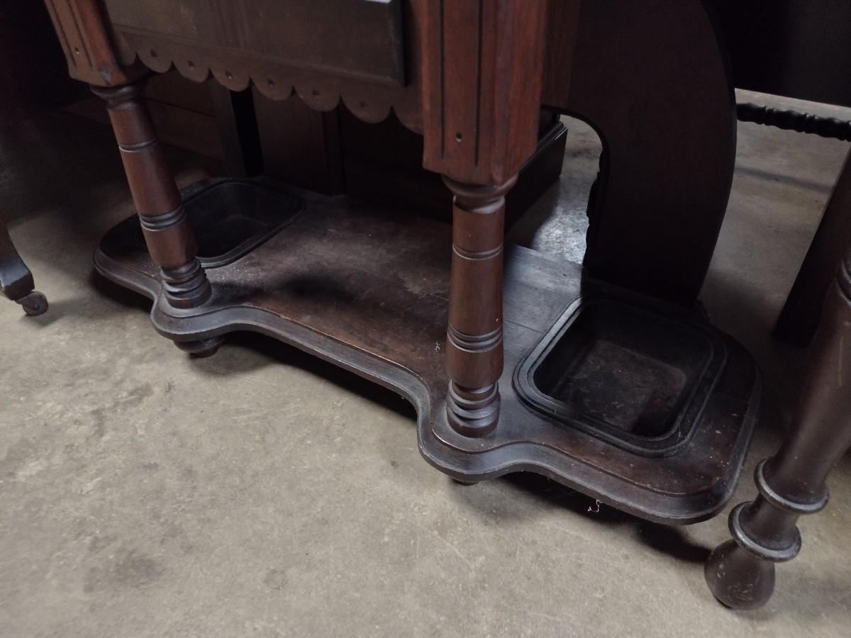 Impressive Antique Hall Tree with Marble Top Shelf and Cast Iron Catch Cups has a small separation at joint around the mirror as shown