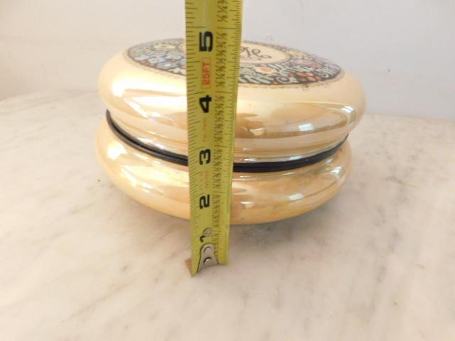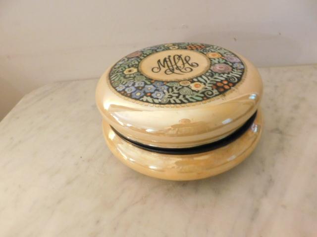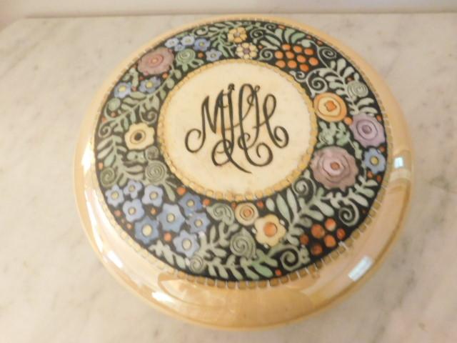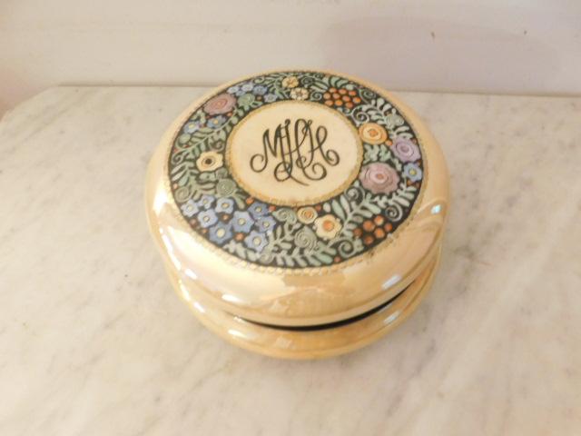 Impressive Antique Limoges Luster Finish Ceramic Powder Dish has monogram on lid and personally inscribed on bottom as shown