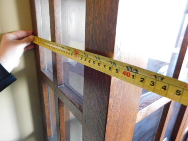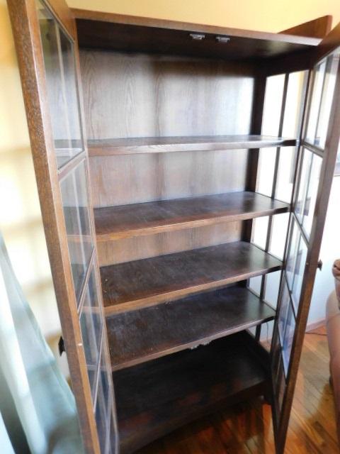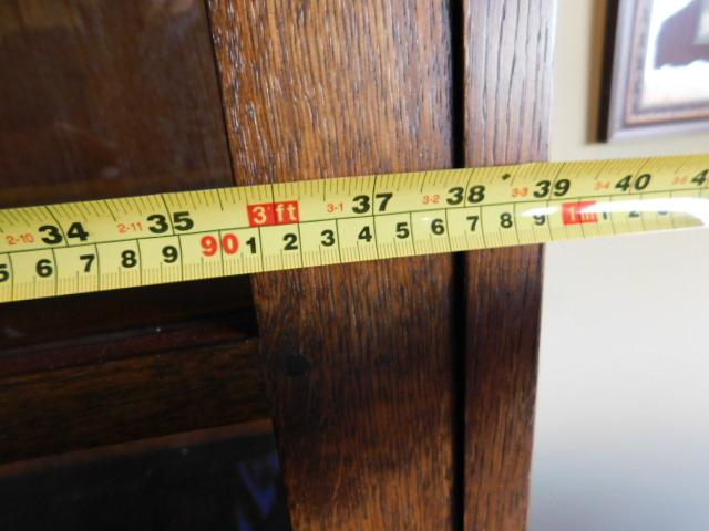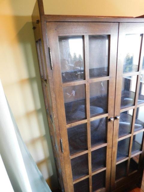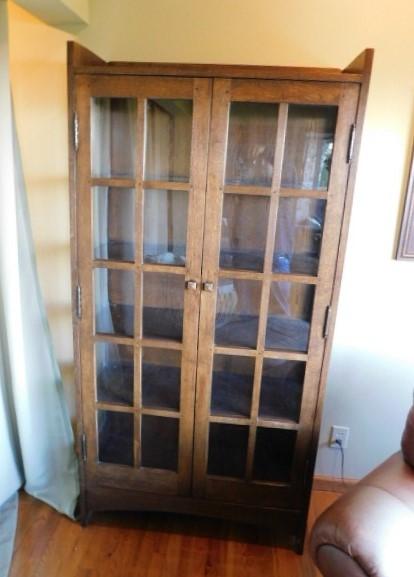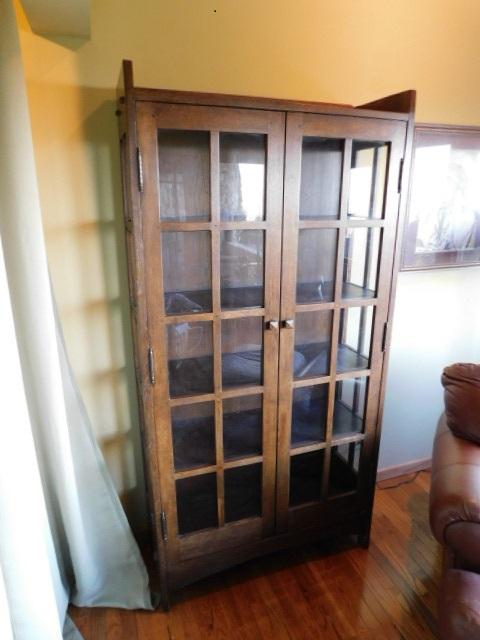 Impressive Oak Arts and Crafts Double Door Shelved Cabinet 39"x15"x78" expect some wear of scratches. This cabinet has sharp lines, solid fretting, and good size.