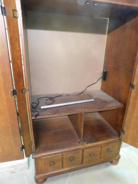Impressive Oak Arts and Crafts Armoire Entertainment Cabinet 44"x25"x77" very elegant item despite its size could easily be made into clothing armoire with the included hanger rack brackets. Your imagination could do even more to enhance its hidden uses.