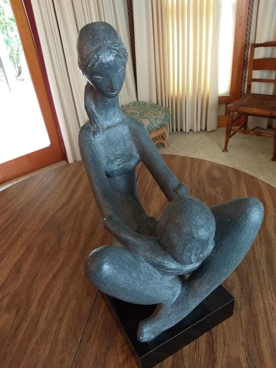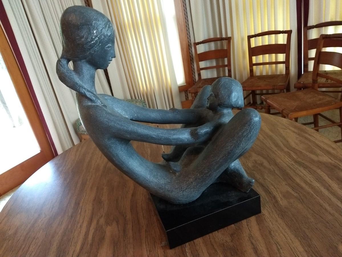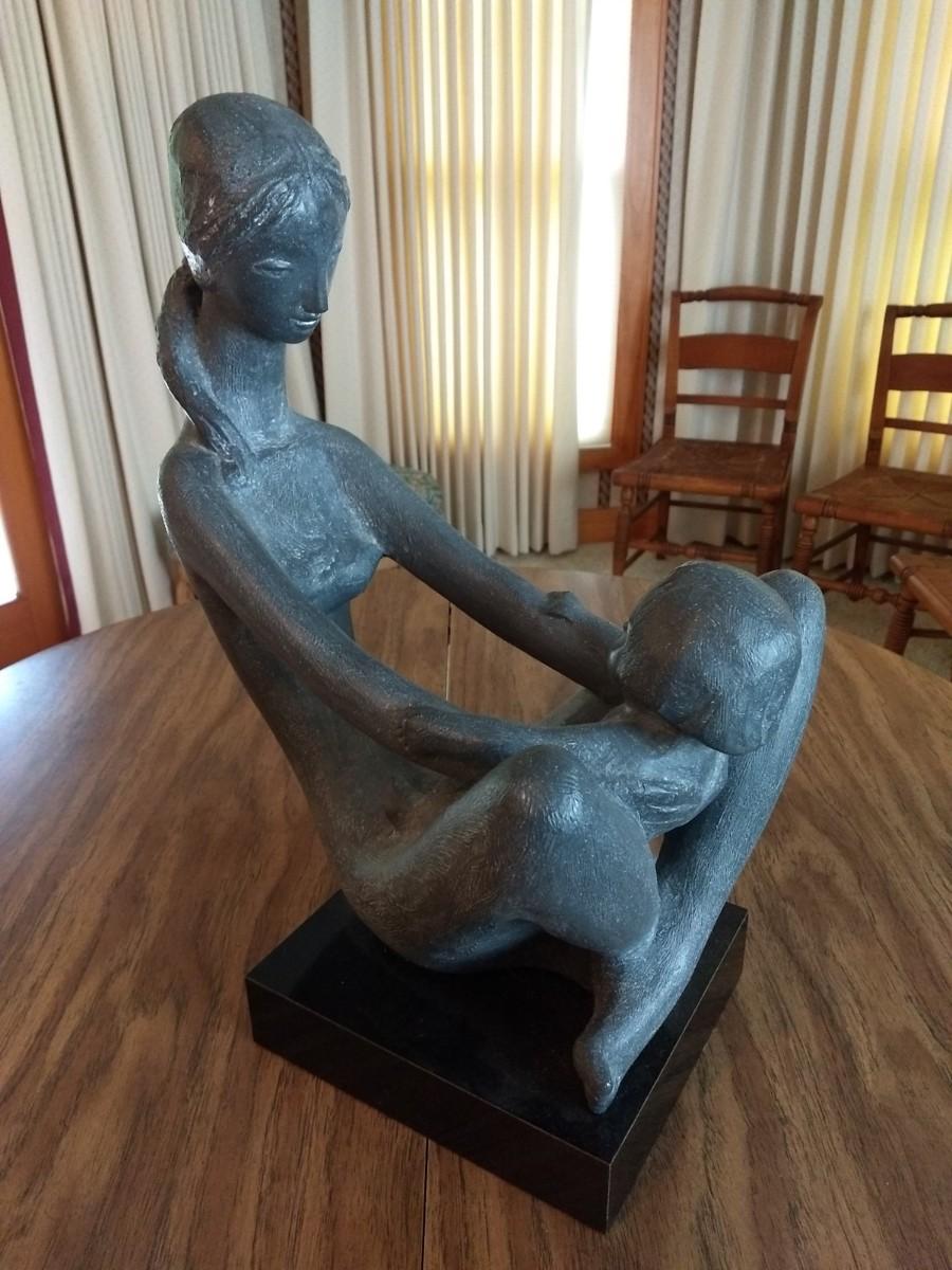 Impressive Sculpture of Mother and Daughter on Wood Base