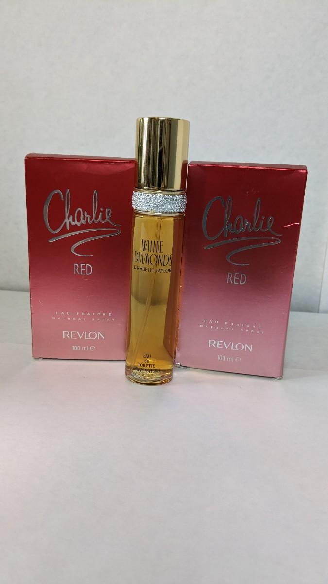 2 full bottles- both in box- of Charlie Red and a brand new bottle of White Diamonds ladies perfume.