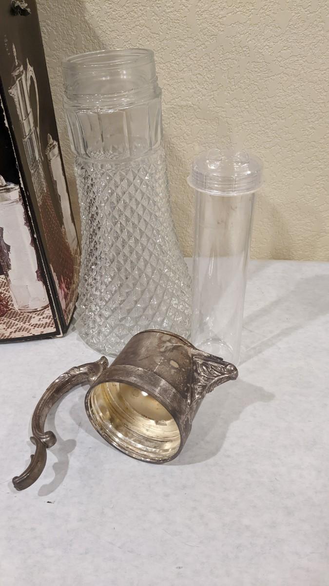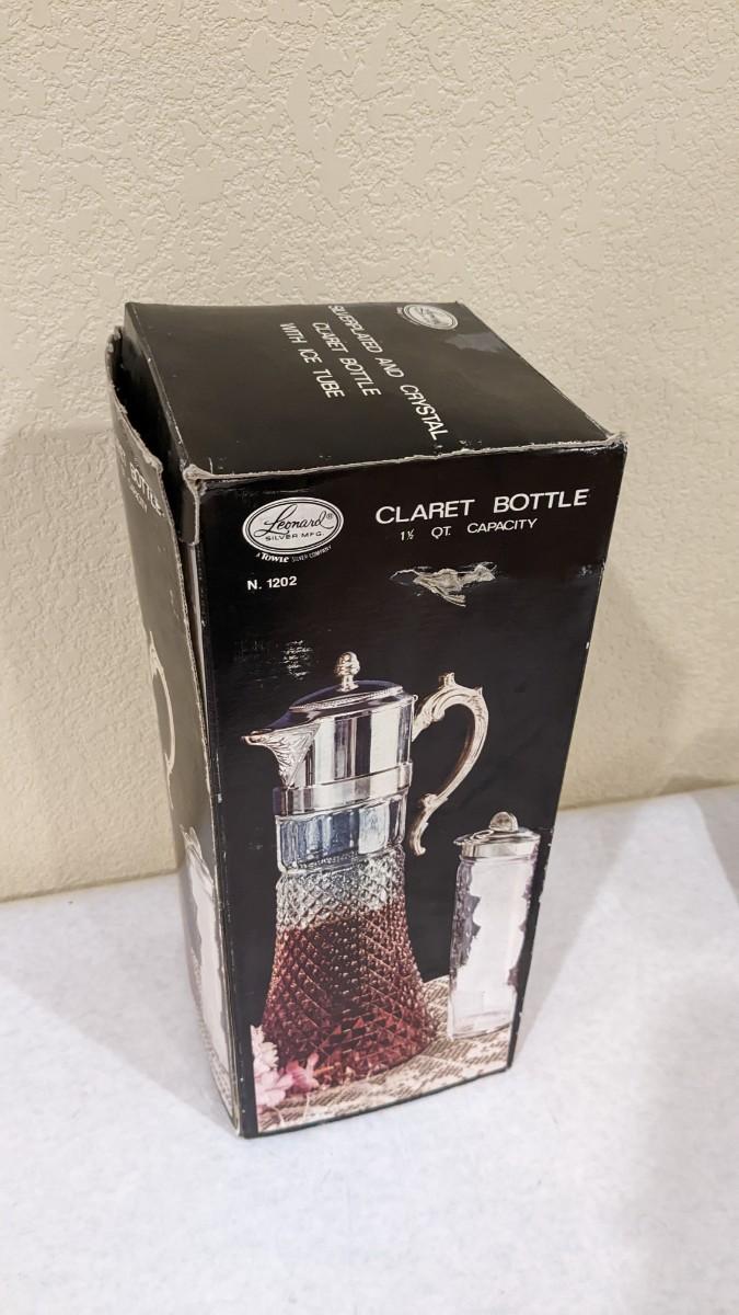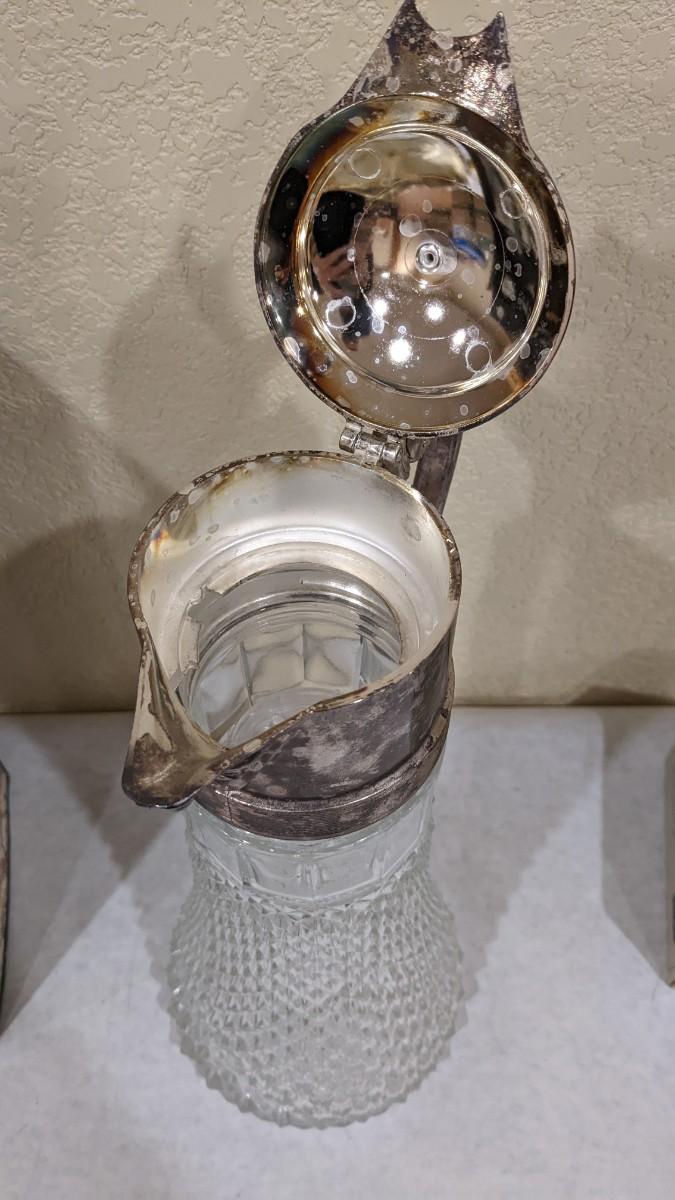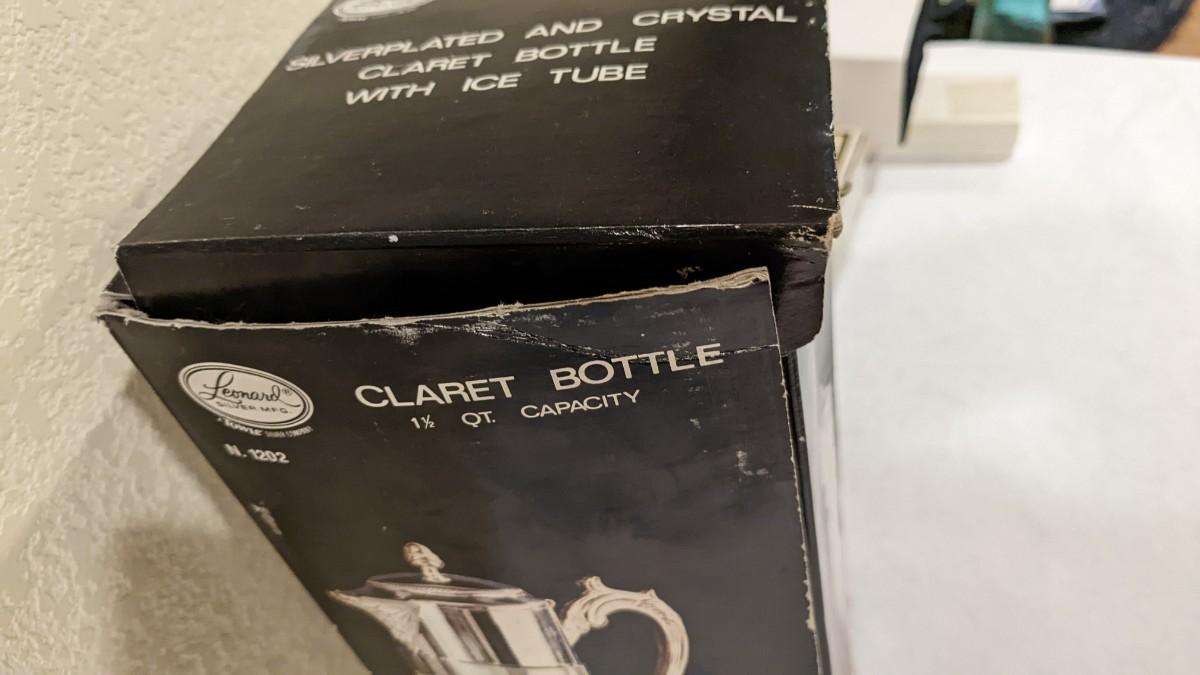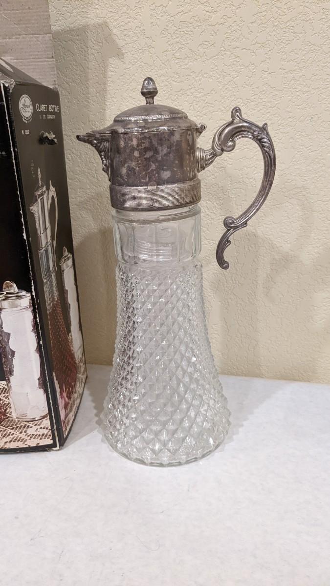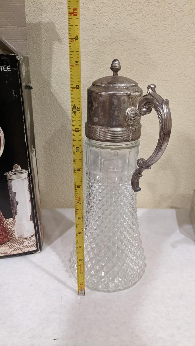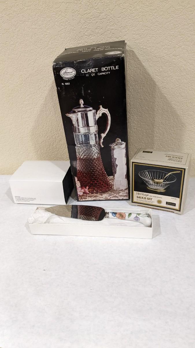 includes beautiful Leonard Silver Claret with patina, Fostoria lead crystal dish with original spoon in package, Sheffield England porcelain handle cake server, and Nieman Marcus silver plate "Sky Shakers" that show some discoloration. All pieces are in great shape outside of noted wear.