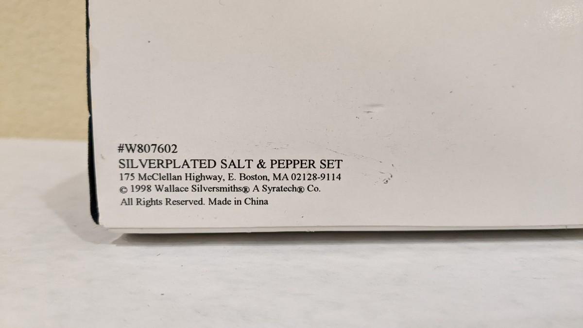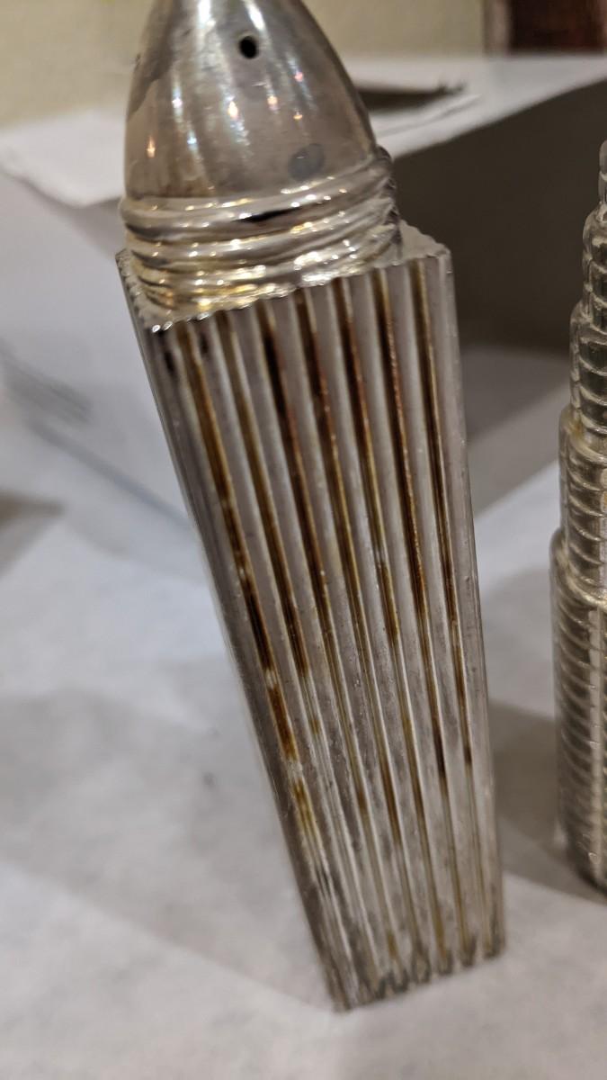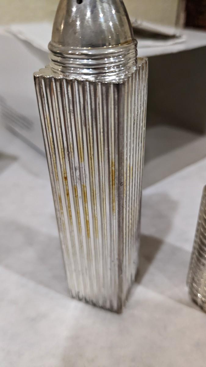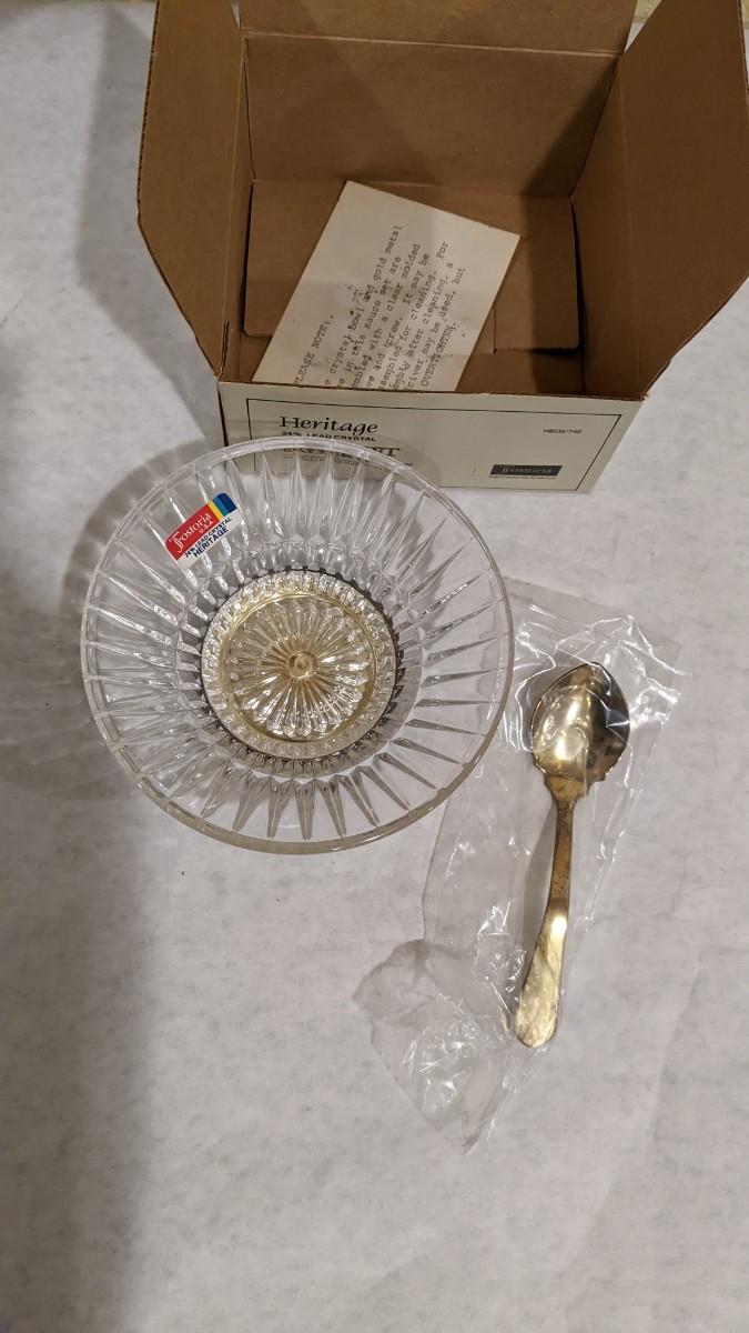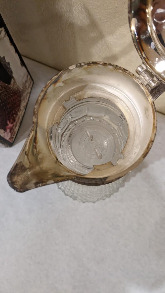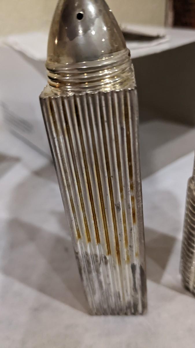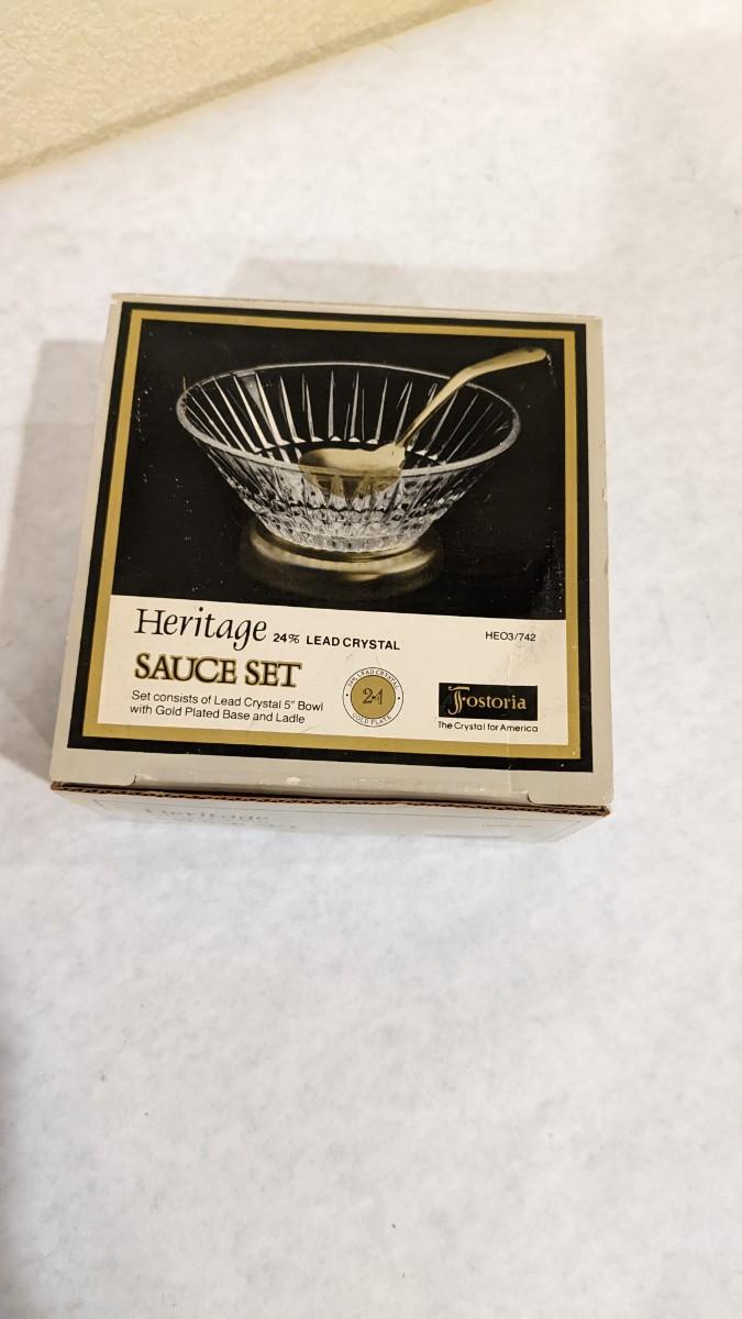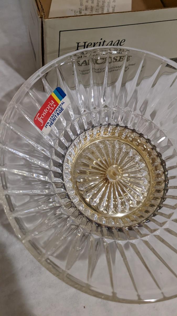 includes beautiful Leonard Silver Claret with patina, Fostoria lead crystal dish with original spoon in package, Sheffield England porcelain handle cake server, and Nieman Marcus silver plate "Sky Shakers" that show some discoloration. All pieces are in great shape outside of noted wear.