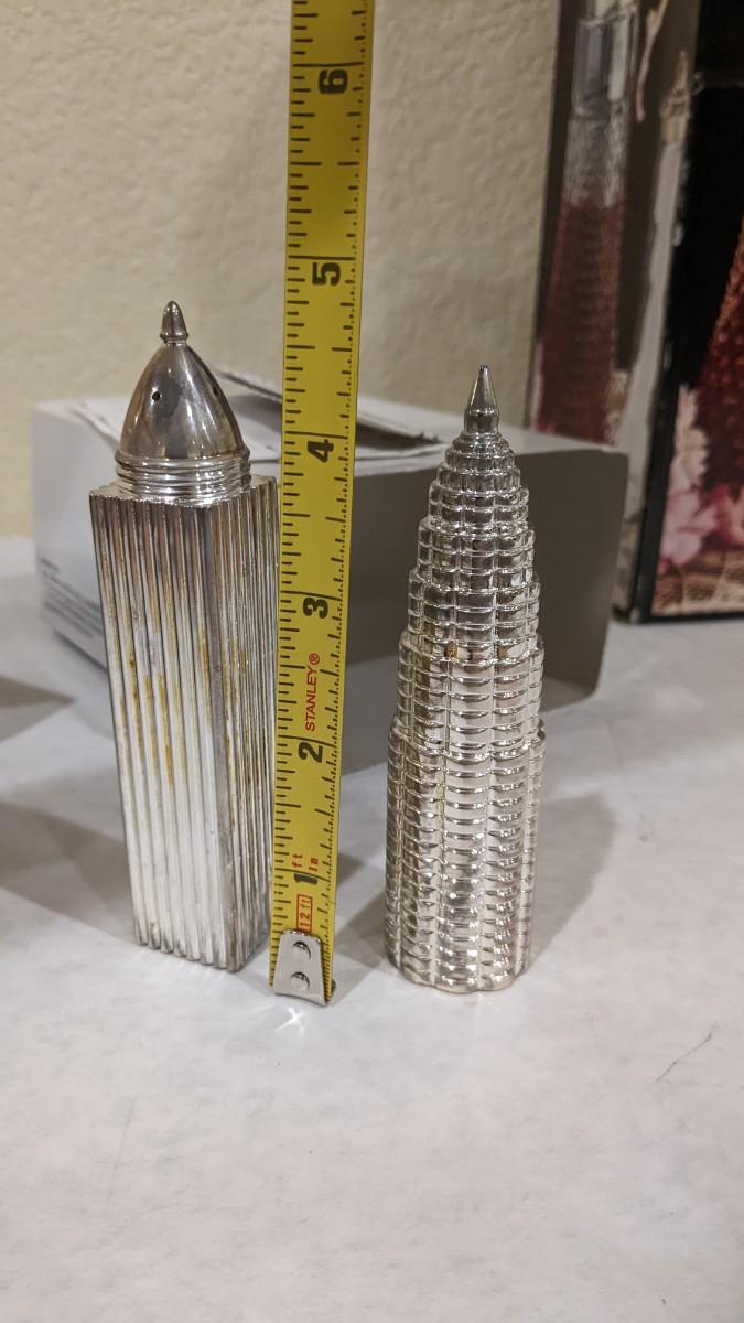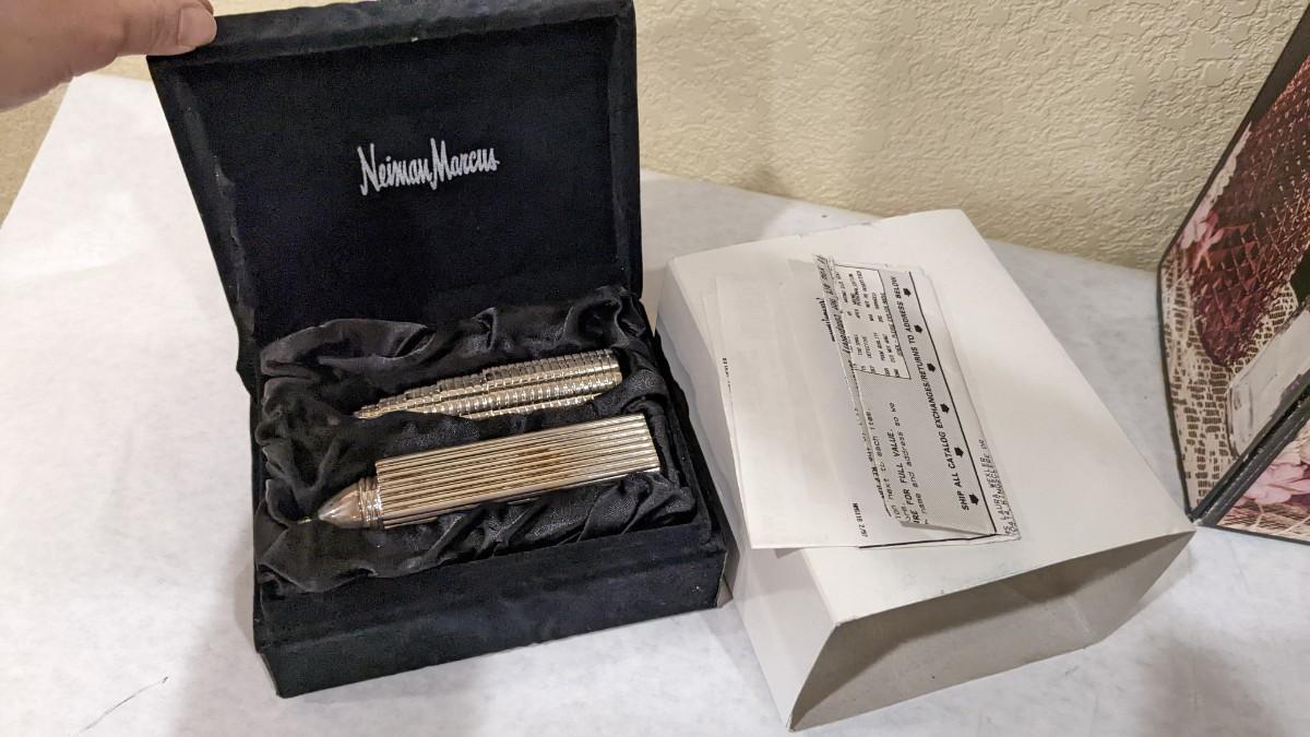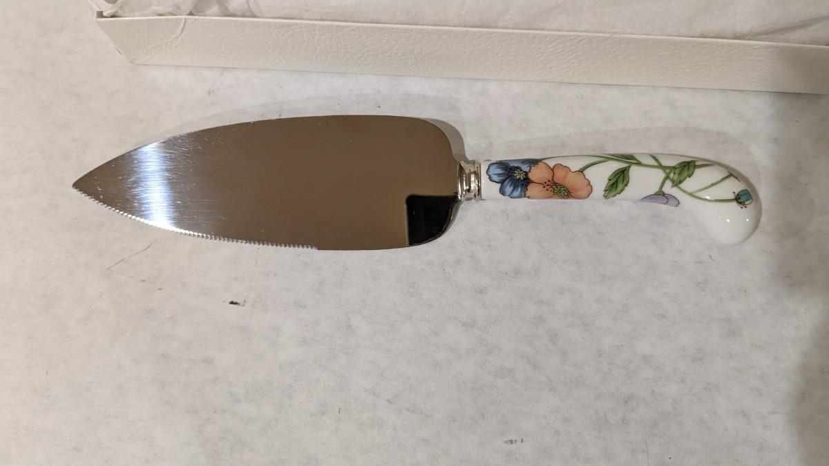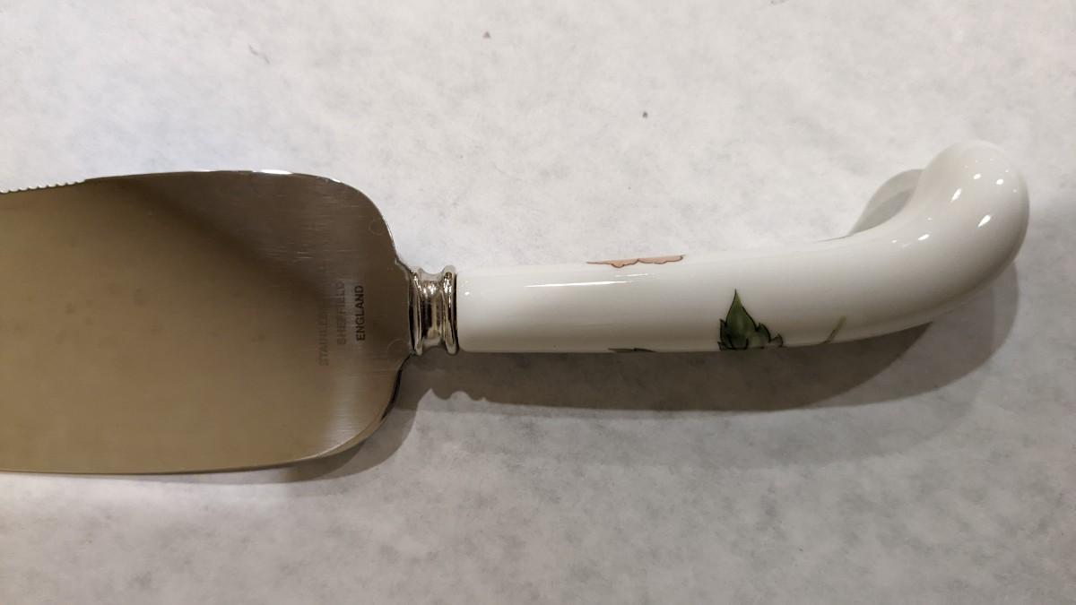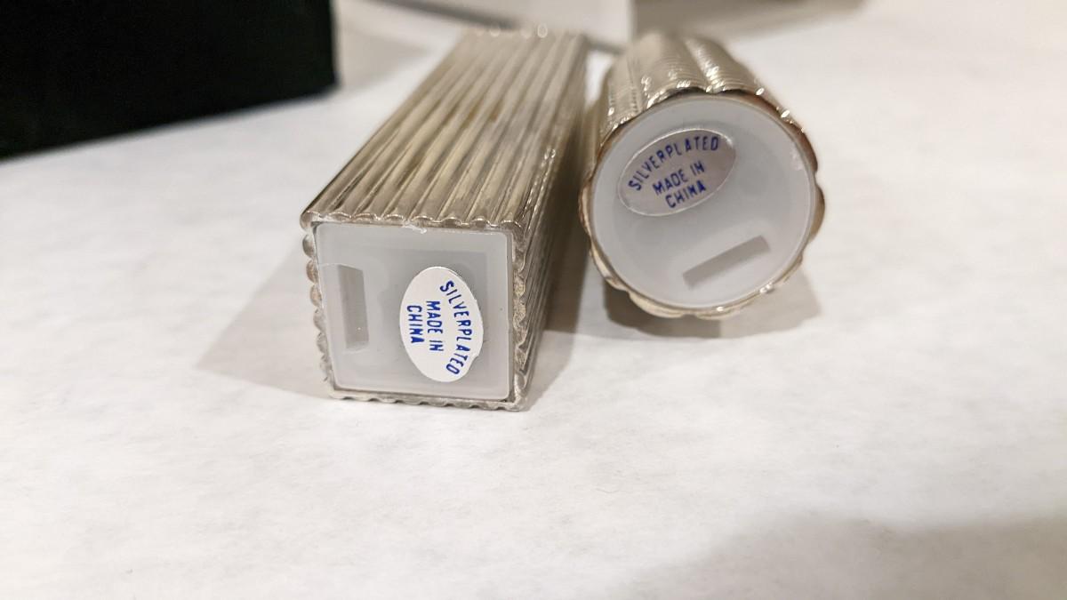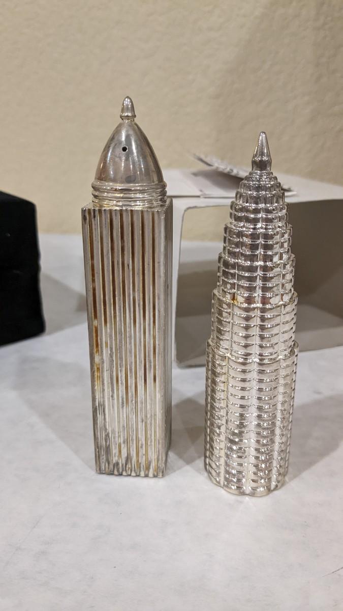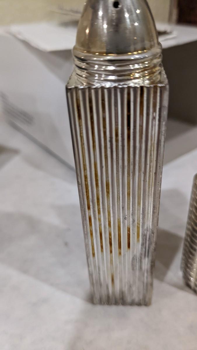 includes beautiful Leonard Silver Claret with patina, Fostoria lead crystal dish with original spoon in package, Sheffield England porcelain handle cake server, and Nieman Marcus silver plate "Sky Shakers" that show some discoloration. All pieces are in great shape outside of noted wear.