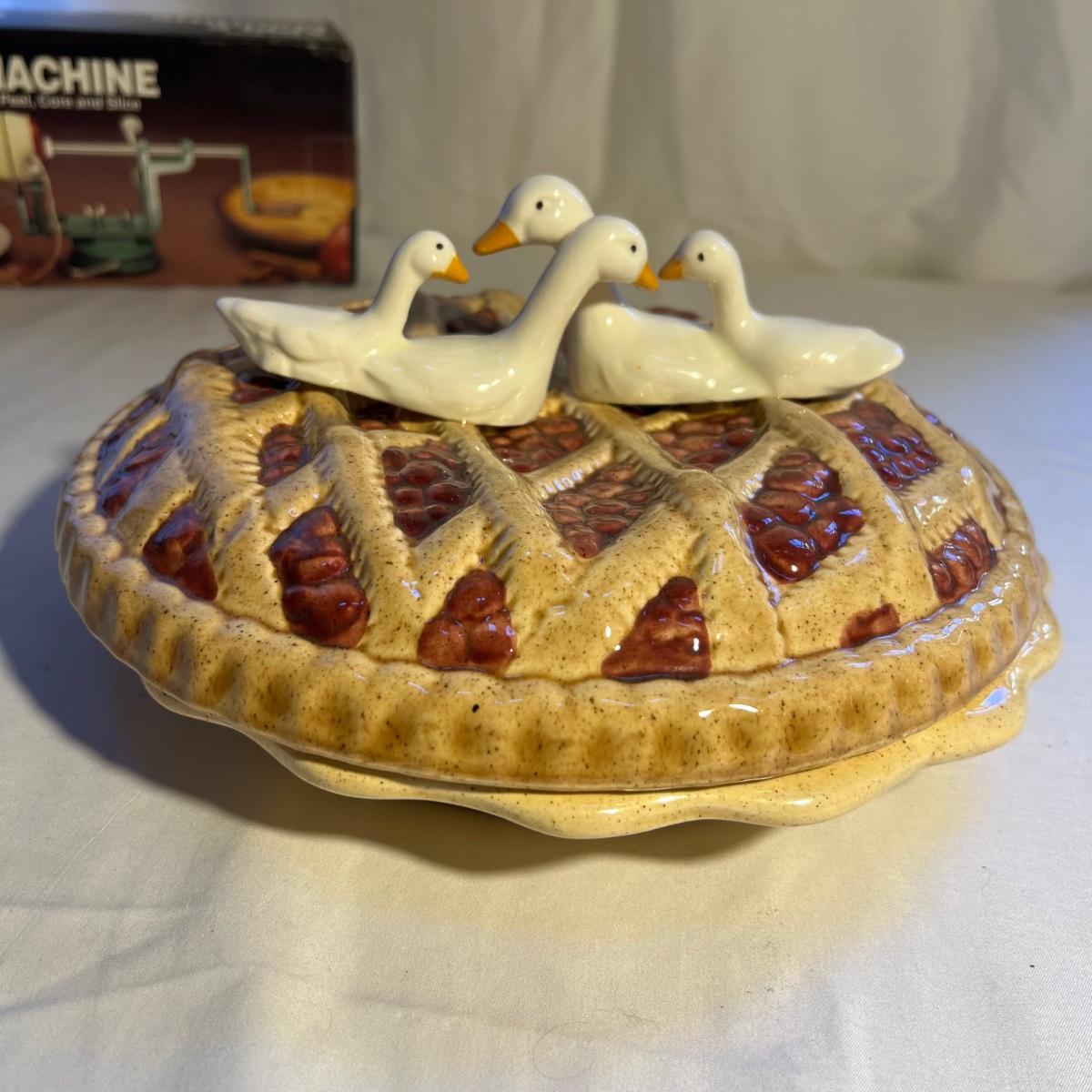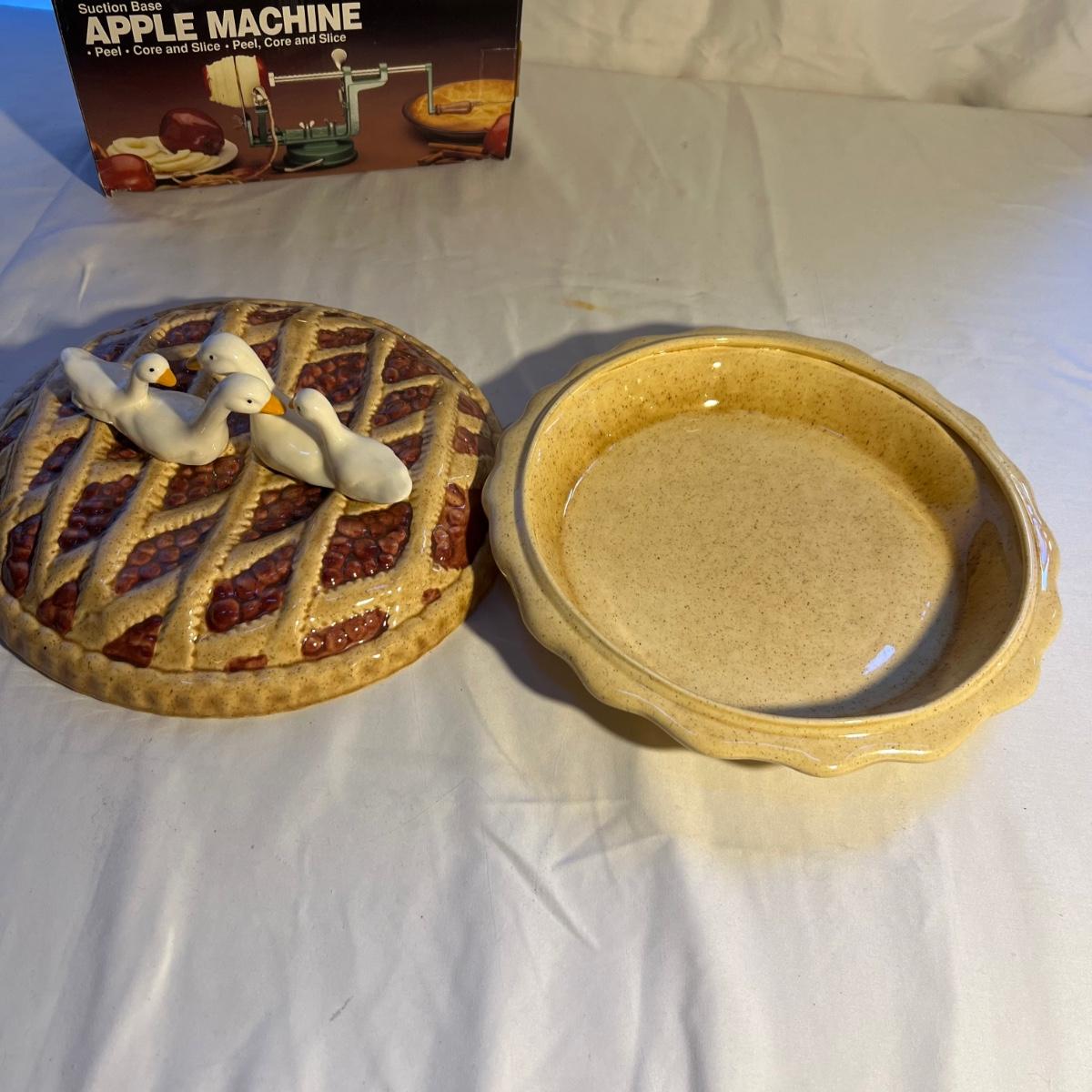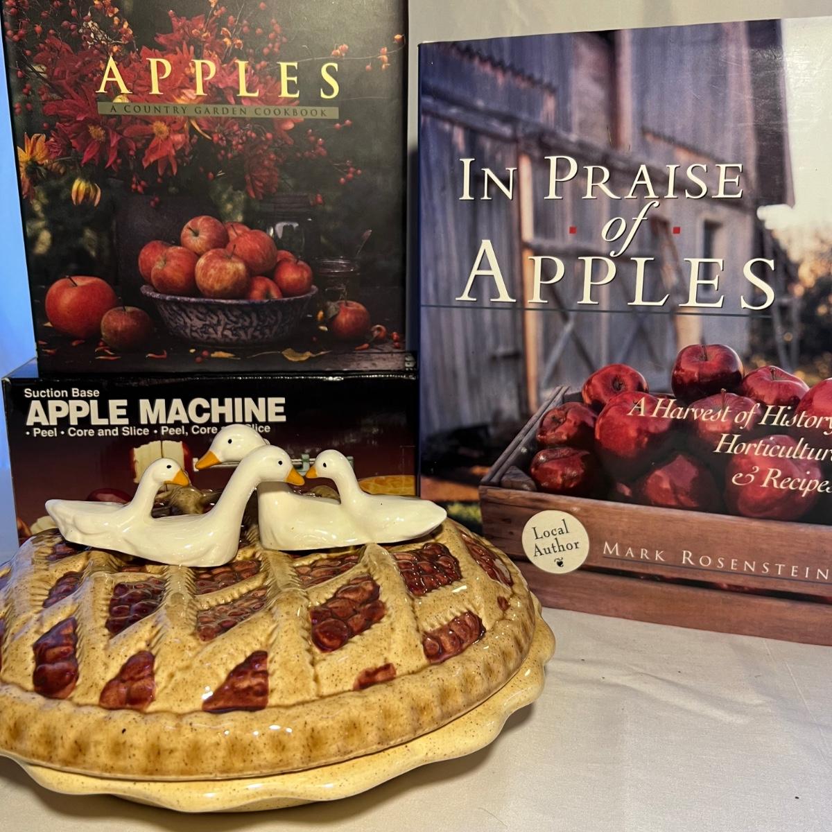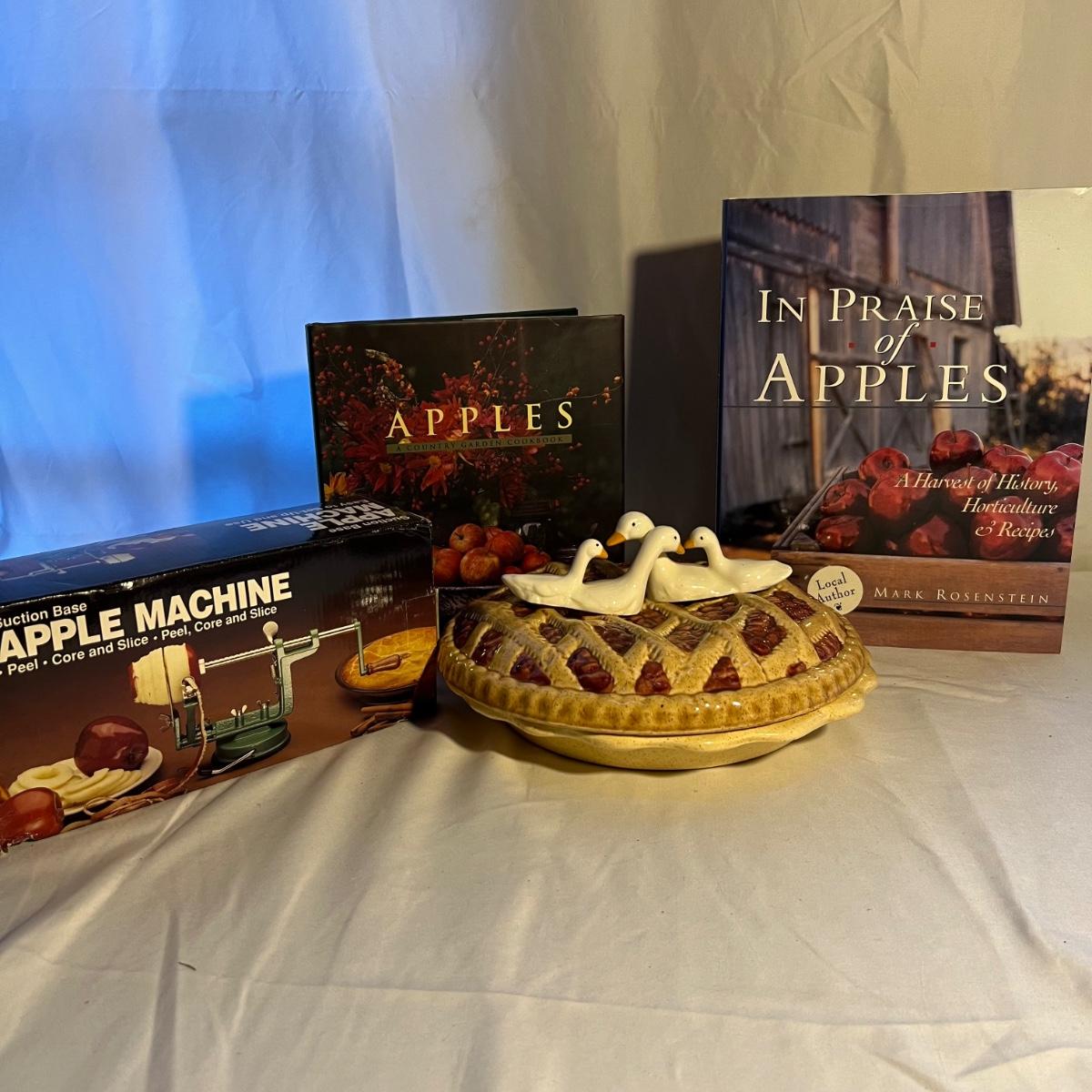 This lot is all about apples with cookbooks, a new in box apple machine and a sweet apple pie dish. Ceramic lidded dish measures 10.5”D x 5”H.
