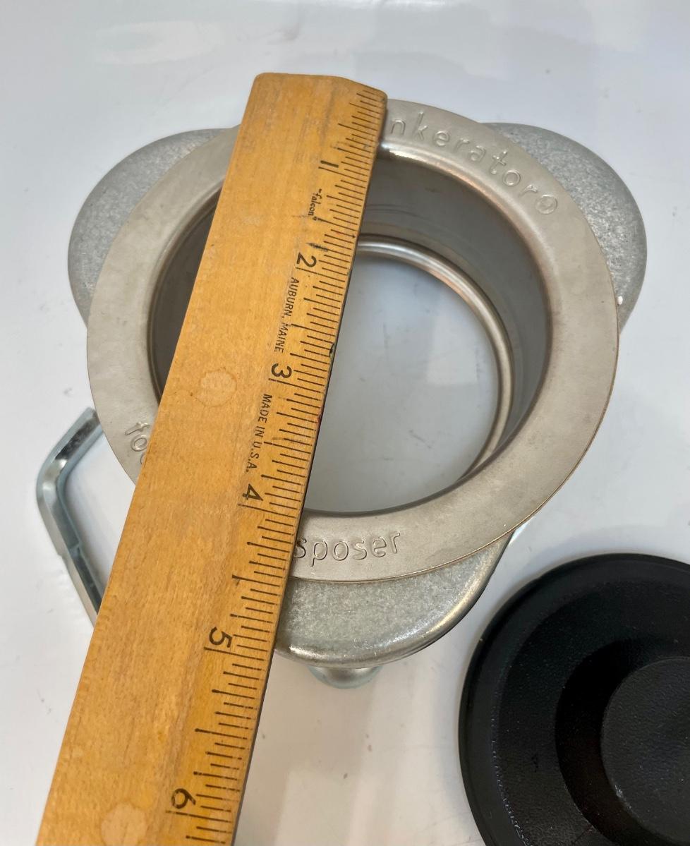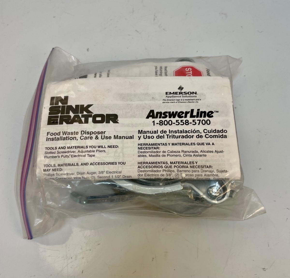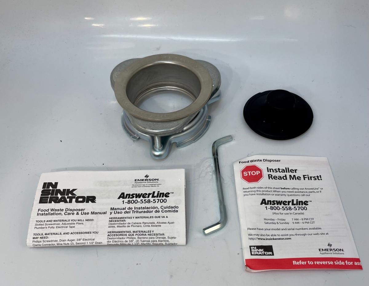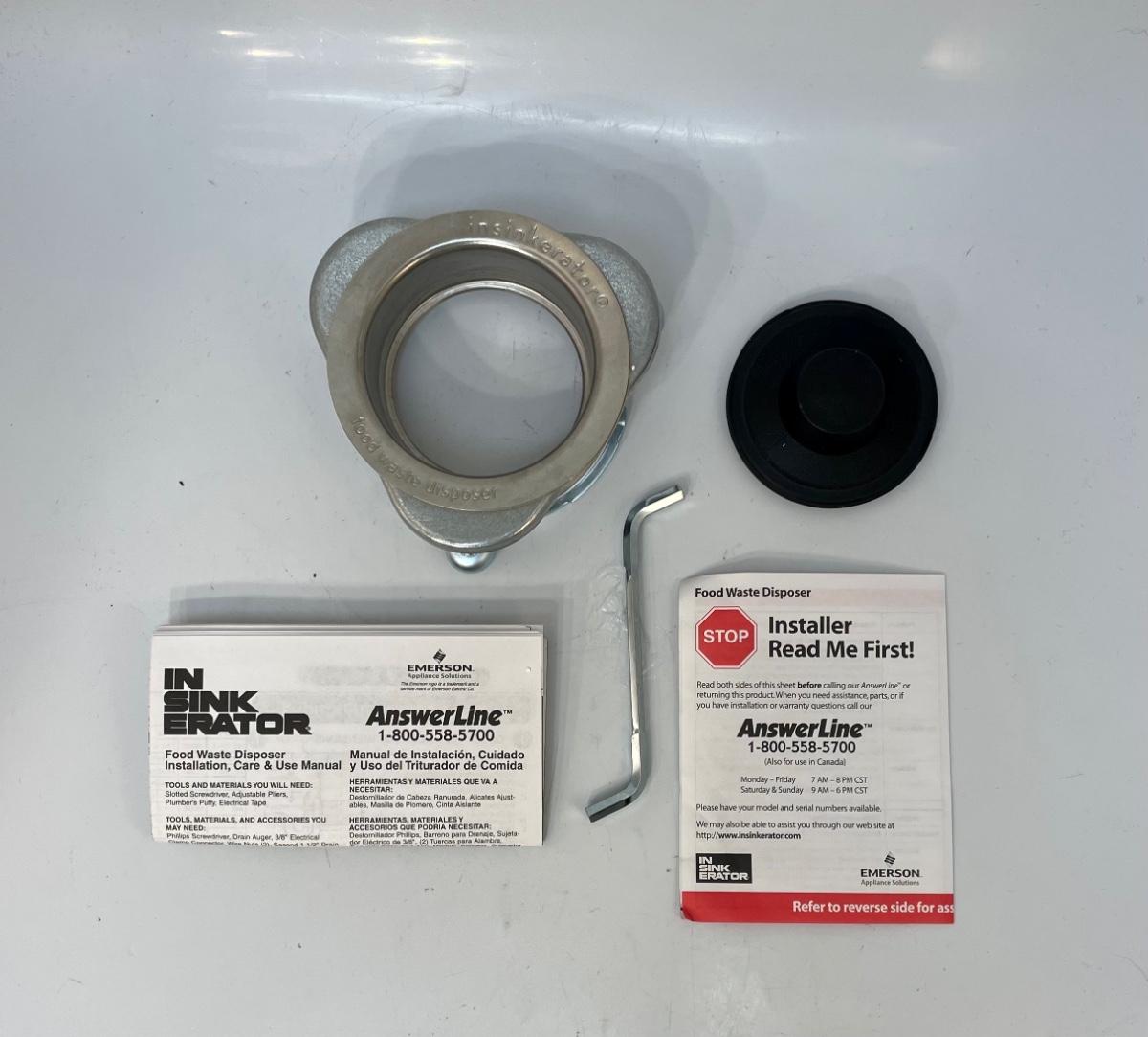 In Sink Erator sink attachment collar and Trim Ring. Includes black plastics drain plug, garbage disposal wrench, and installation instructions.