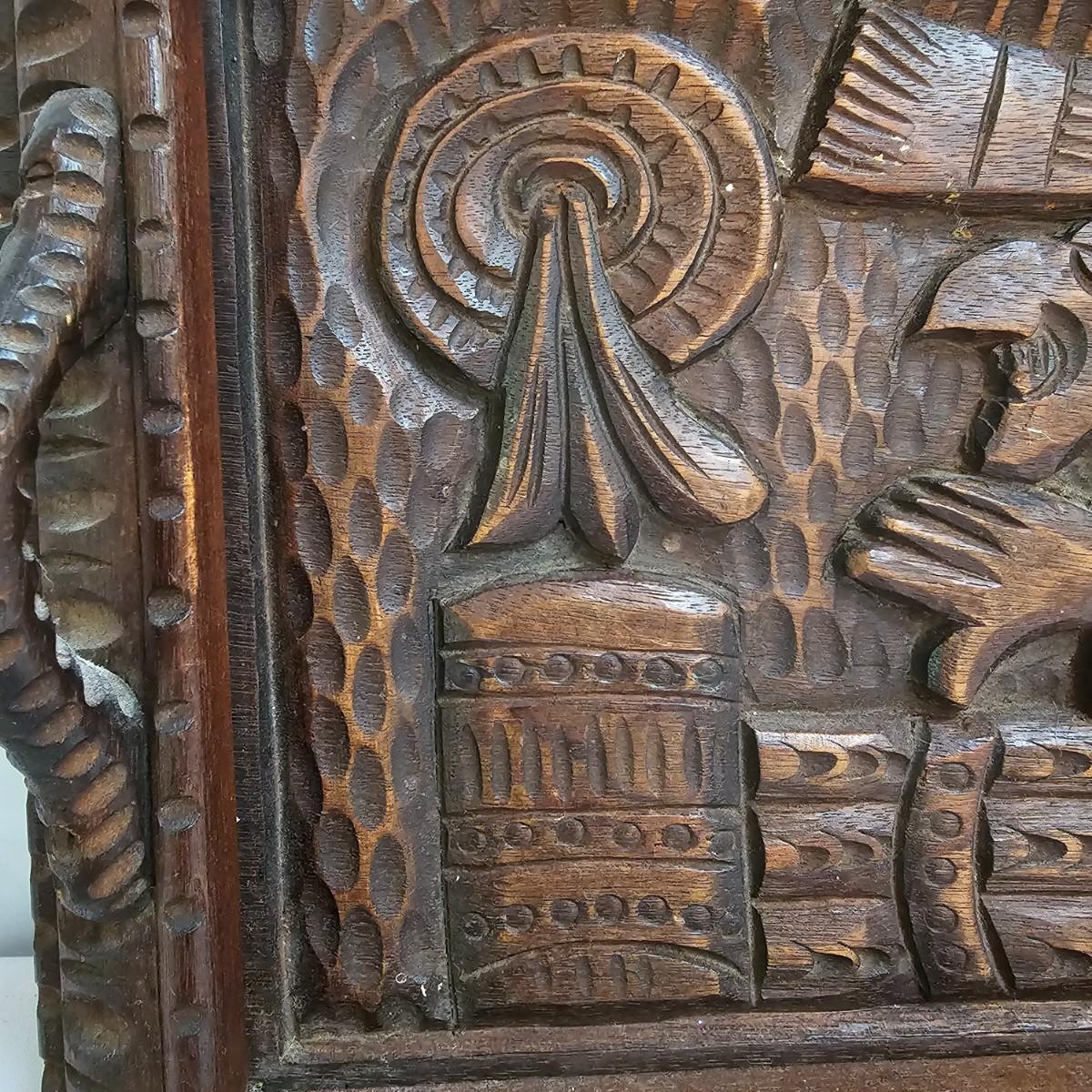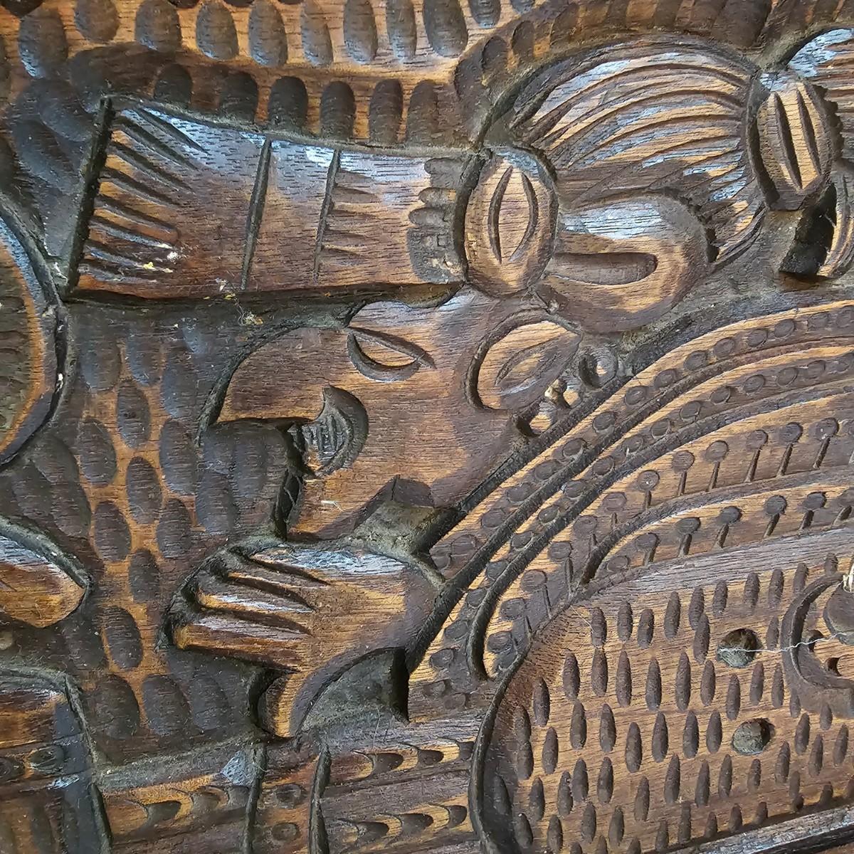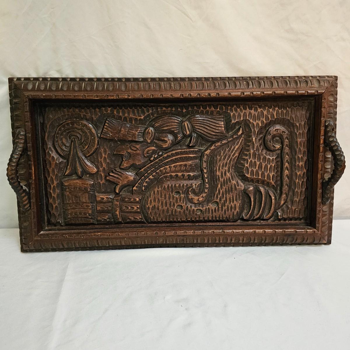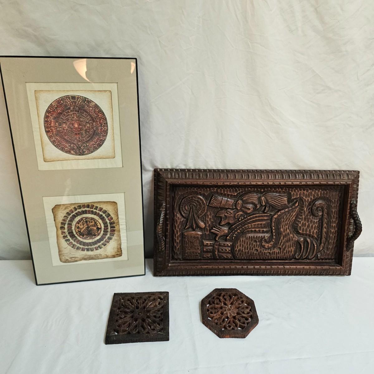 Wooden carved tray with bas-relief image in a South American style. Tray measures 20" x 10.5" x 2"H, has one loose handle. Framed double images appear to be hand painted symbolic wheels on linen weave type background. This piece is 10" x 20". Two carved wooden plate rests are approximately 5"square each. See photos for details. Shipping available. Shipping can be costly. We suggest contacting our preferred local shipping provider, Postage Express, with dimensions and getting an estimate before bidding: (828) 225-9250 or shipping@postageexpressnc.com.