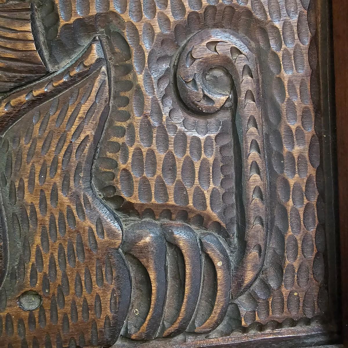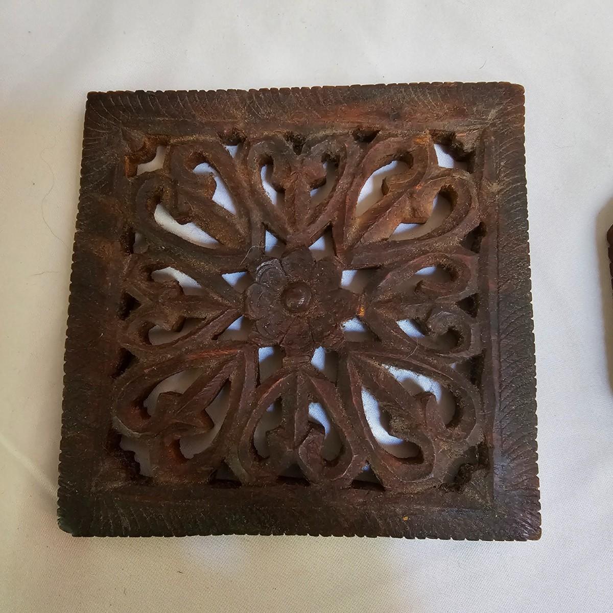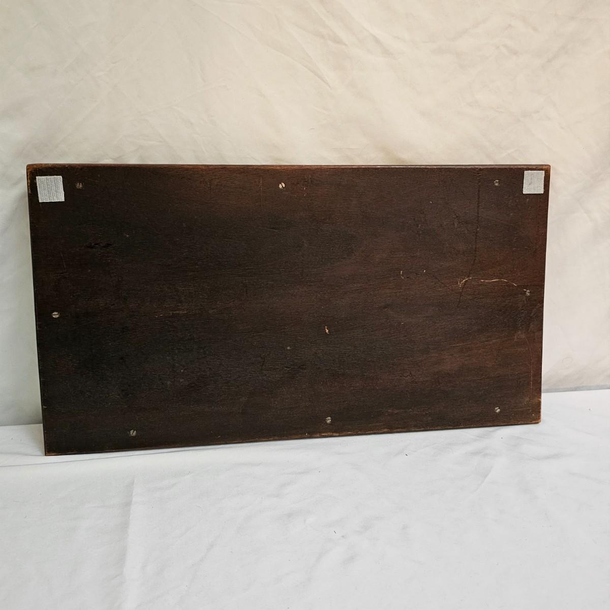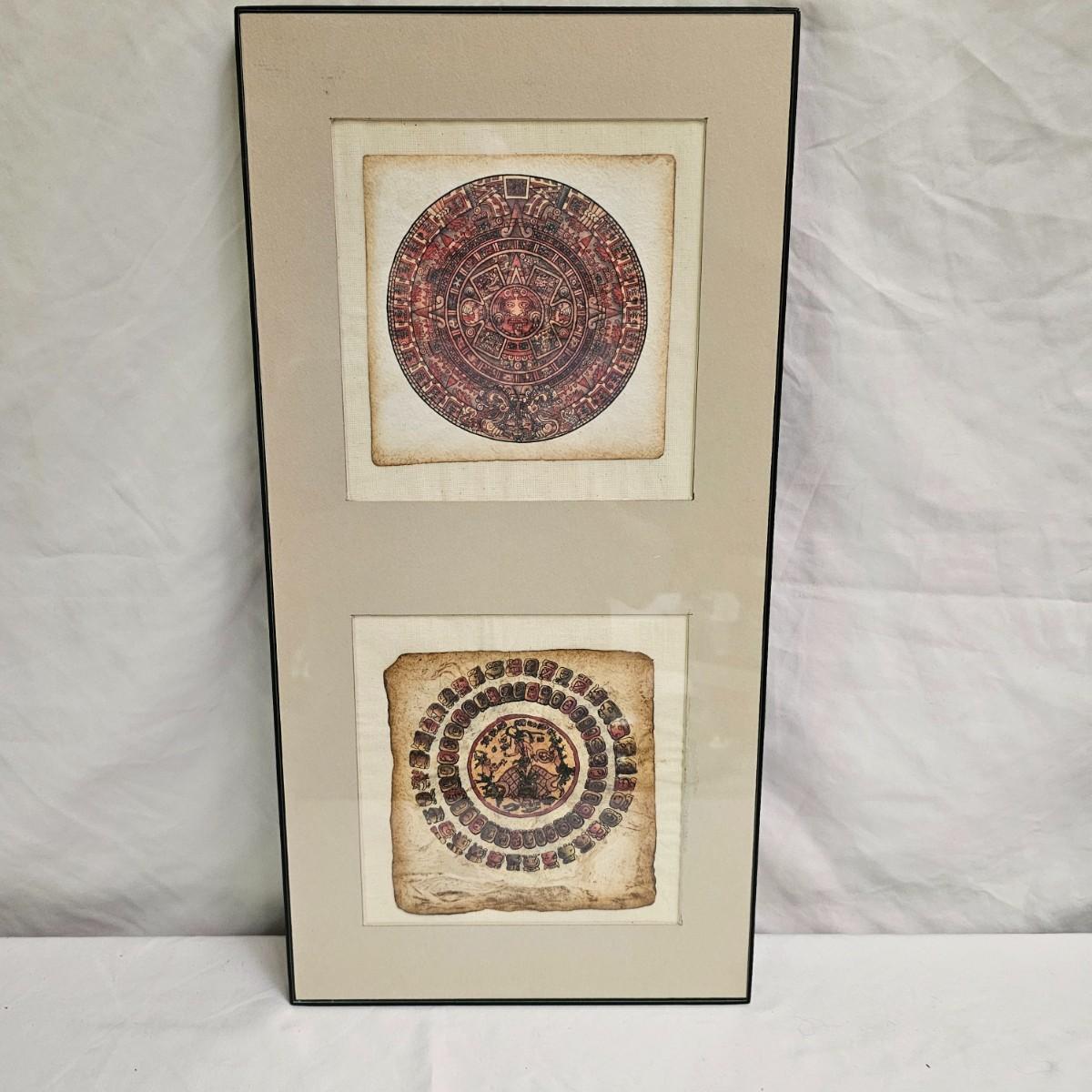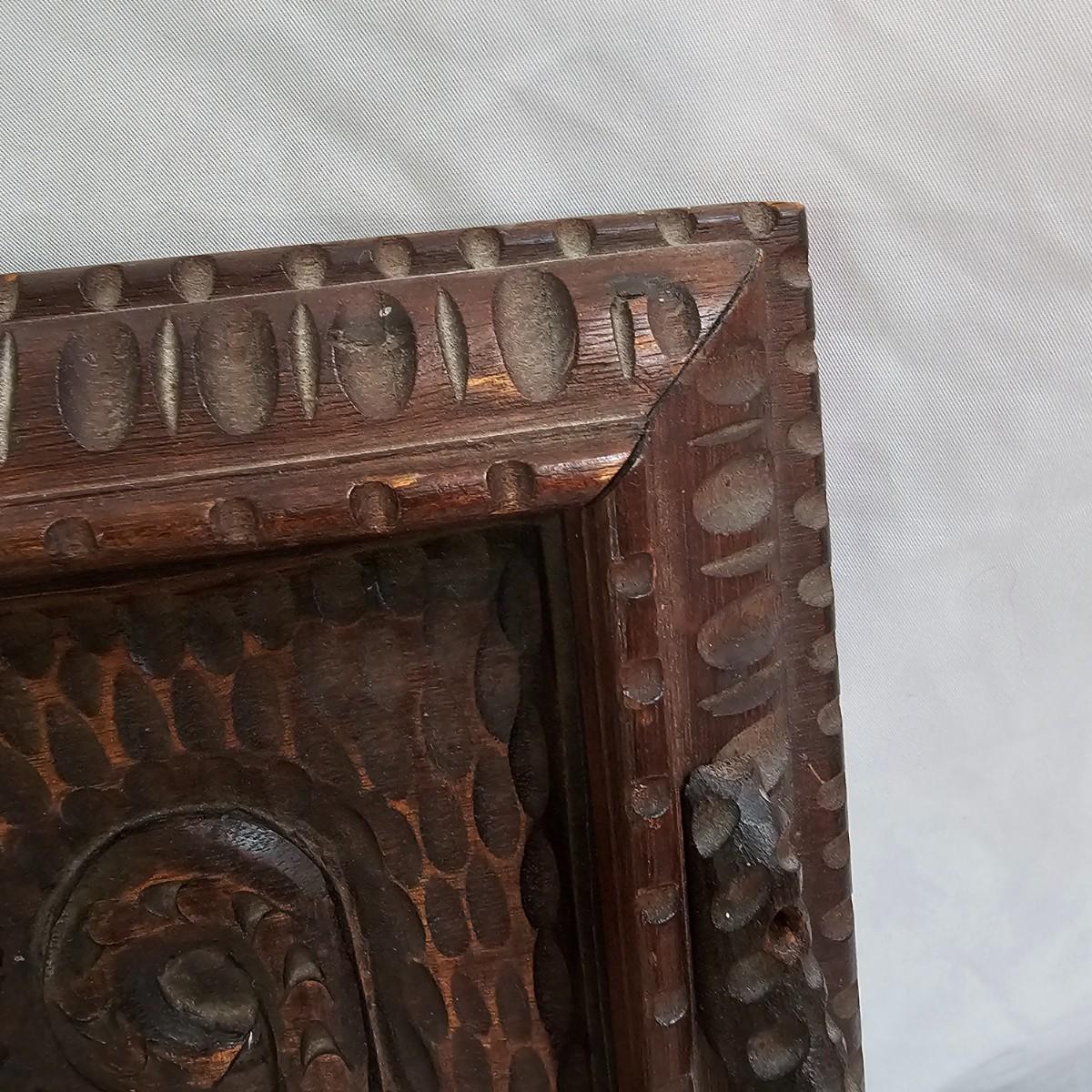 Wooden carved tray with bas-relief image in a South American style. Tray measures 20" x 10.5" x 2"H, has one loose handle. Framed double images appear to be hand painted symbolic wheels on linen weave type background. This piece is 10" x 20". Two carved wooden plate rests are approximately 5"square each. See photos for details. Shipping available. Shipping can be costly. We suggest contacting our preferred local shipping provider, Postage Express, with dimensions and getting an estimate before bidding: (828) 225-9250 or shipping@postageexpressnc.com.