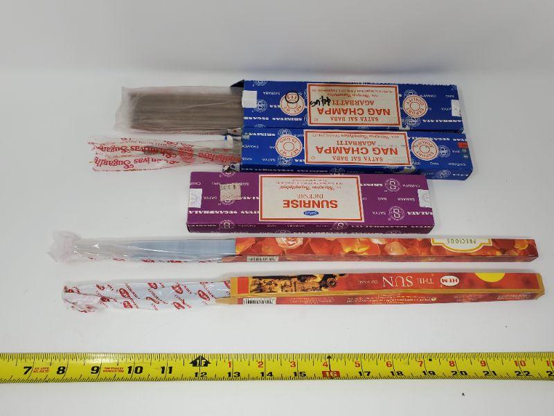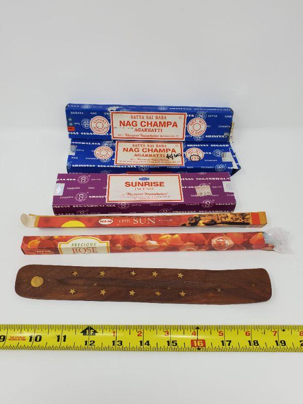 Cute little wooden incense burner with several boxes of incense sticks, one unopened and most of them are pretty full.
