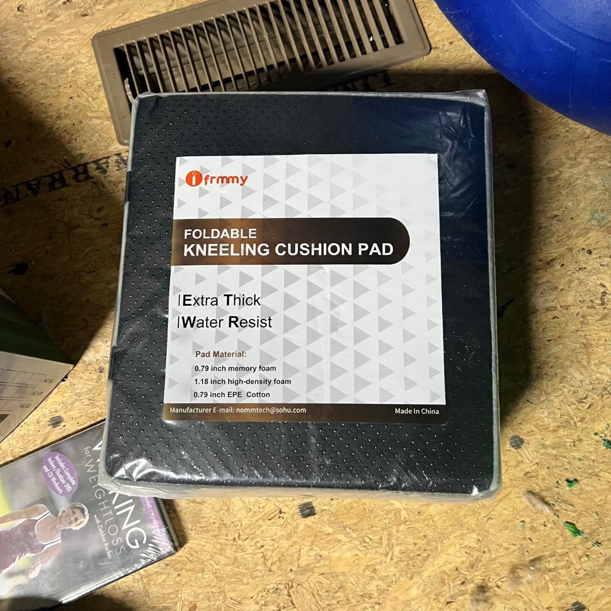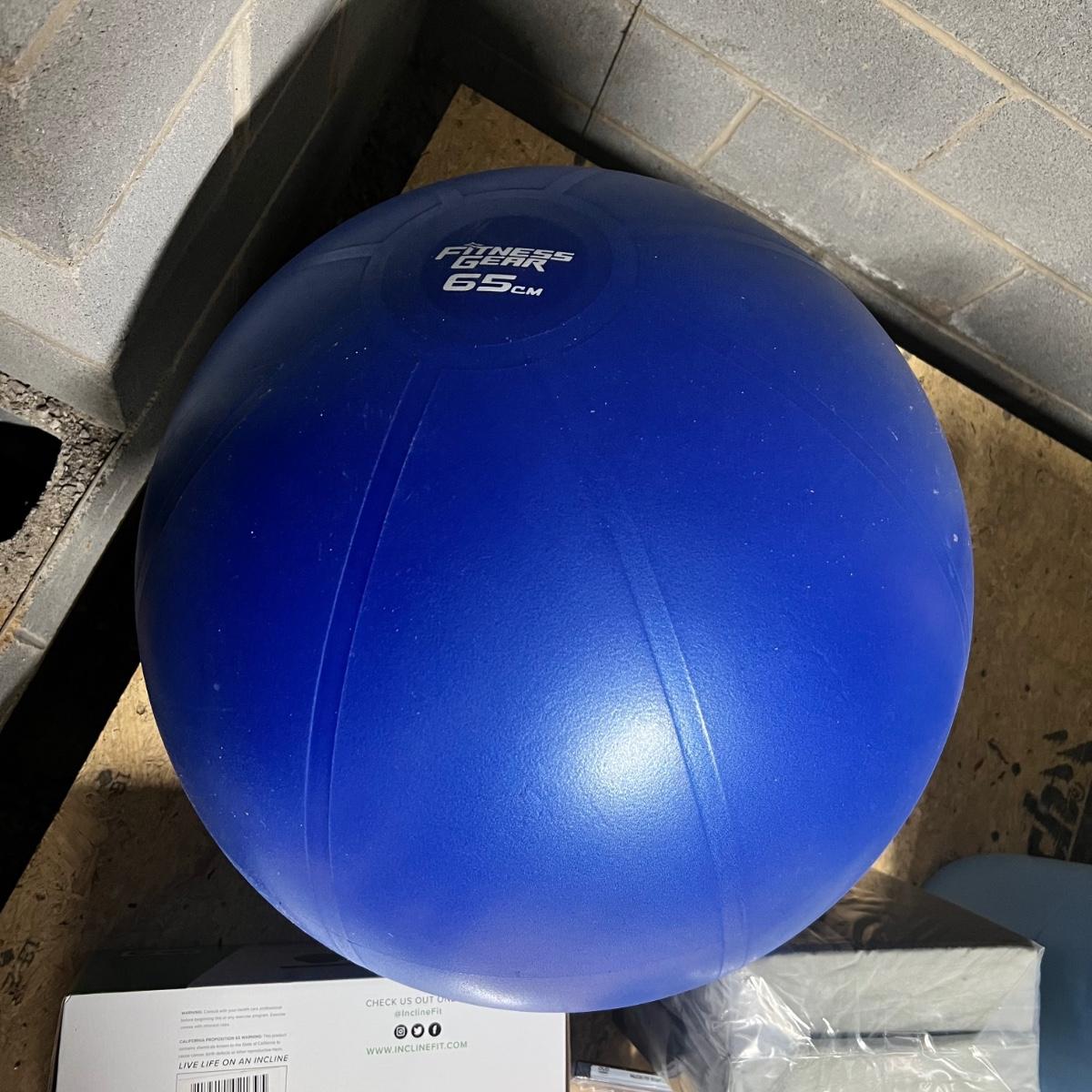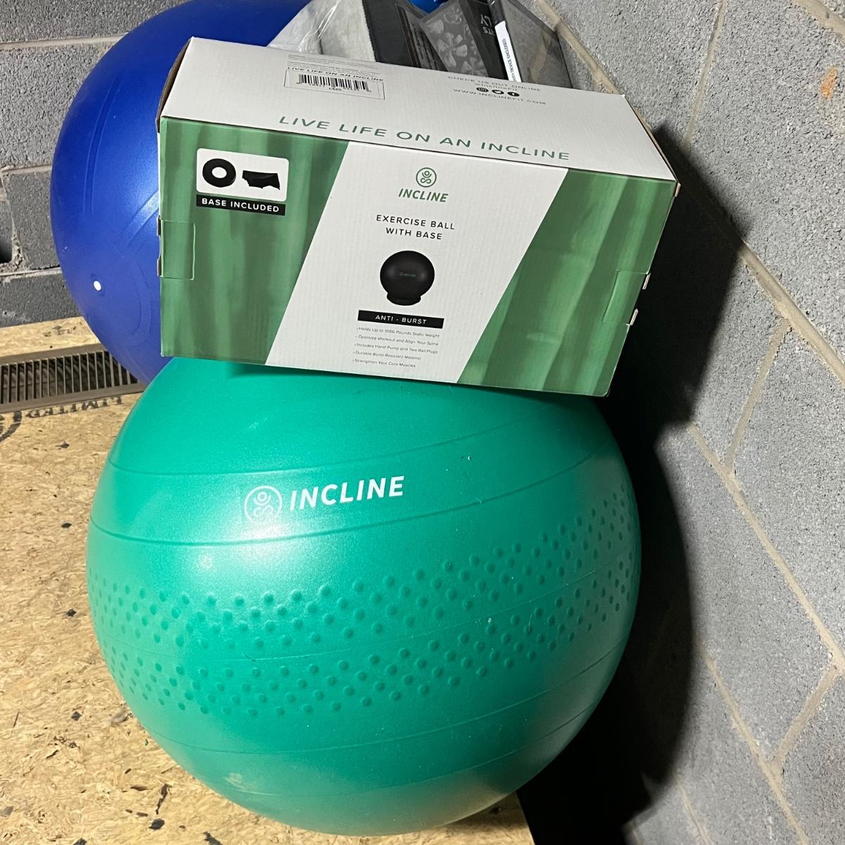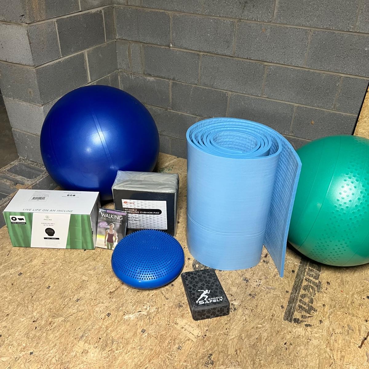 Assortment of exercise gear includes two balls plus a stand. Also included: a sealed DVD, Appleround wobble/stability ball (measures 12”D x 5”H) and more. The blue padded mat can be cut to the size of your needs; it measures 22” x 191” long.