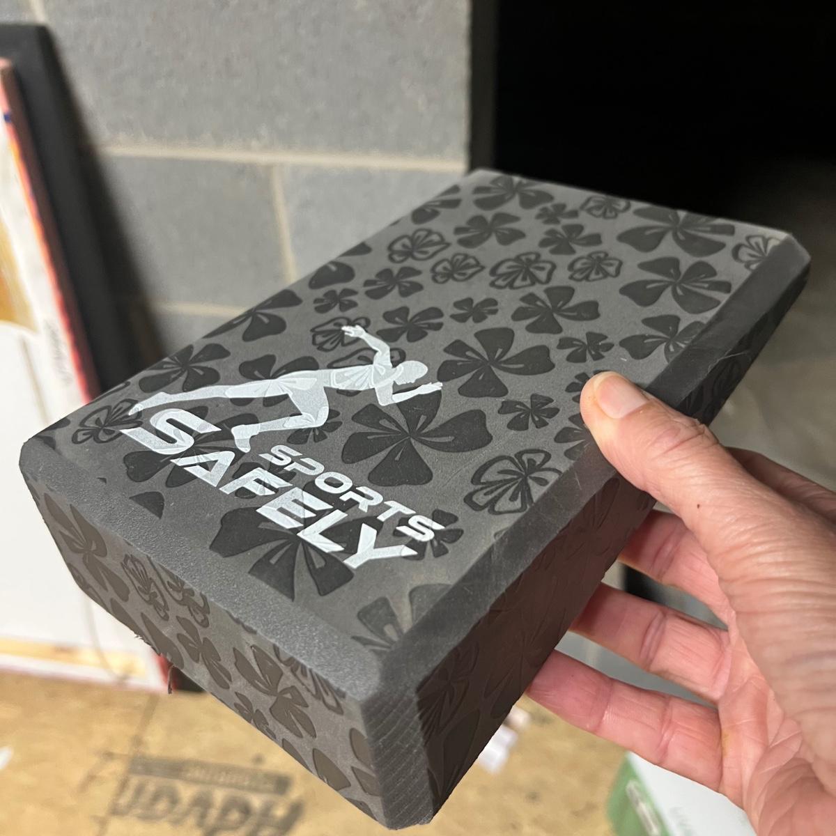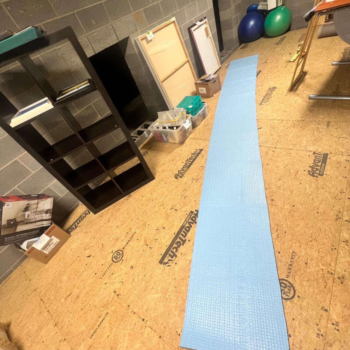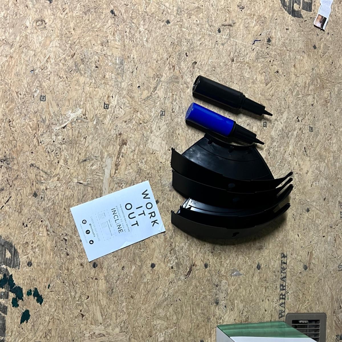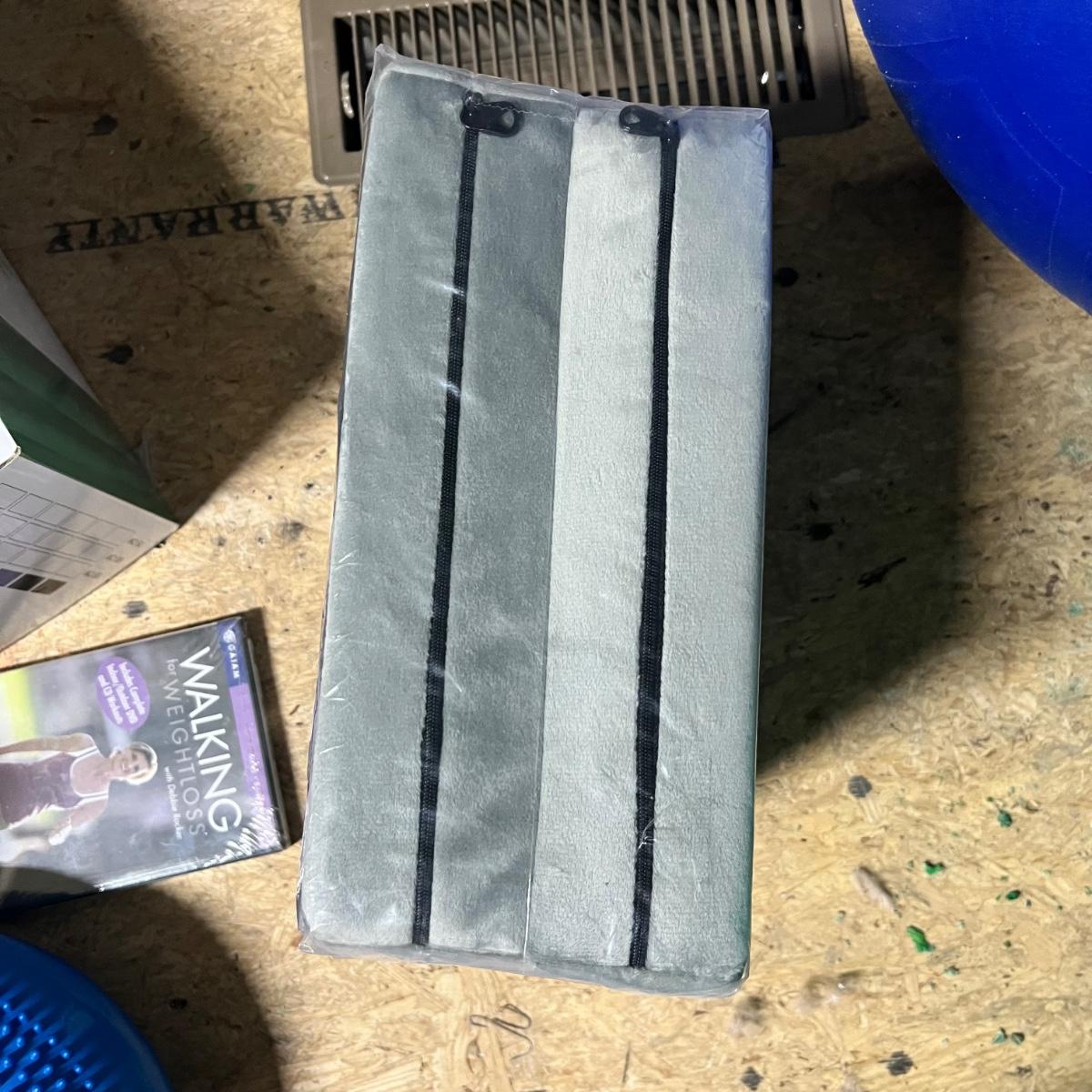 Assortment of exercise gear includes two balls plus a stand. Also included: a sealed DVD, Appleround wobble/stability ball (measures 12”D x 5”H) and more. The blue padded mat can be cut to the size of your needs; it measures 22” x 191” long.