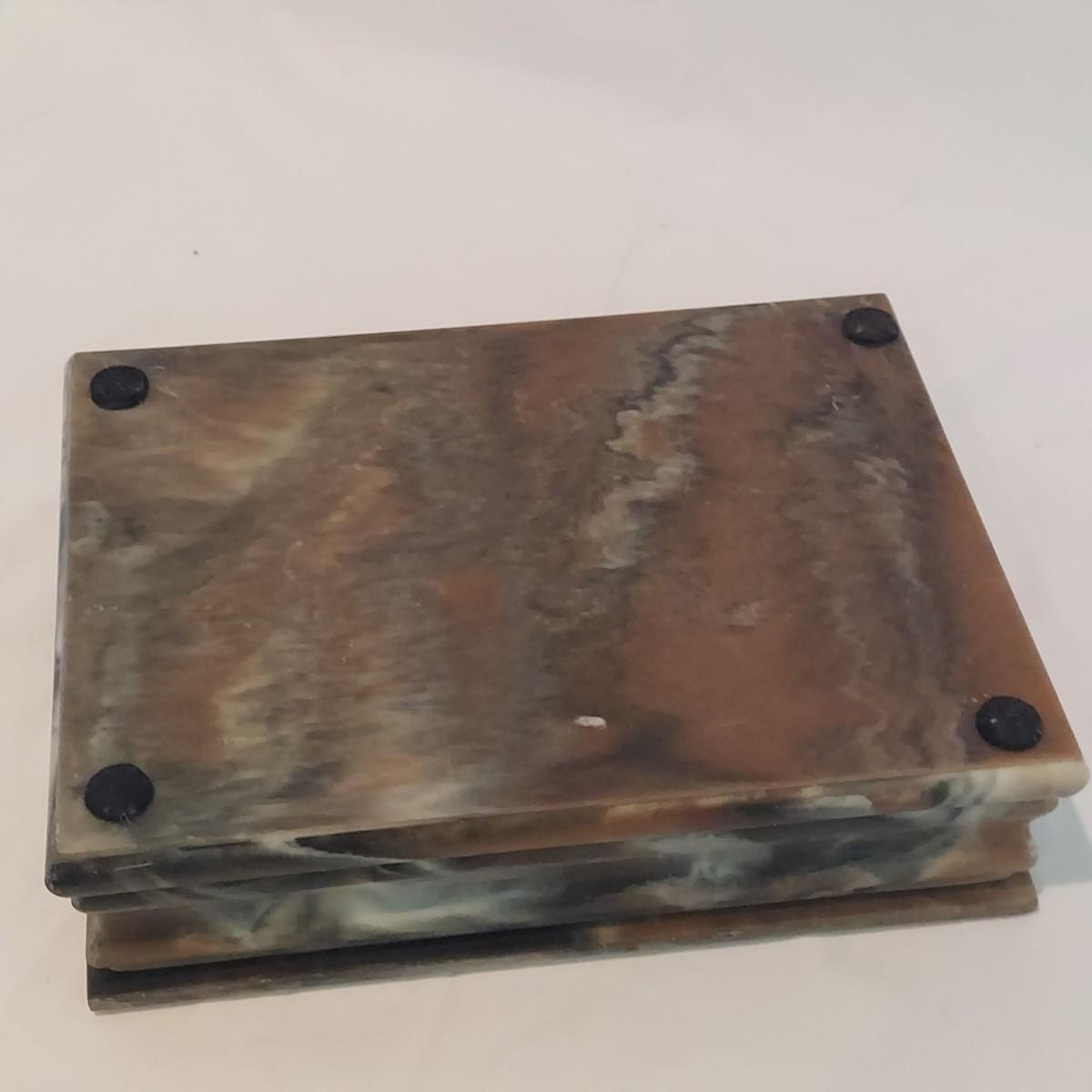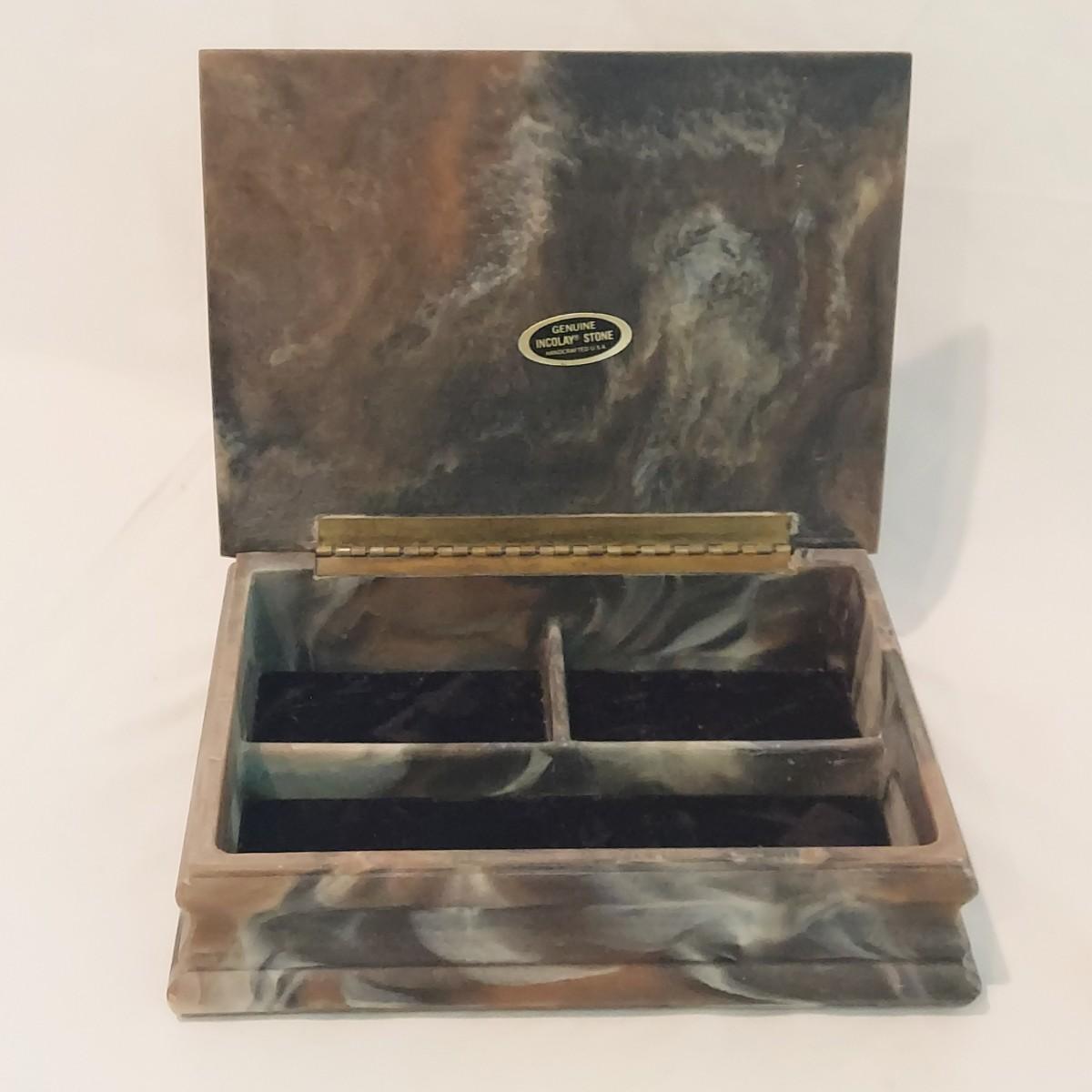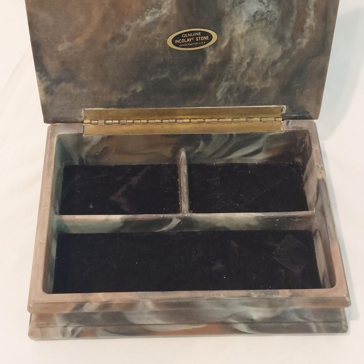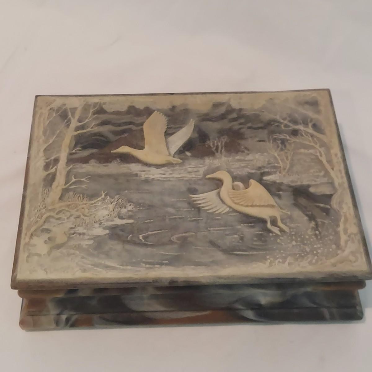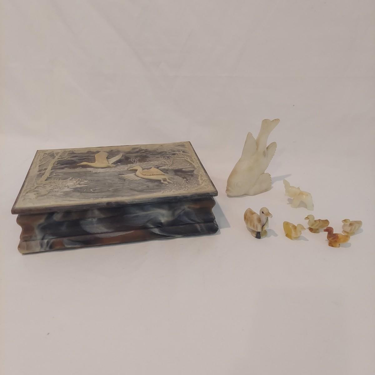 Lot includes a box made from Incolay Stone plus several small stone animals that appear to be carved from quartz. There is a fish, an elephant and five birds. The box measures 10” x 7” x 3"H. Please see photos for details. Shipping available