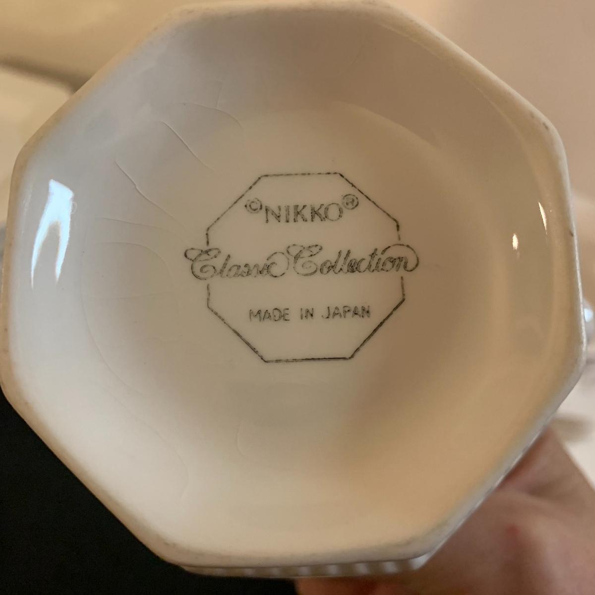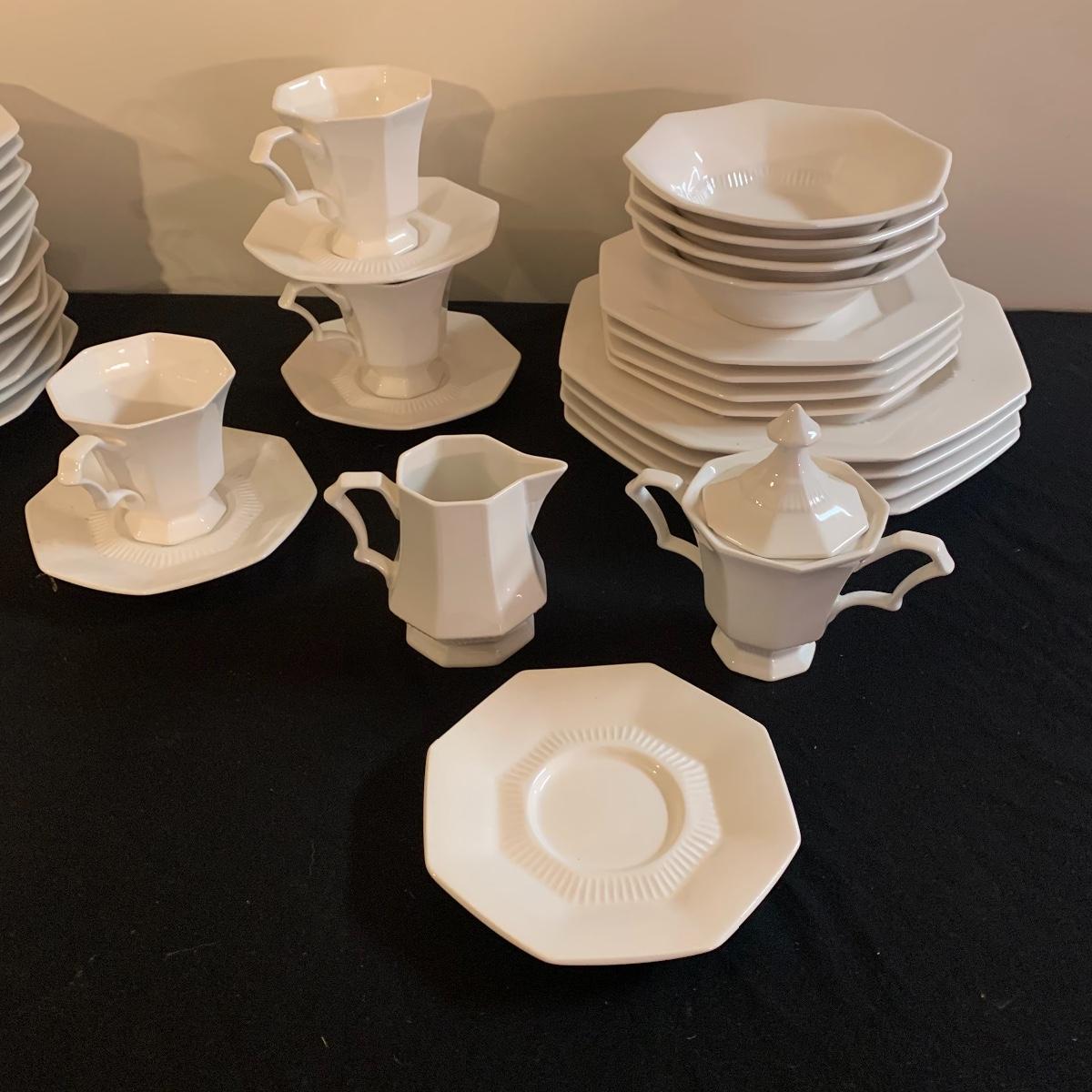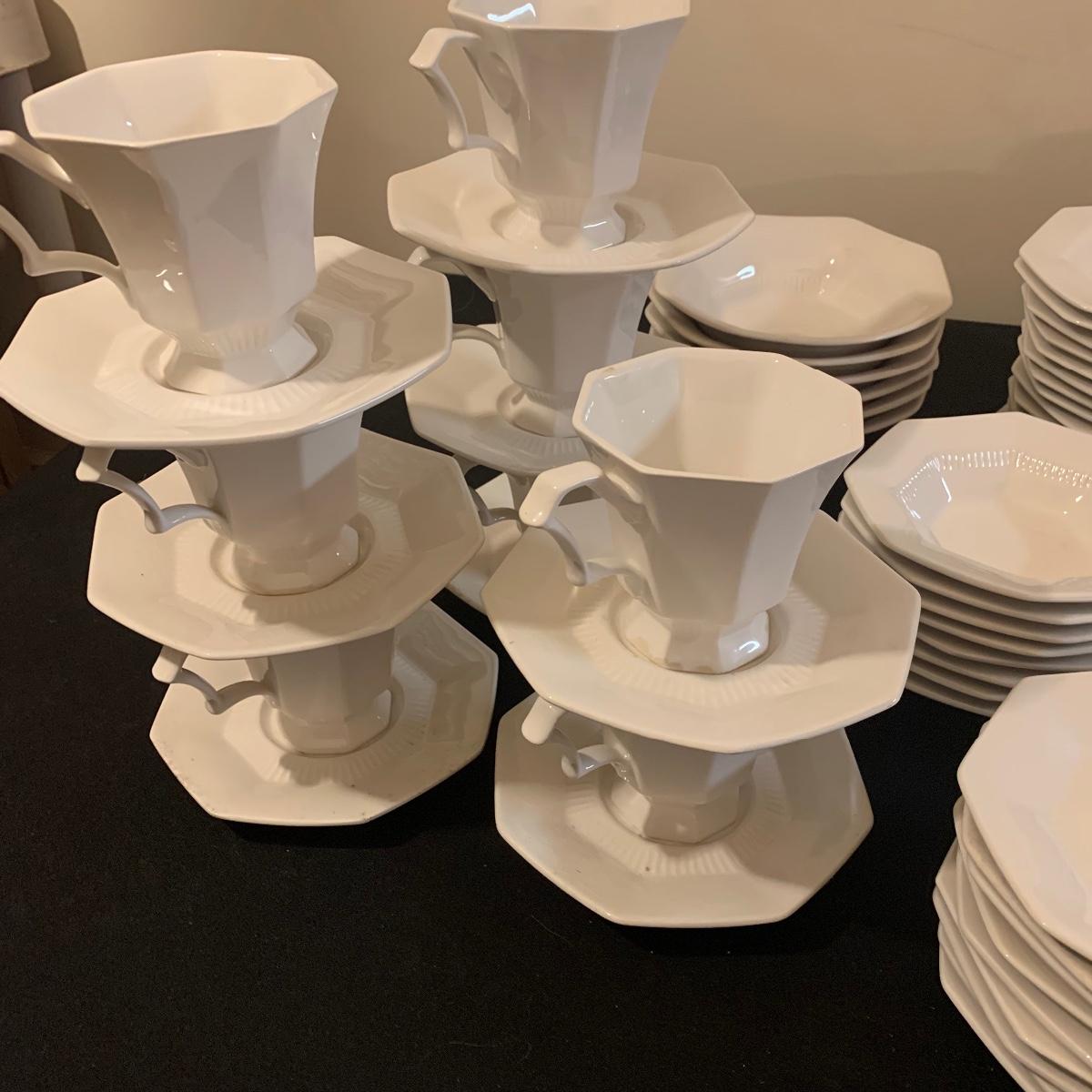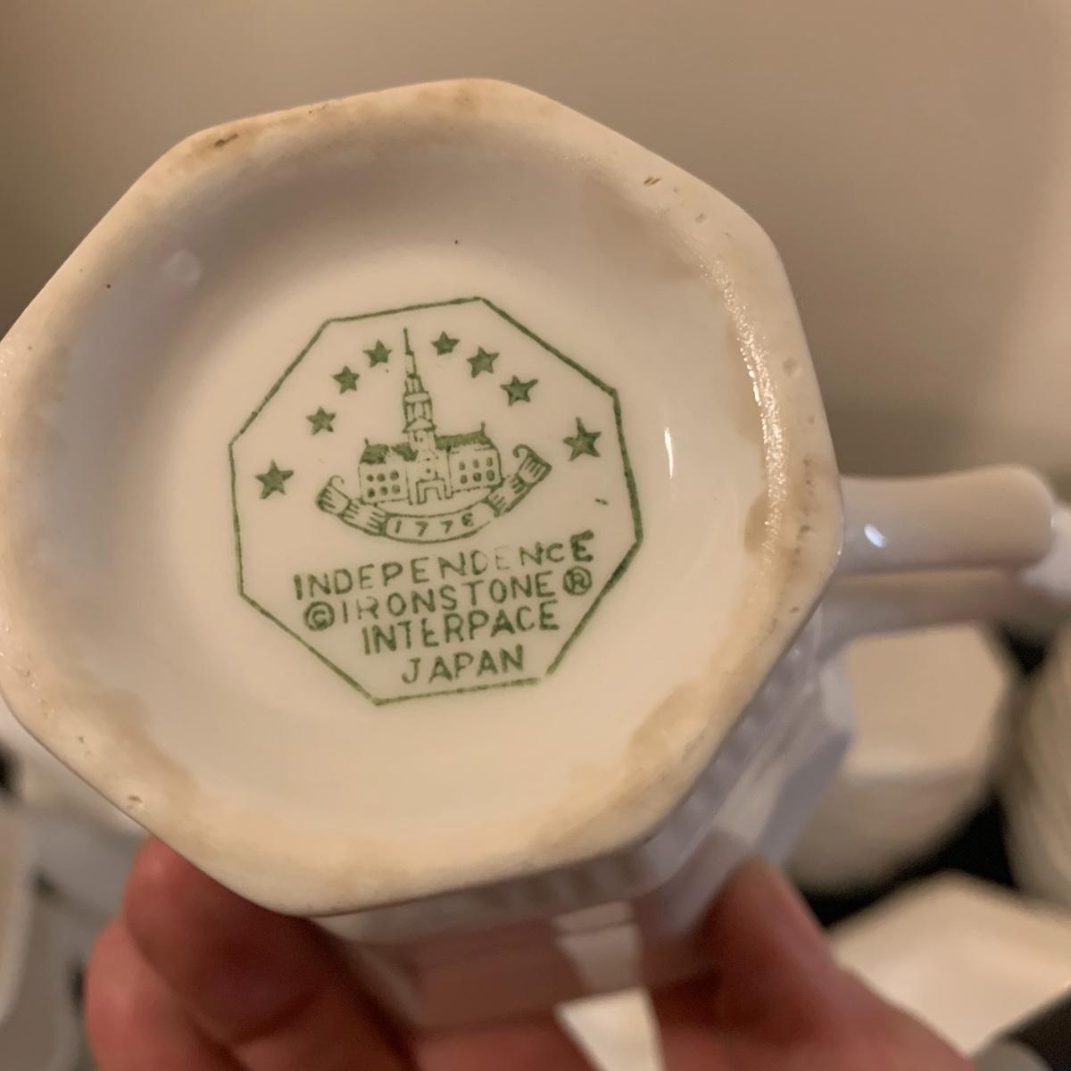 Two name makers but matching pattern ironstone dish set to include a five piece four place setting (minus one tea cup) of the Nikko Classic collection and a small creamer and sugar. The larger collection is of the Independence Ironstone which has complete seven pieces settings for five with many extras of dinner plates, salad plates, cups and saucers. The two sets match perfectly but the Nikko is likely newer and the Independence has a few pieces with nicks and or crazing. Not too many though. Mostly desert plates.