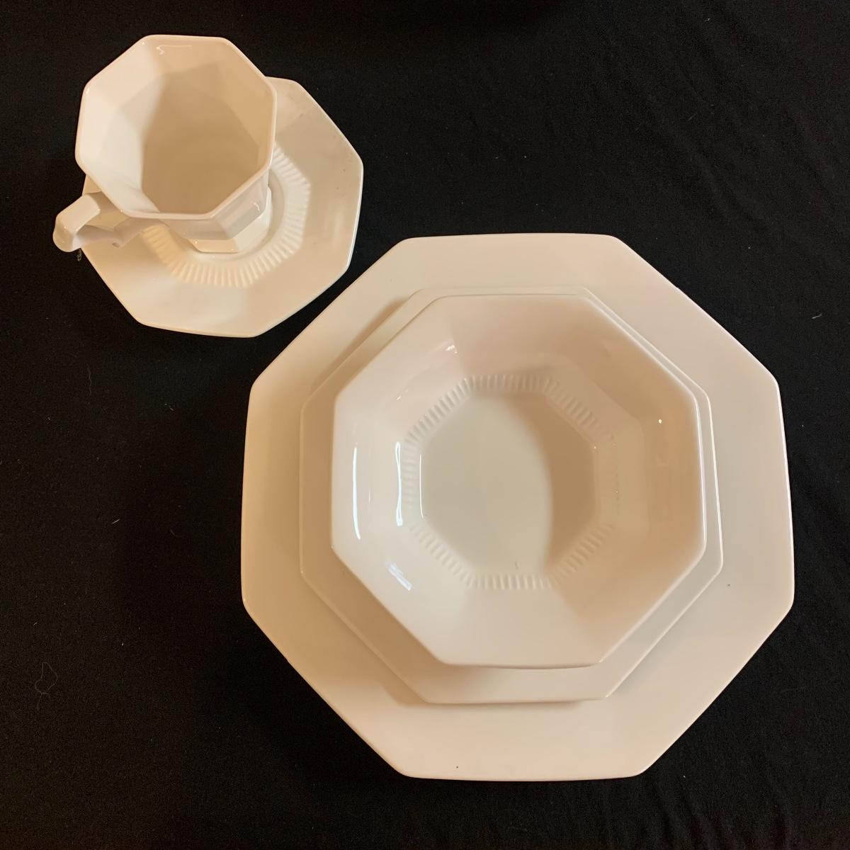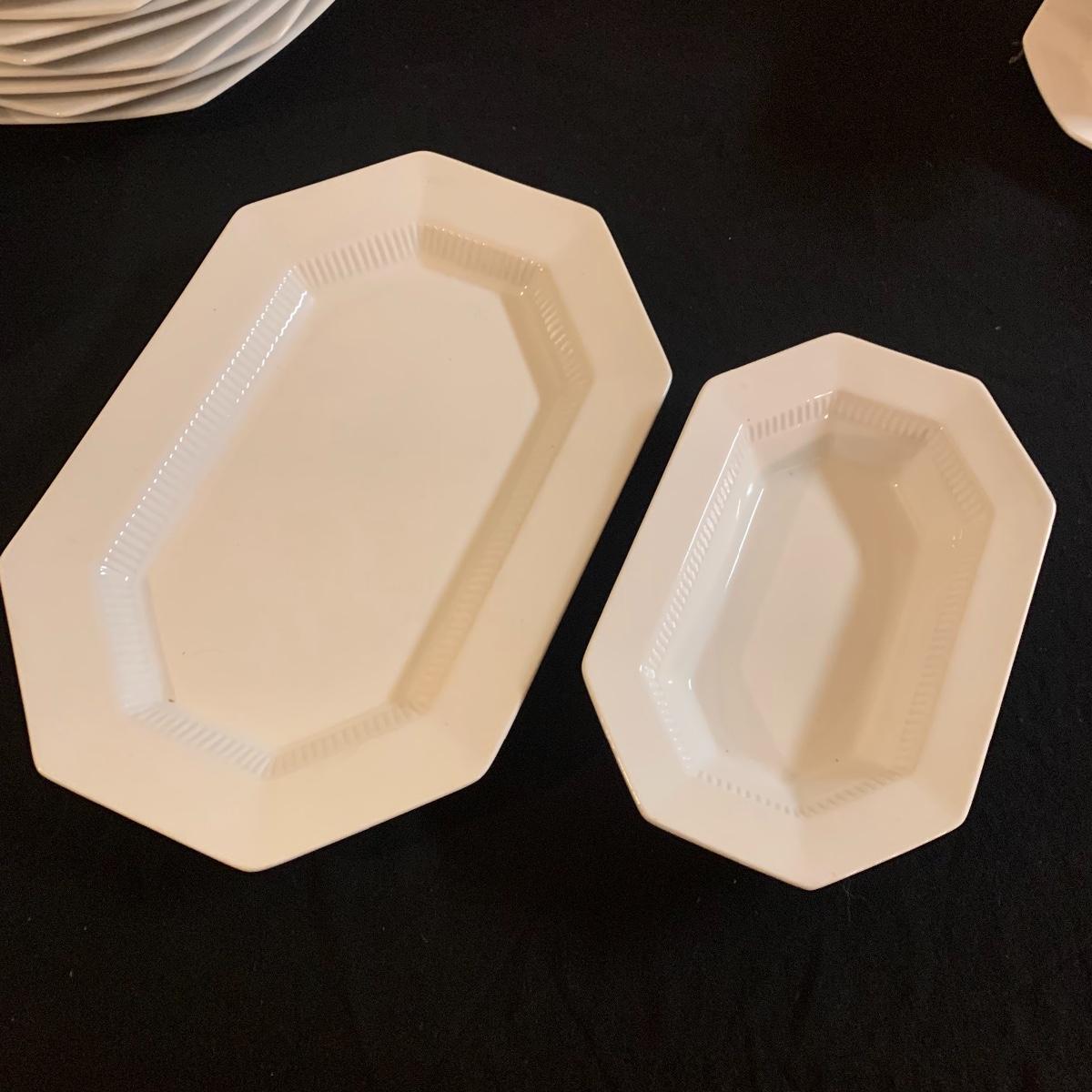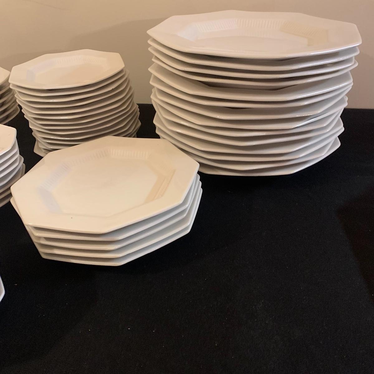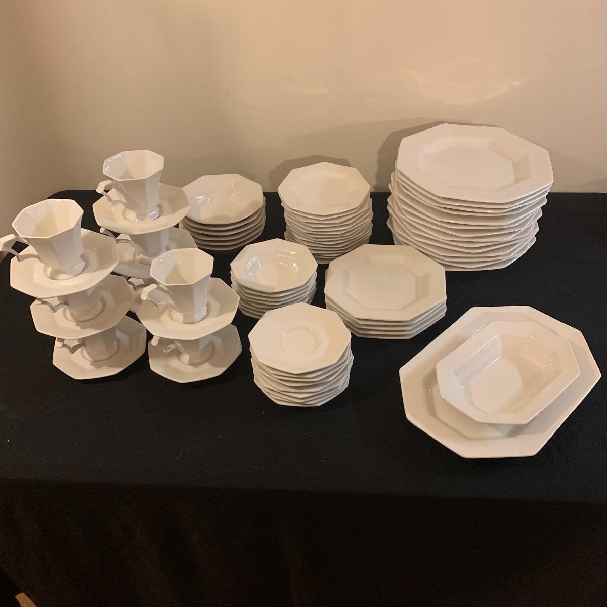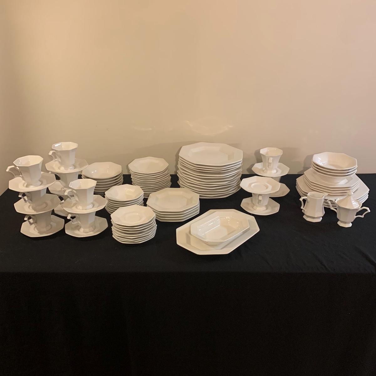 Two name makers but matching pattern ironstone dish set to include a five piece four place setting (minus one tea cup) of the Nikko Classic collection and a small creamer and sugar. The larger collection is of the Independence Ironstone which has complete seven pieces settings for five with many extras of dinner plates, salad plates, cups and saucers. The two sets match perfectly but the Nikko is likely newer and the Independence has a few pieces with nicks and or crazing. Not too many though. Mostly desert plates.