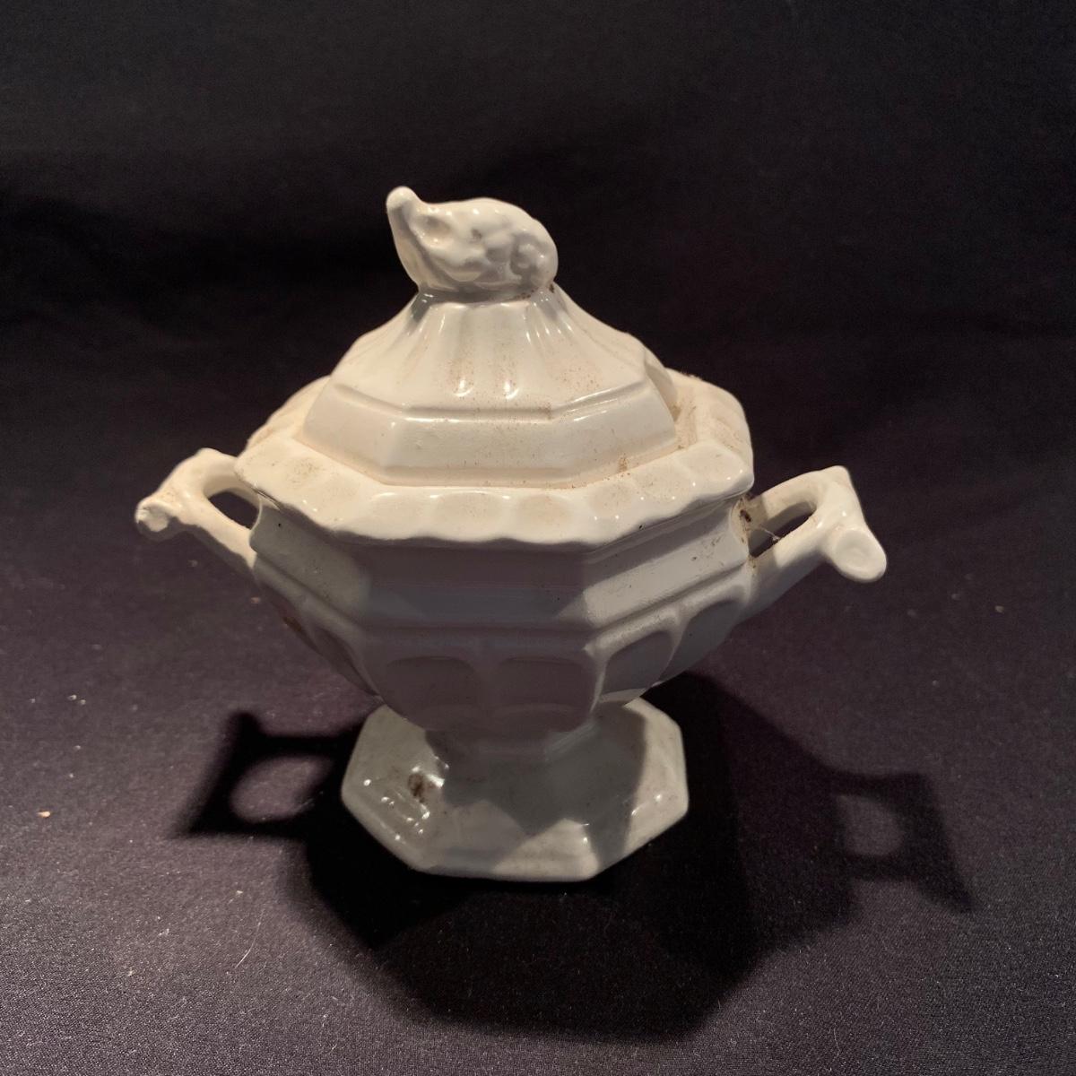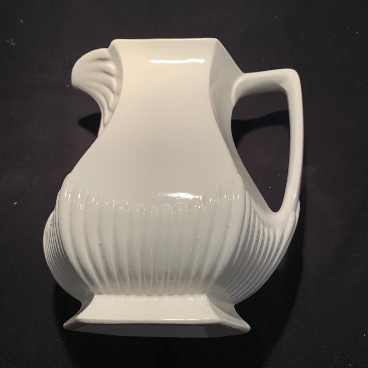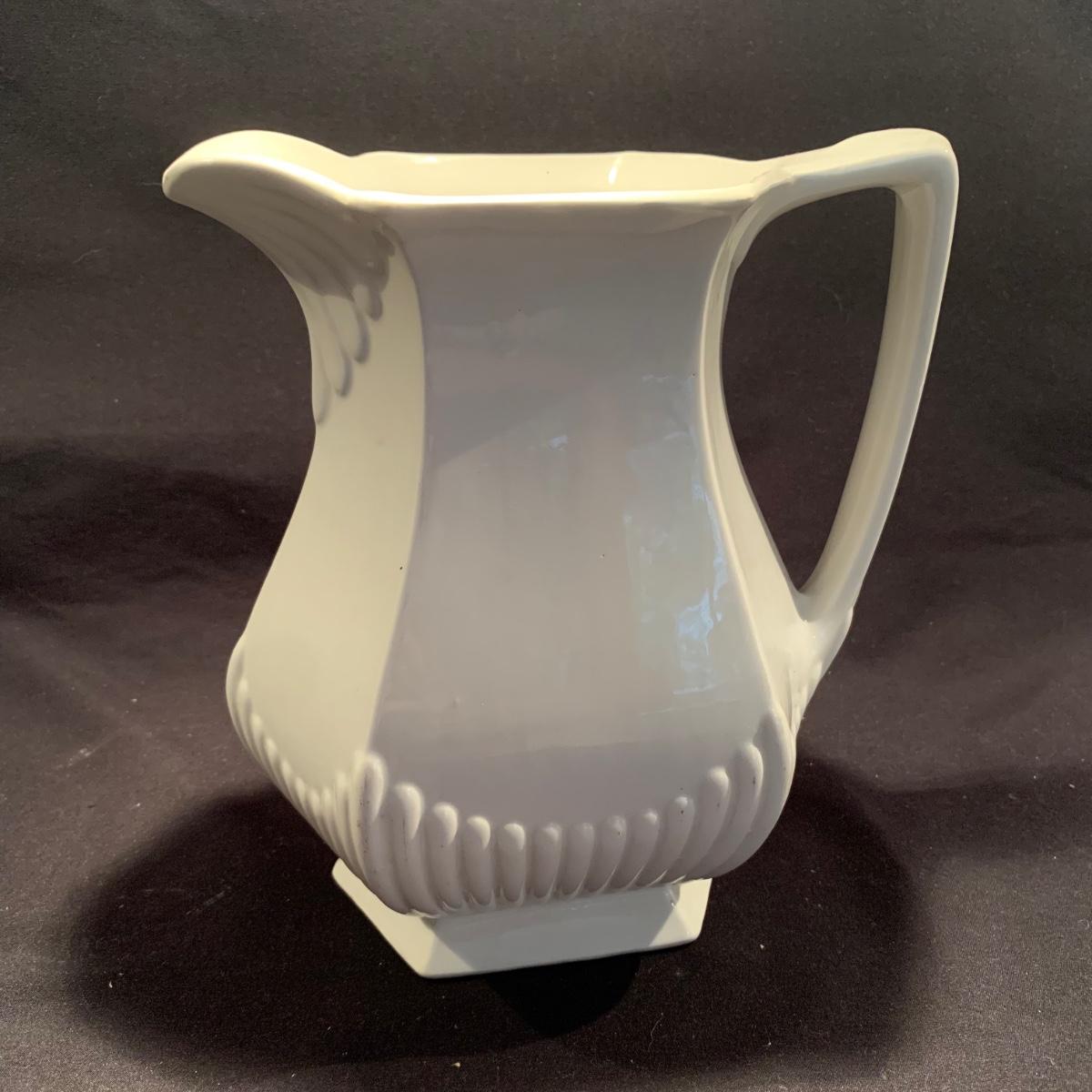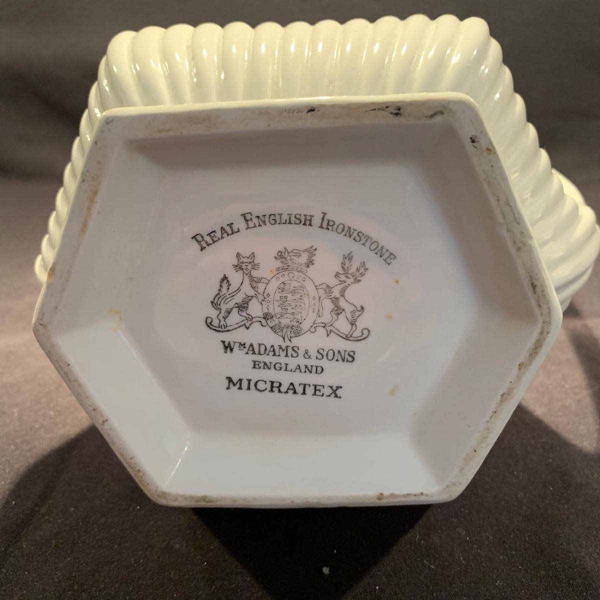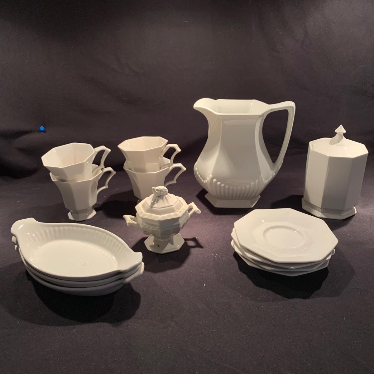 This lot includes a set of white ceramic Castleton set. Included are small plates, serving dishes, tea cups, a pitcher, and more. Some of the pieces have chips and signs of cracks (see photos). The largest piece measures about 8in x 7.5in. The pitcher is a Wm. Adams & Sons piece, rather than a Castleton. The small lidded dish is unmarked, so we cannot confirm its maker. Shipping available.