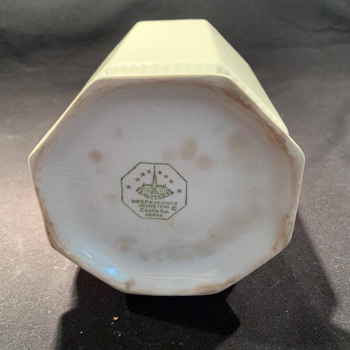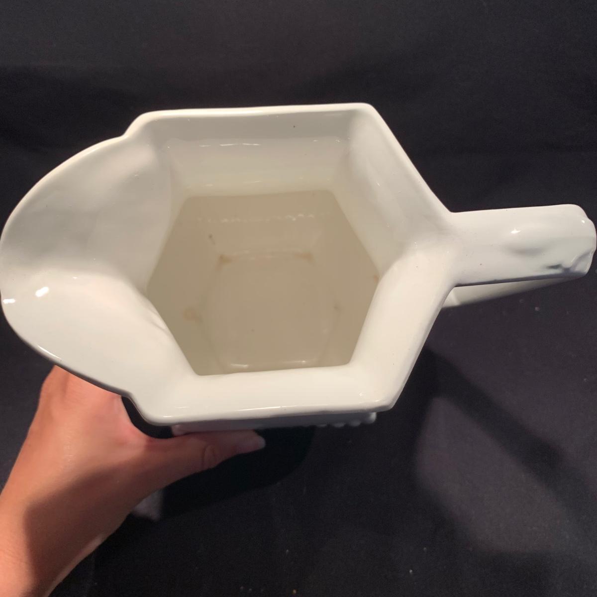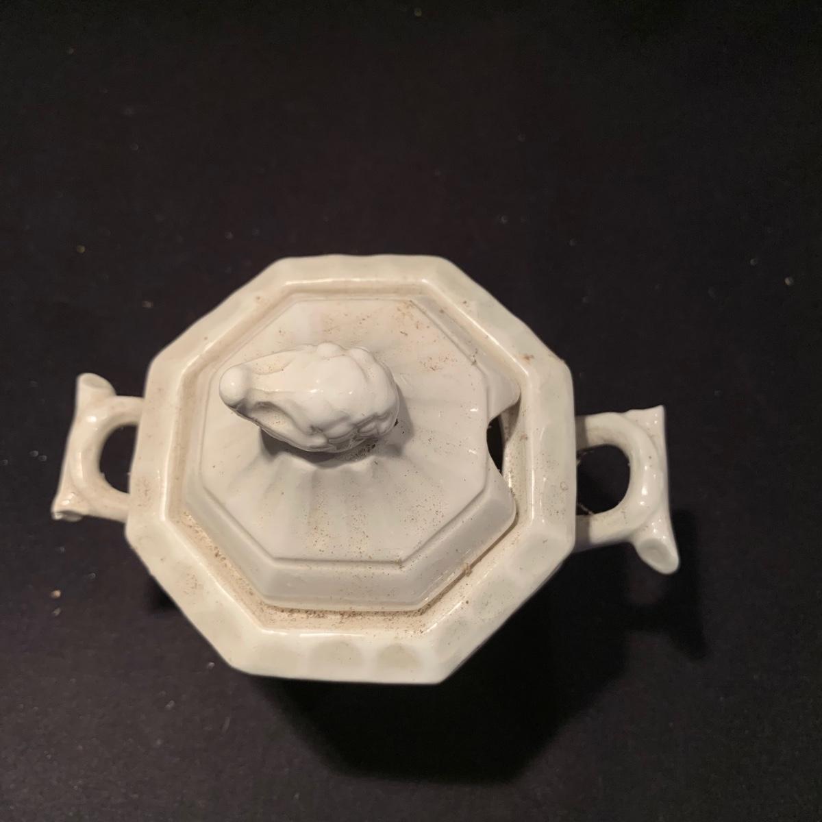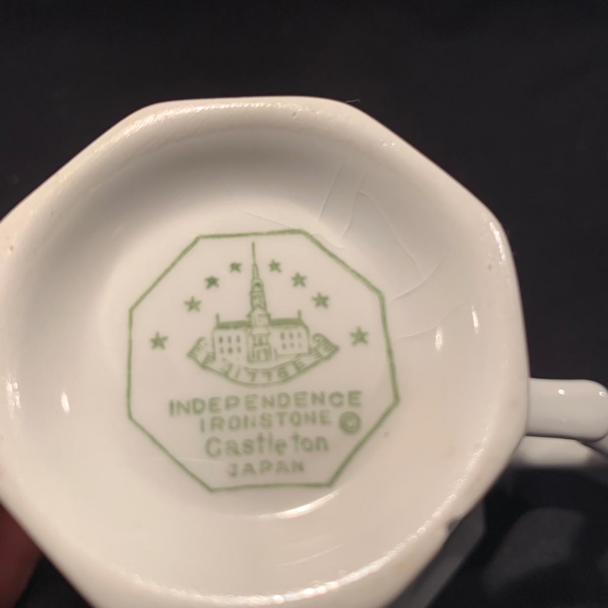 This lot includes a set of white ceramic Castleton set. Included are small plates, serving dishes, tea cups, a pitcher, and more. Some of the pieces have chips and signs of cracks (see photos). The largest piece measures about 8in x 7.5in. The pitcher is a Wm. Adams & Sons piece, rather than a Castleton. The small lidded dish is unmarked, so we cannot confirm its maker. Shipping available.