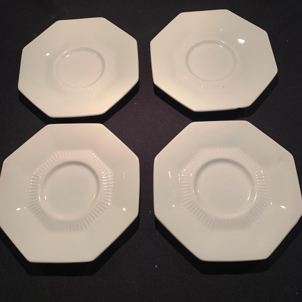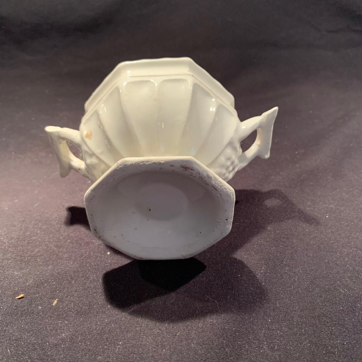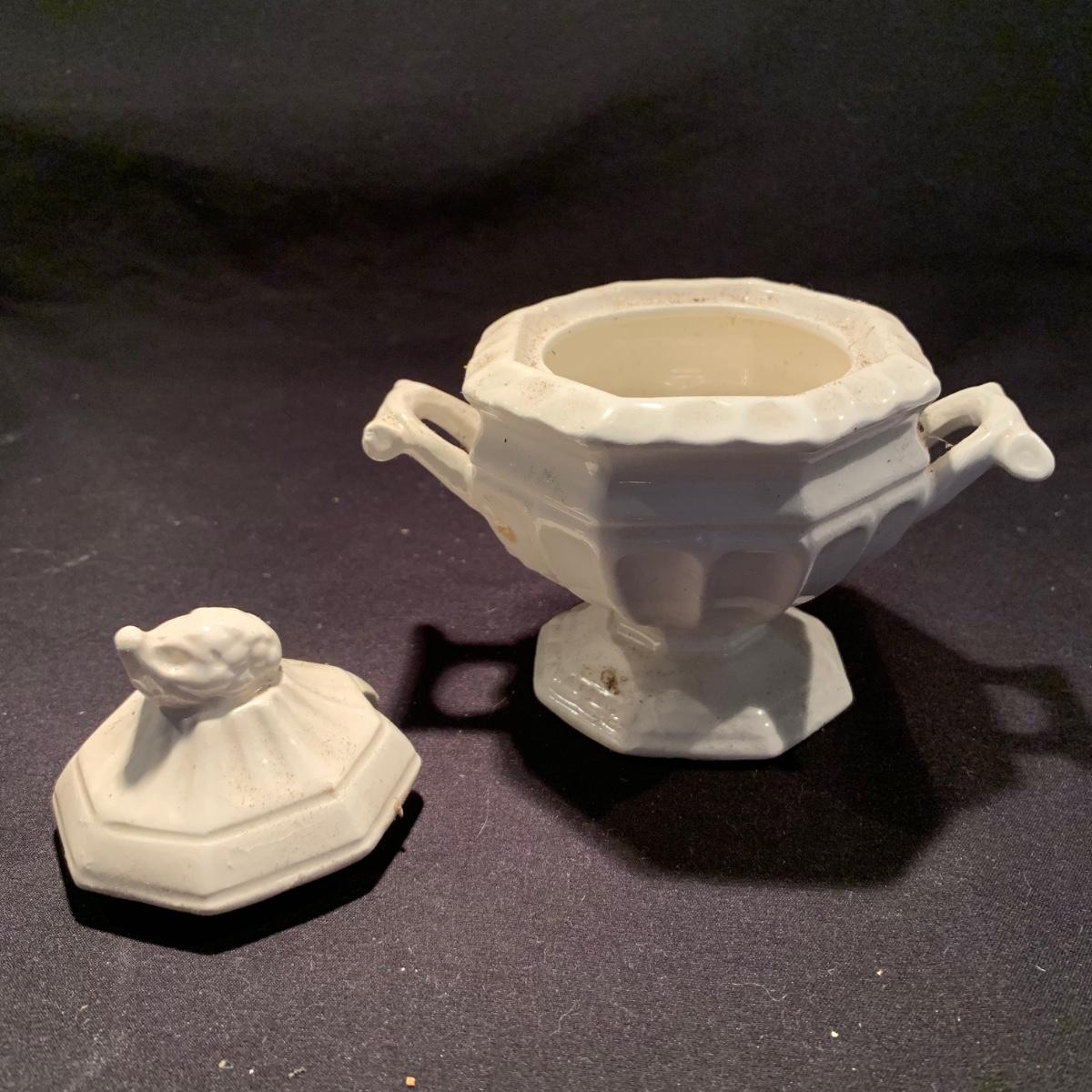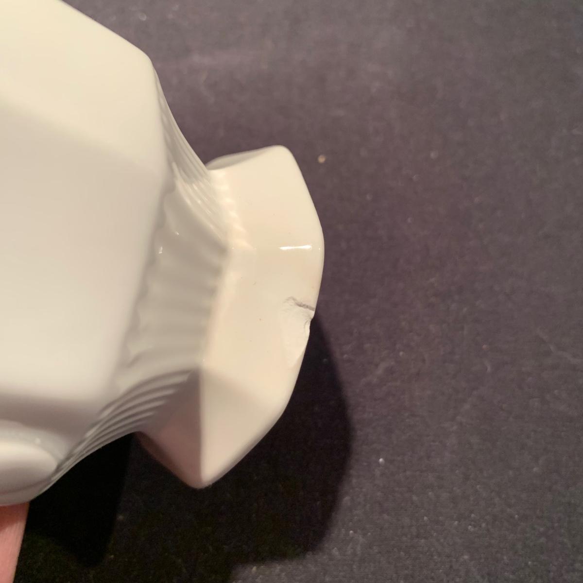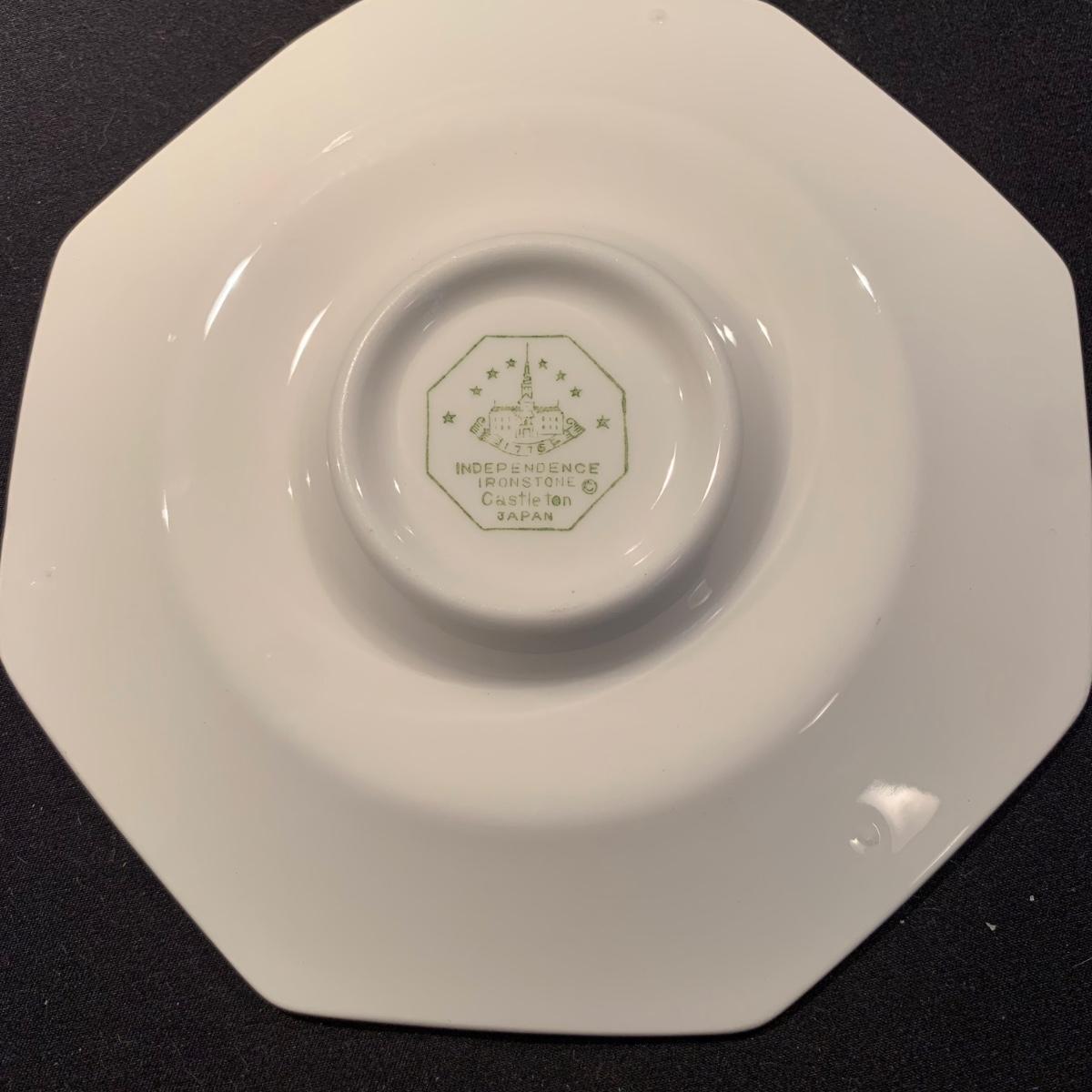 This lot includes a set of white ceramic Castleton set. Included are small plates, serving dishes, tea cups, a pitcher, and more. Some of the pieces have chips and signs of cracks (see photos). The largest piece measures about 8in x 7.5in. The pitcher is a Wm. Adams & Sons piece, rather than a Castleton. The small lidded dish is unmarked, so we cannot confirm its maker. Shipping available.