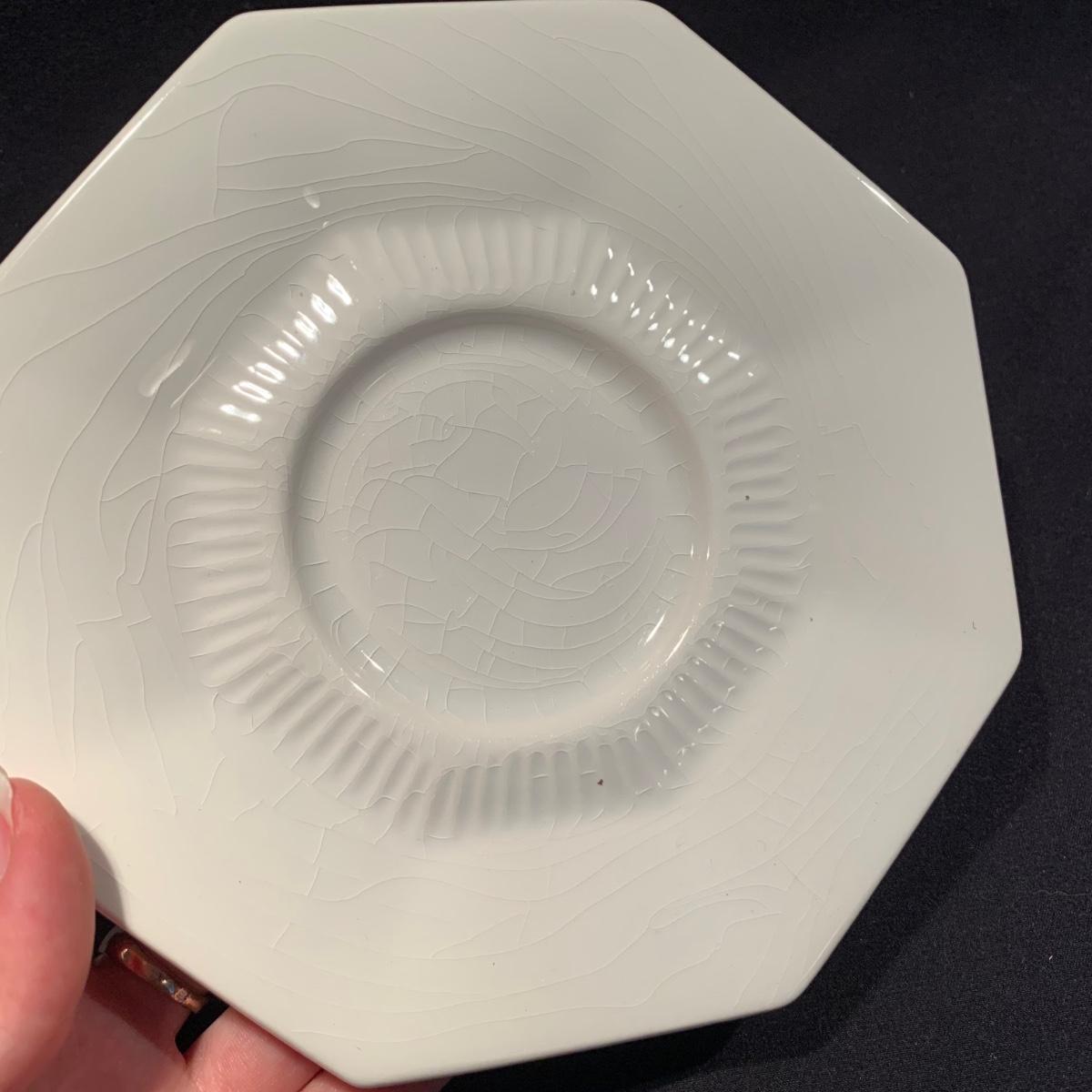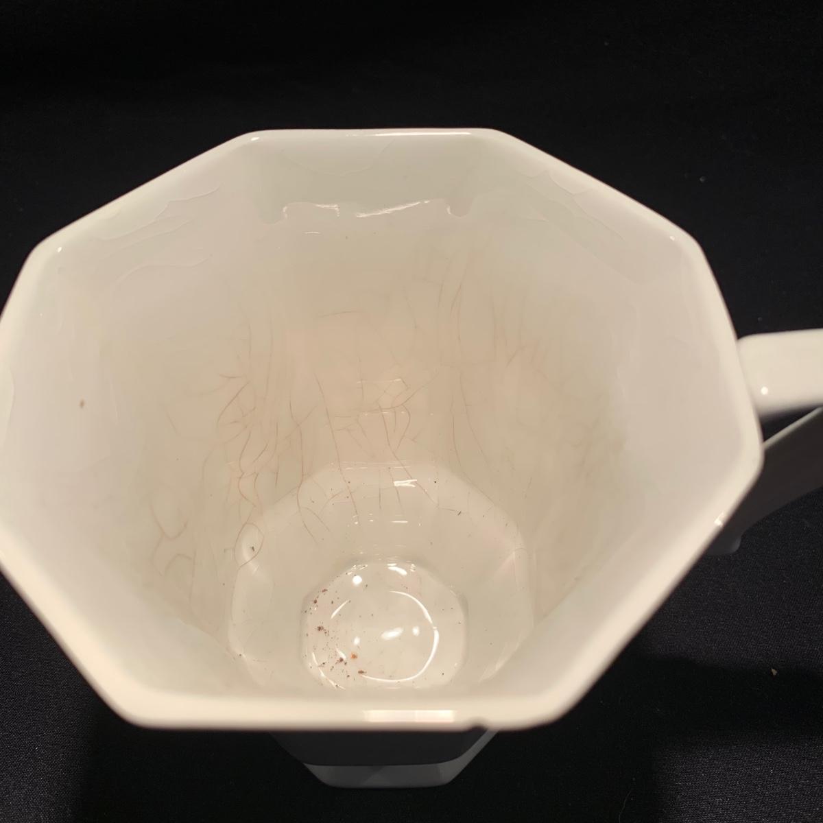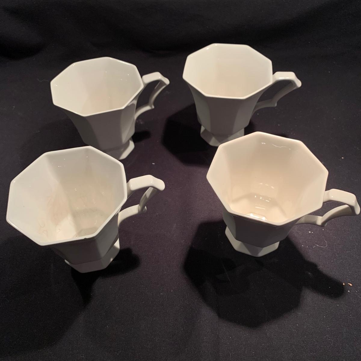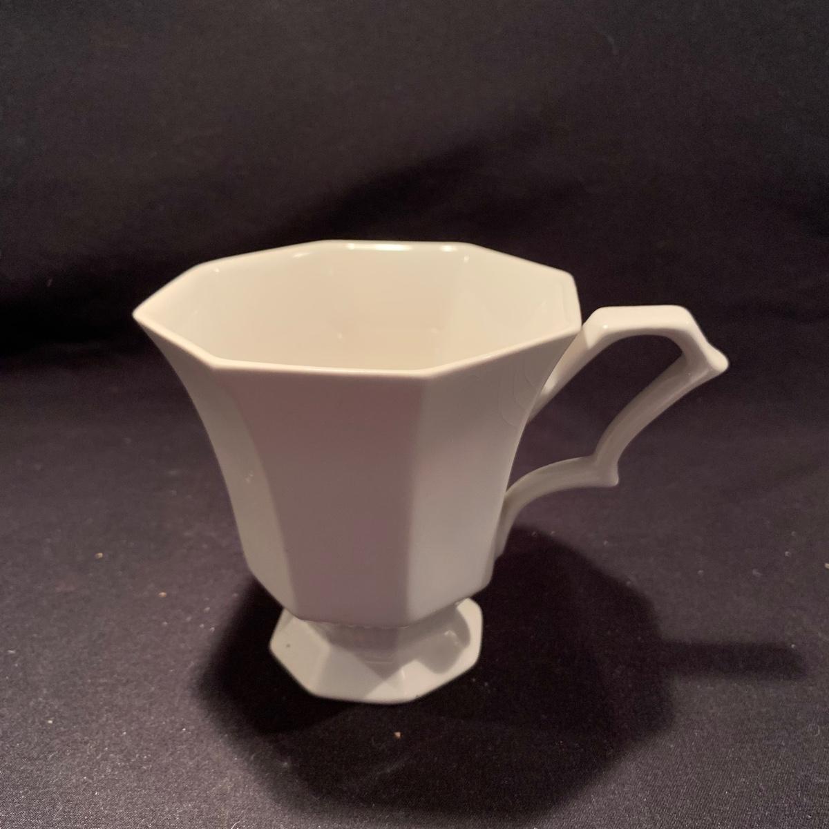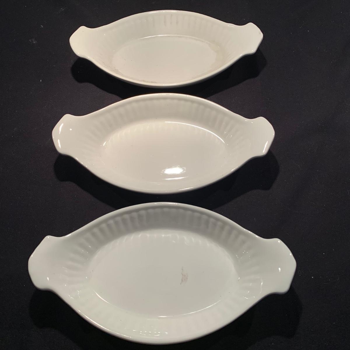 This lot includes a set of white ceramic Castleton set. Included are small plates, serving dishes, tea cups, a pitcher, and more. Some of the pieces have chips and signs of cracks (see photos). The largest piece measures about 8in x 7.5in. The pitcher is a Wm. Adams & Sons piece, rather than a Castleton. The small lidded dish is unmarked, so we cannot confirm its maker. Shipping available.