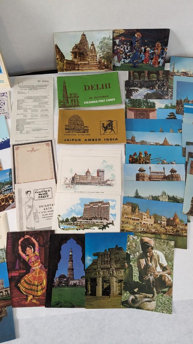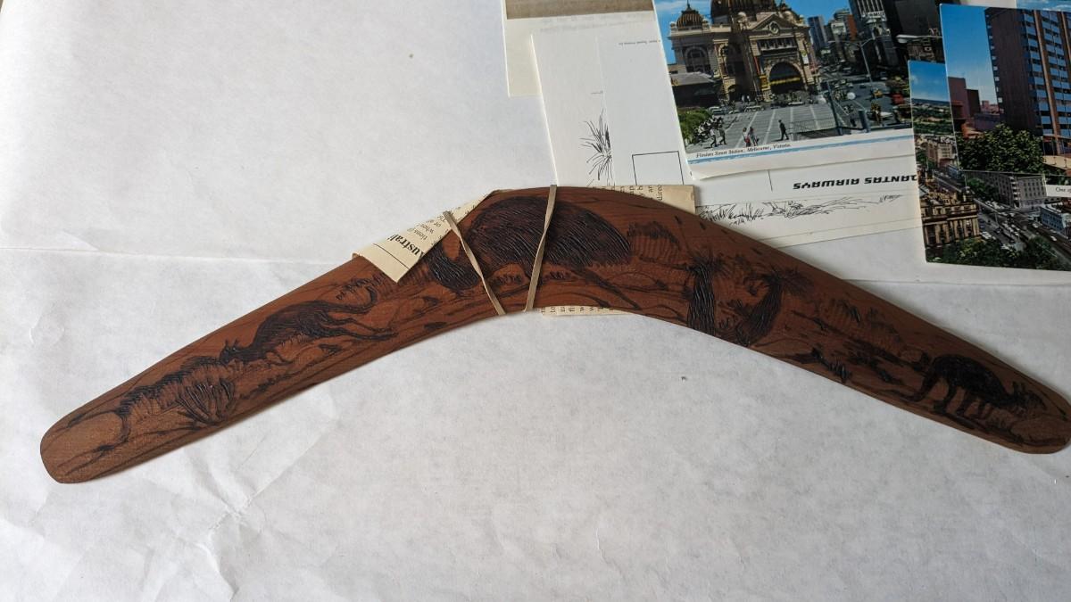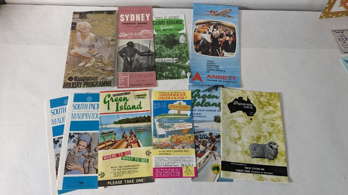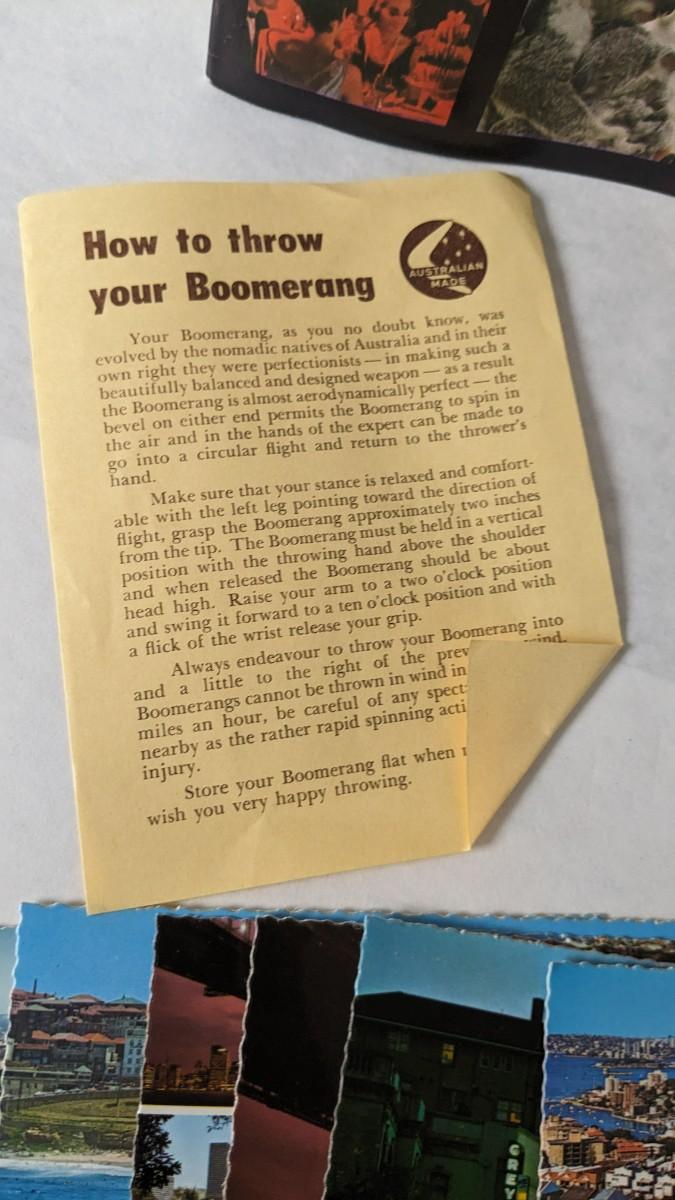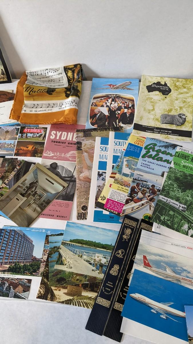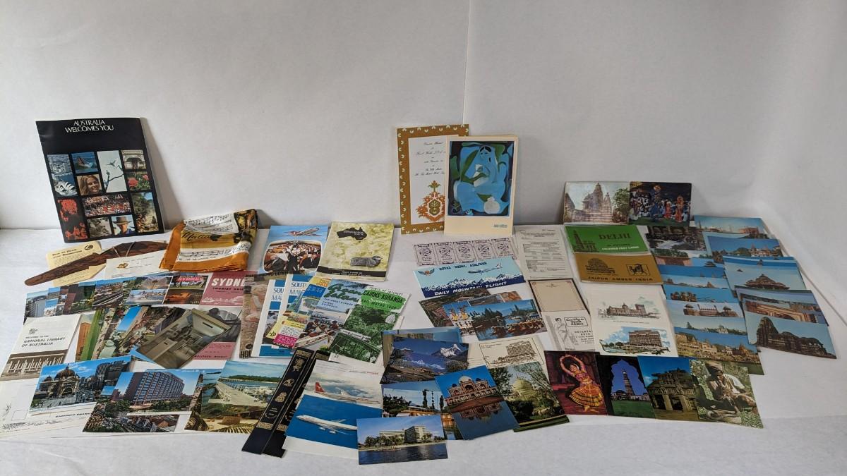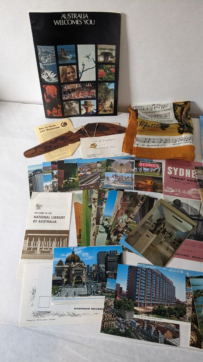 a beautiful display of travelling ephemera and postcards from the late 70's early 80's. Includes incredible slides, postcard books, mainly unused loose postcards, various travel ephemera, a bona fide boomerang, beautiful scarf, original muslin bag for shipping, and so much more! Very neat little assortment from both areas of the world!