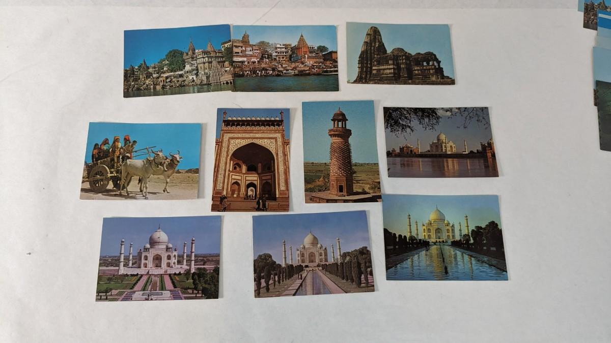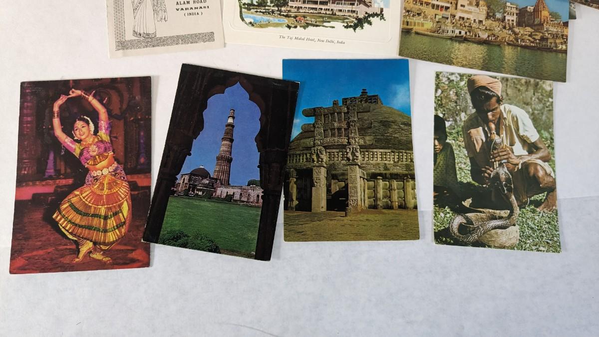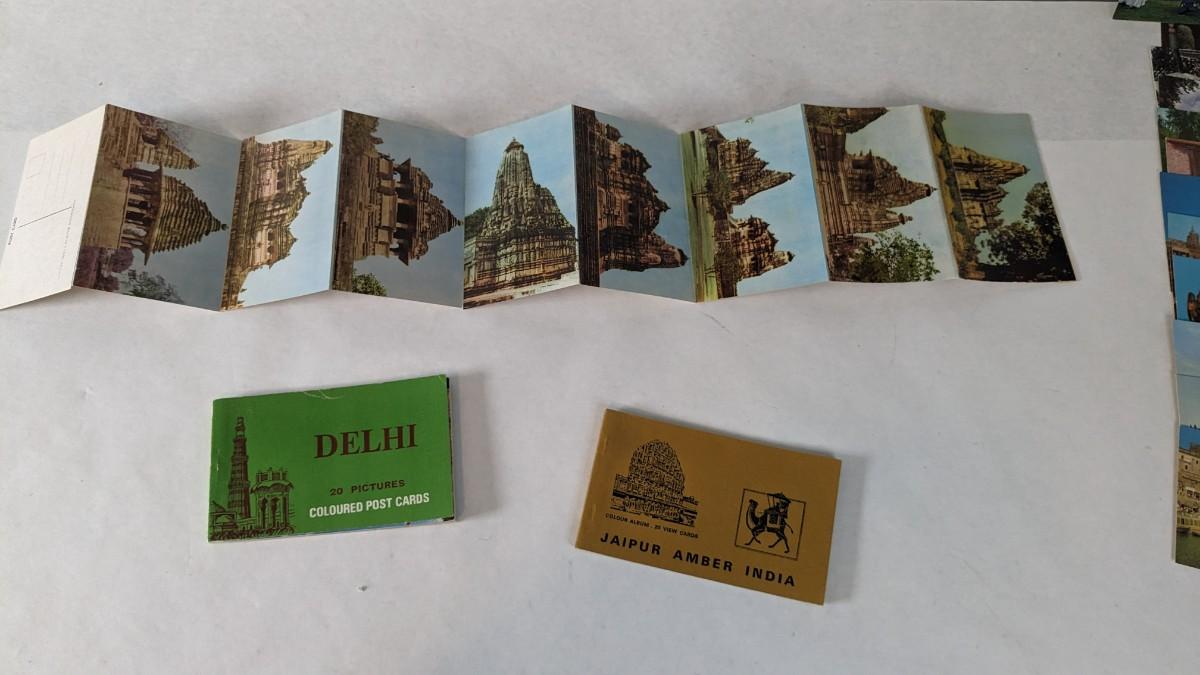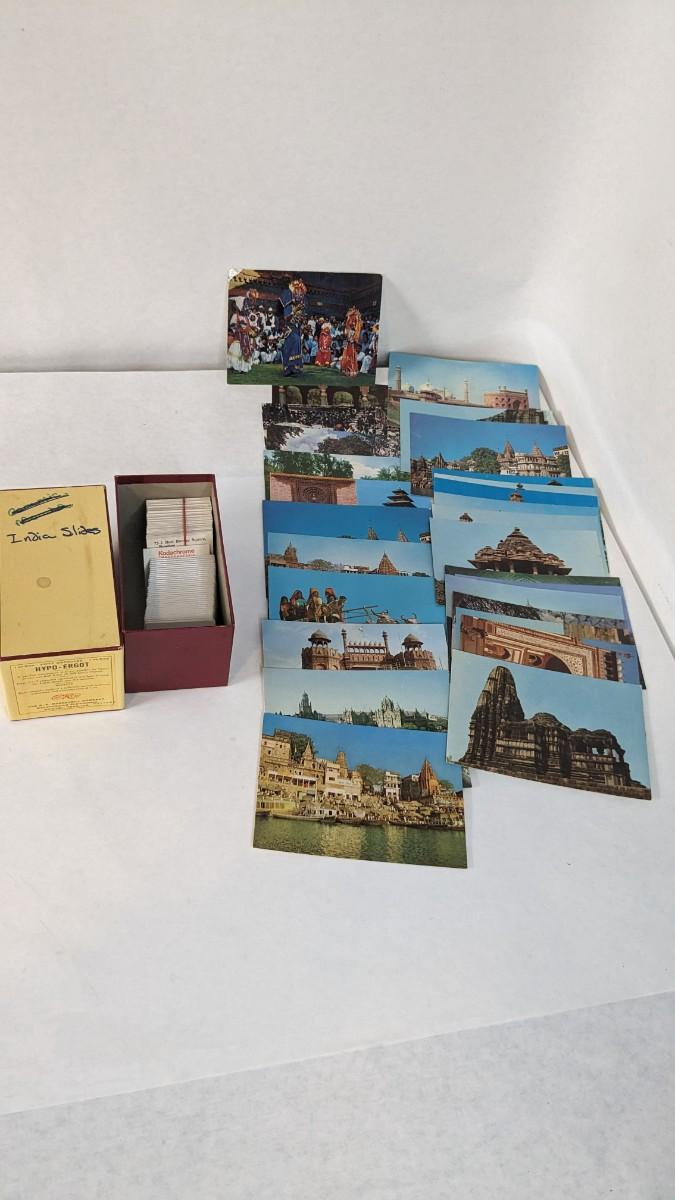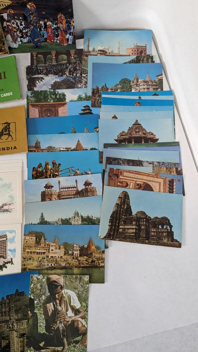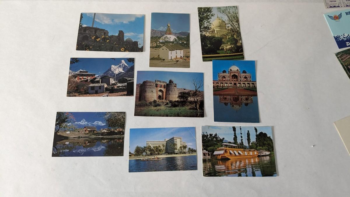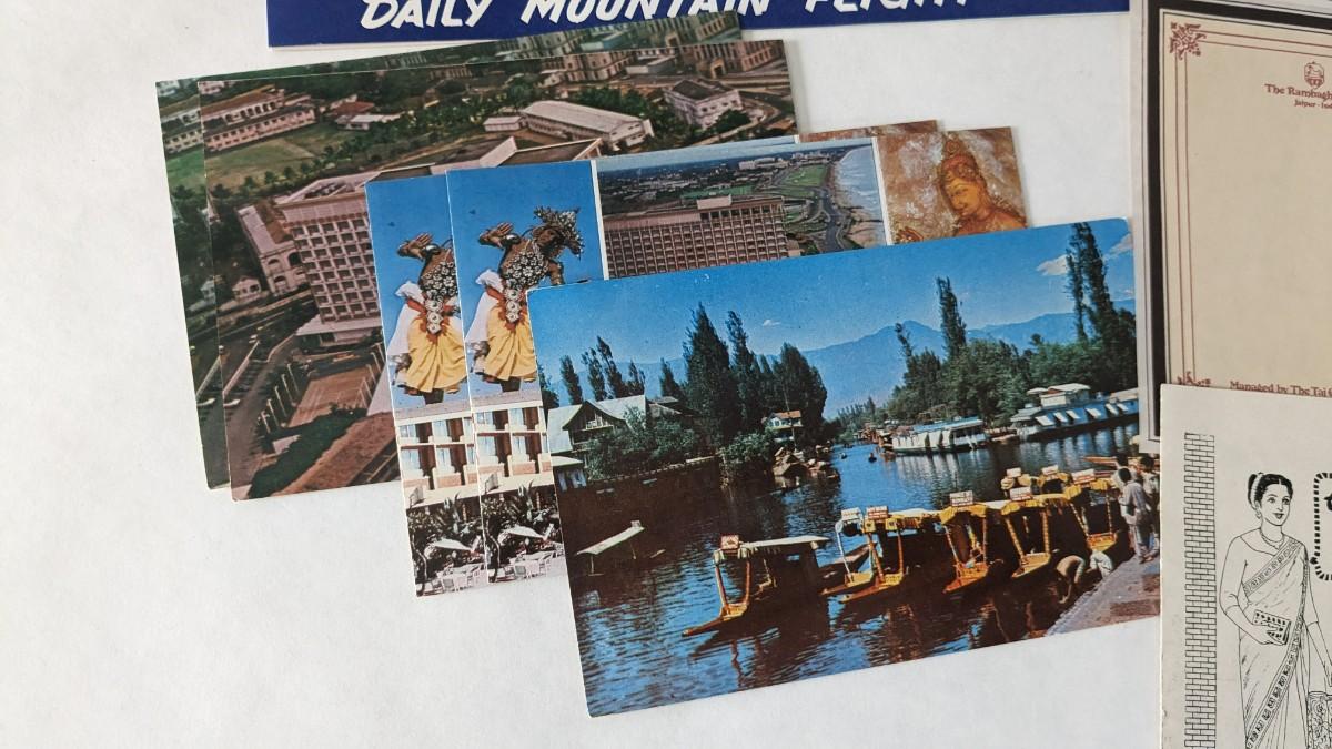 a beautiful display of travelling ephemera and postcards from the late 70's early 80's. Includes incredible slides, postcard books, mainly unused loose postcards, various travel ephemera, a bona fide boomerang, beautiful scarf, original muslin bag for shipping, and so much more! Very neat little assortment from both areas of the world!