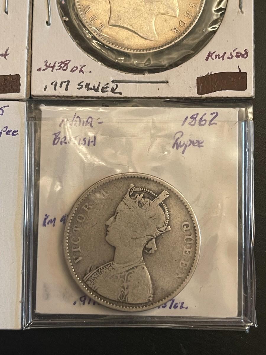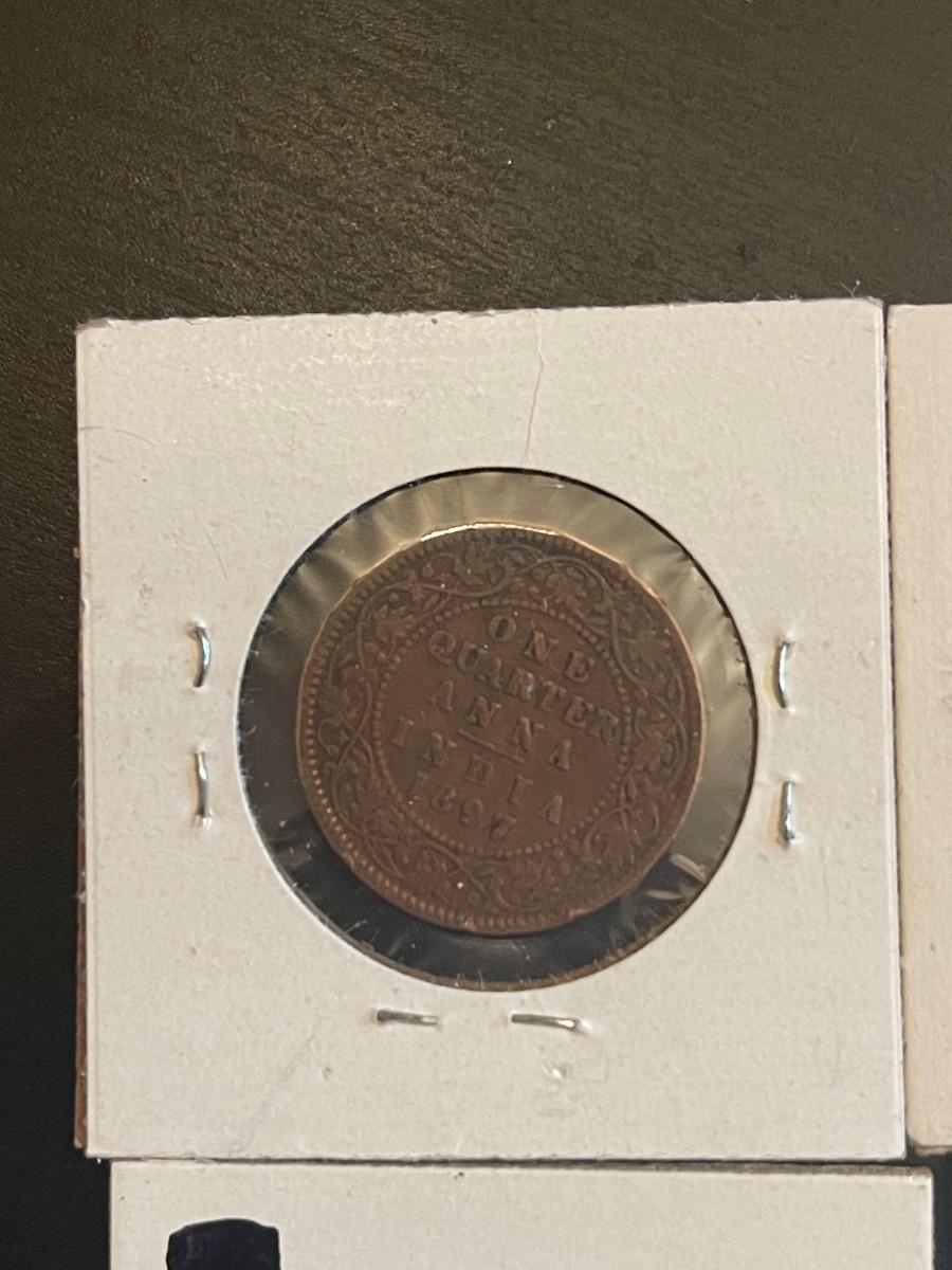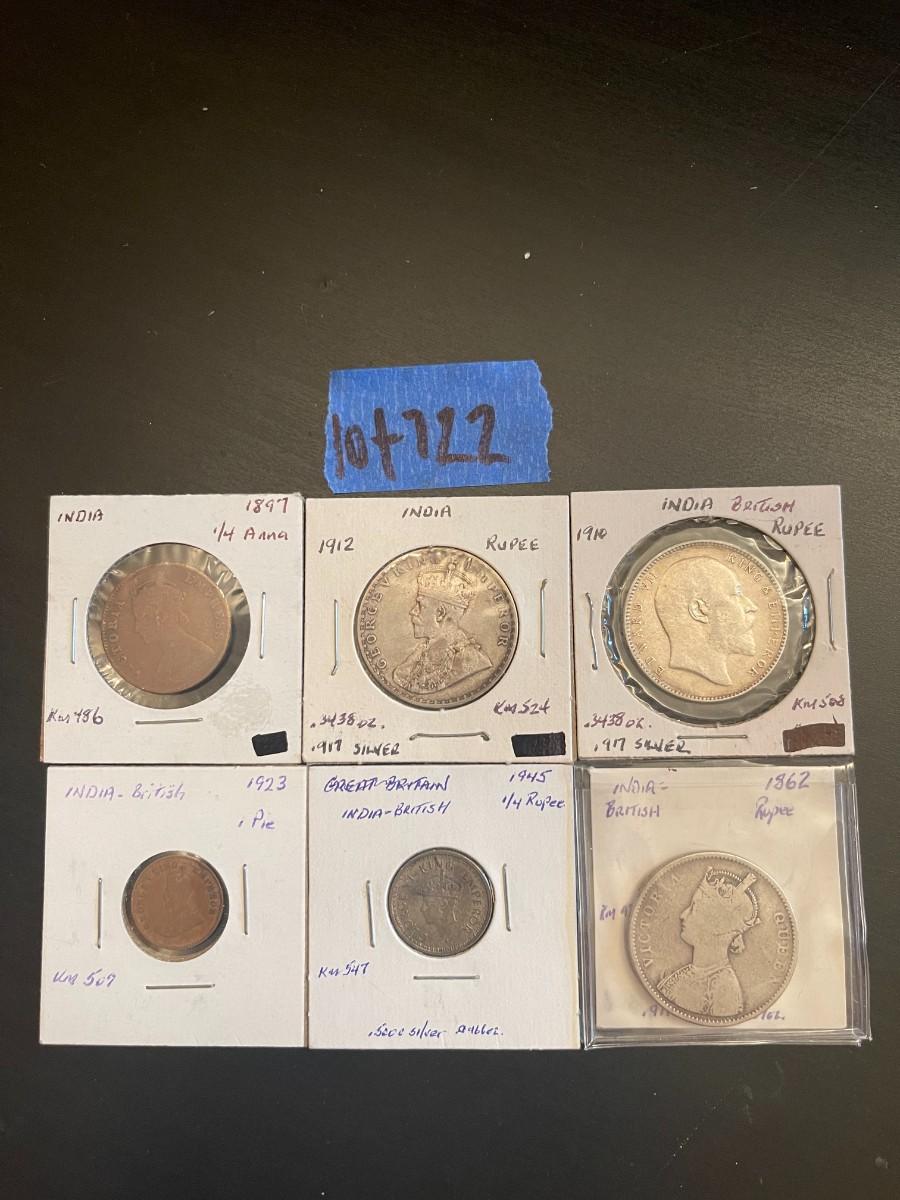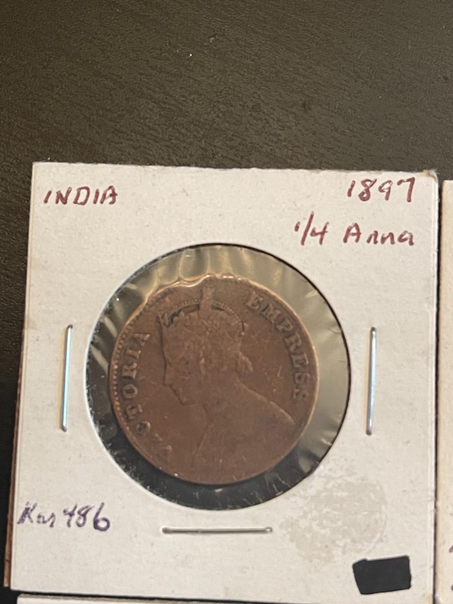 (6) Vintage India Coins - 1897 1/4 anna, 1912 rupee, 1910 British rupee, 1923 British pice, Great Britian Indian 1945 1/4 rupee, 1862 British rupee.