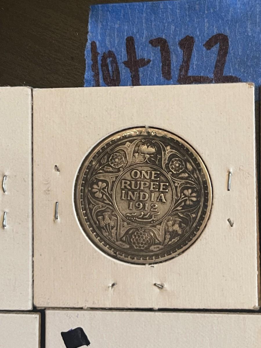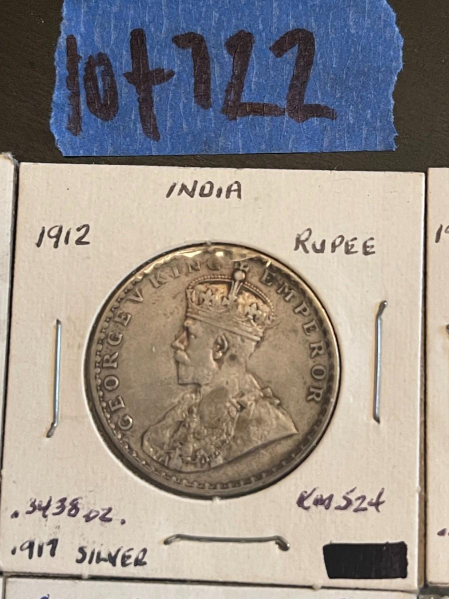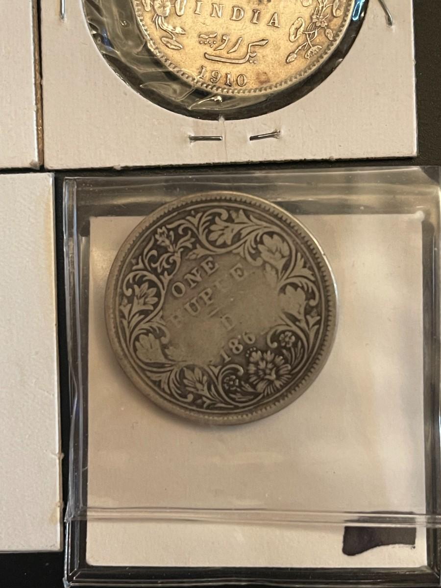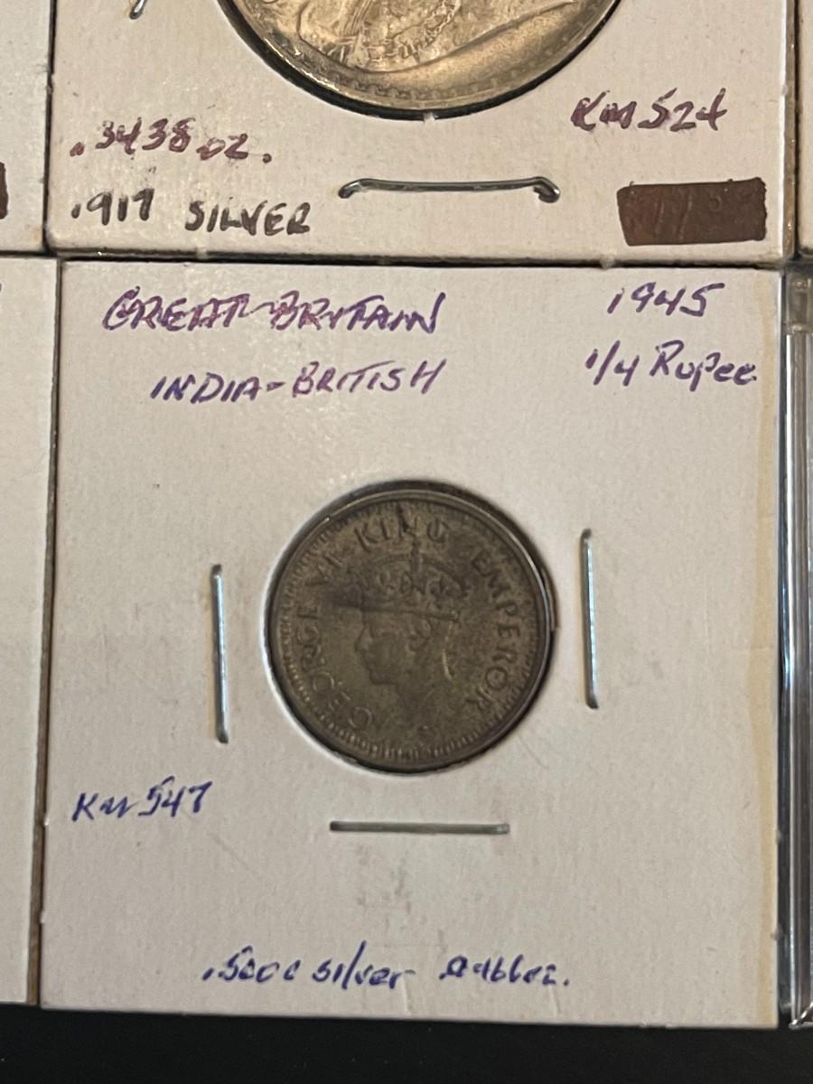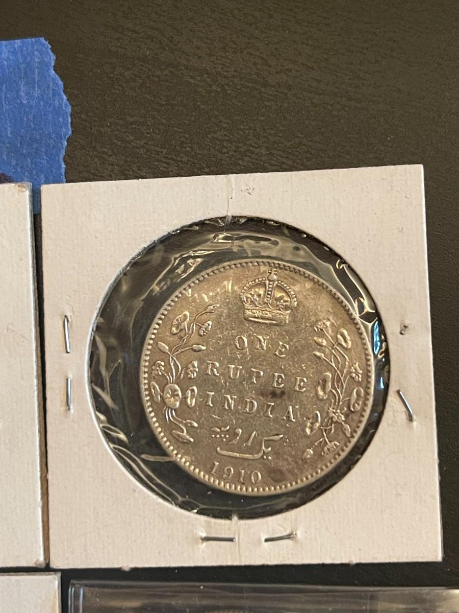 (6) Vintage India Coins - 1897 1/4 anna, 1912 rupee, 1910 British rupee, 1923 British pice, Great Britian Indian 1945 1/4 rupee, 1862 British rupee.