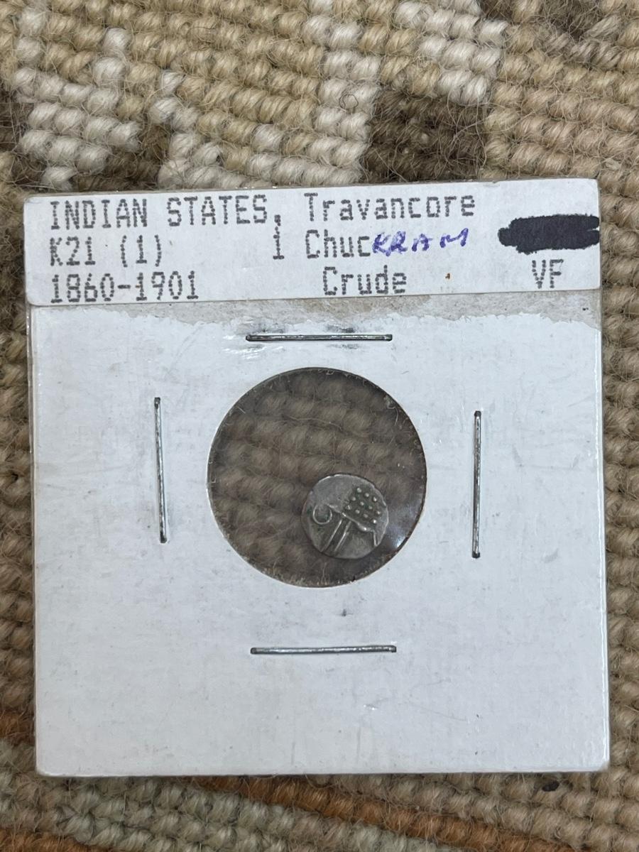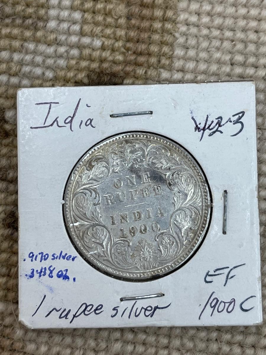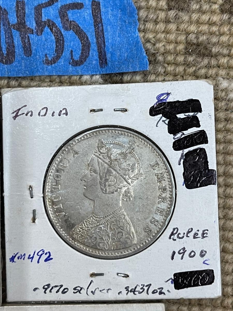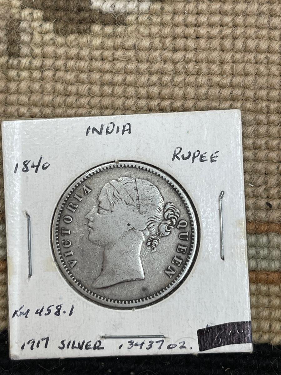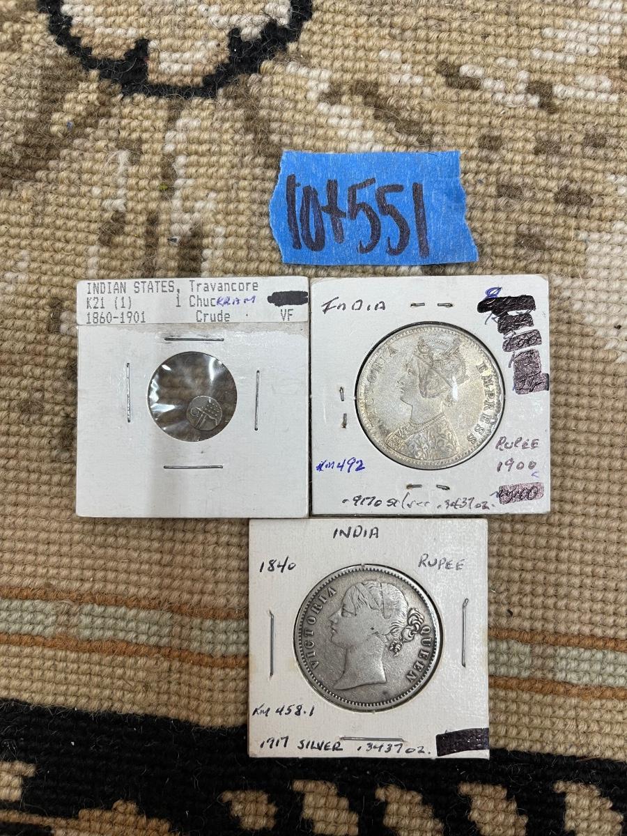 (3) antique India coins - 1860-1901 crude 1 kram, 1900 rupee, 1840 rupee.