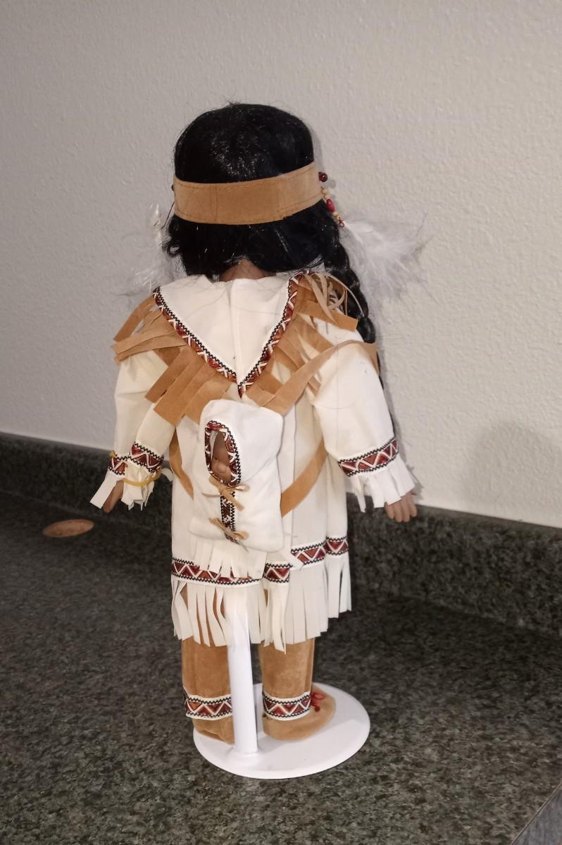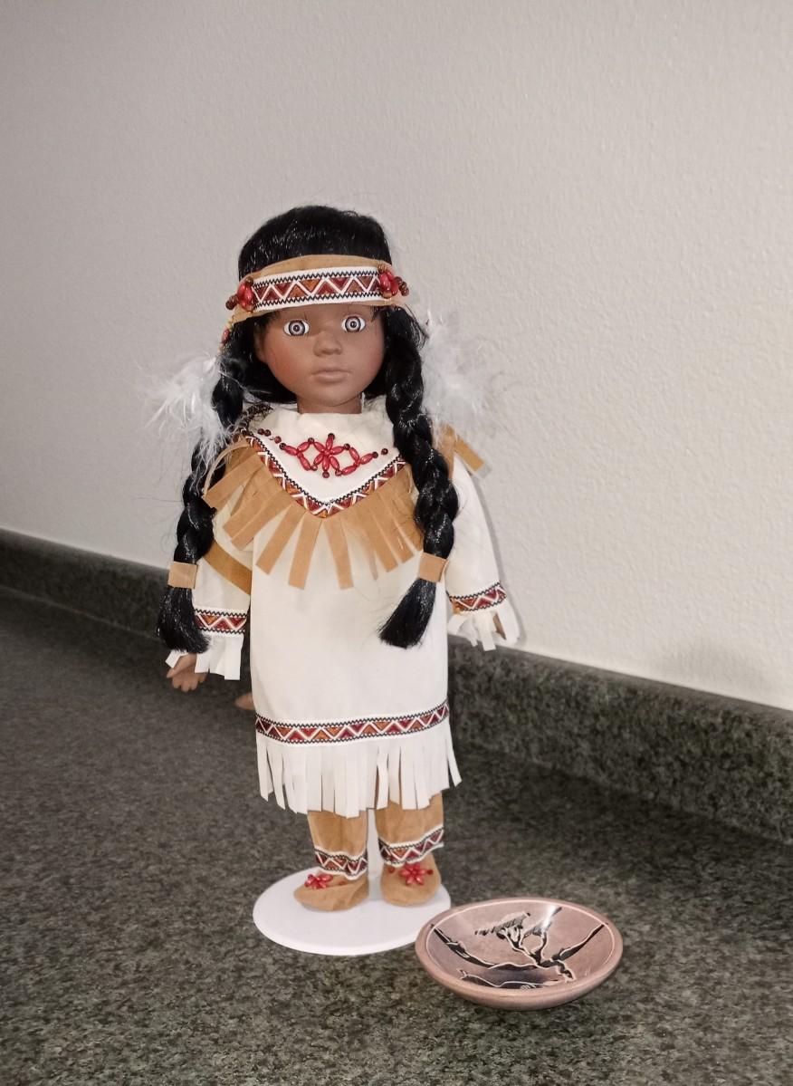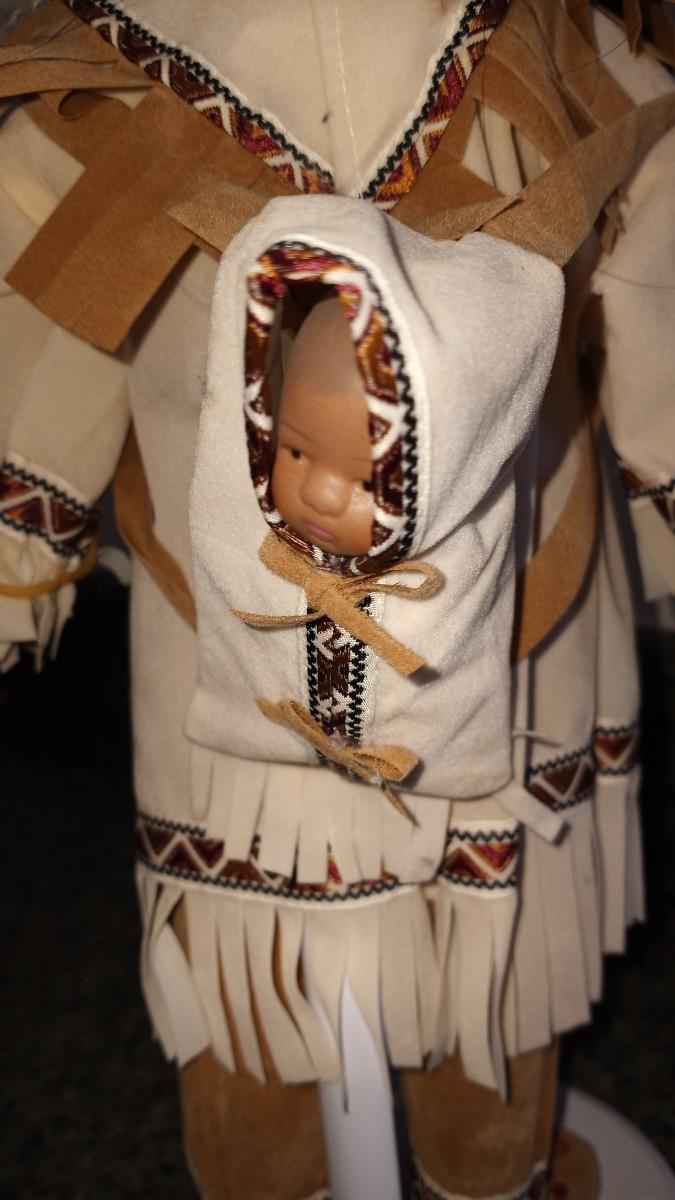 INDIAN DOLL WITH BABY ON BACK APPROX. 18 TALL DISH 4" ROUD