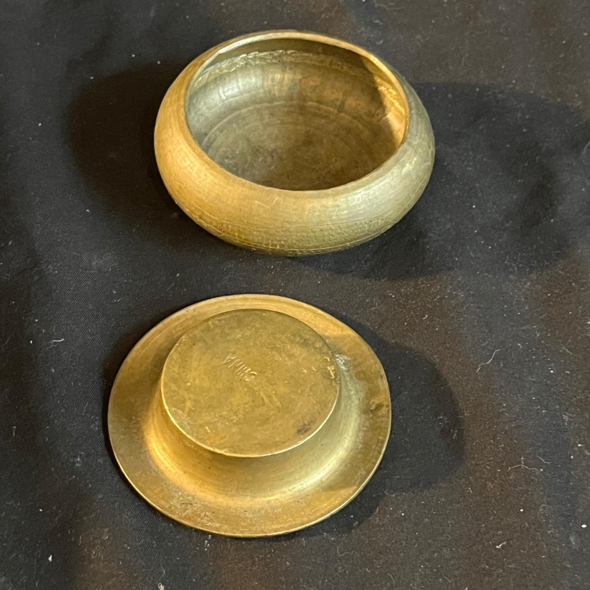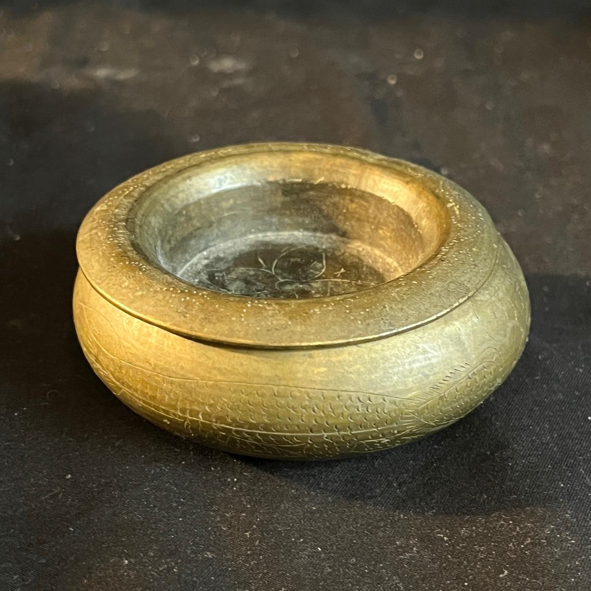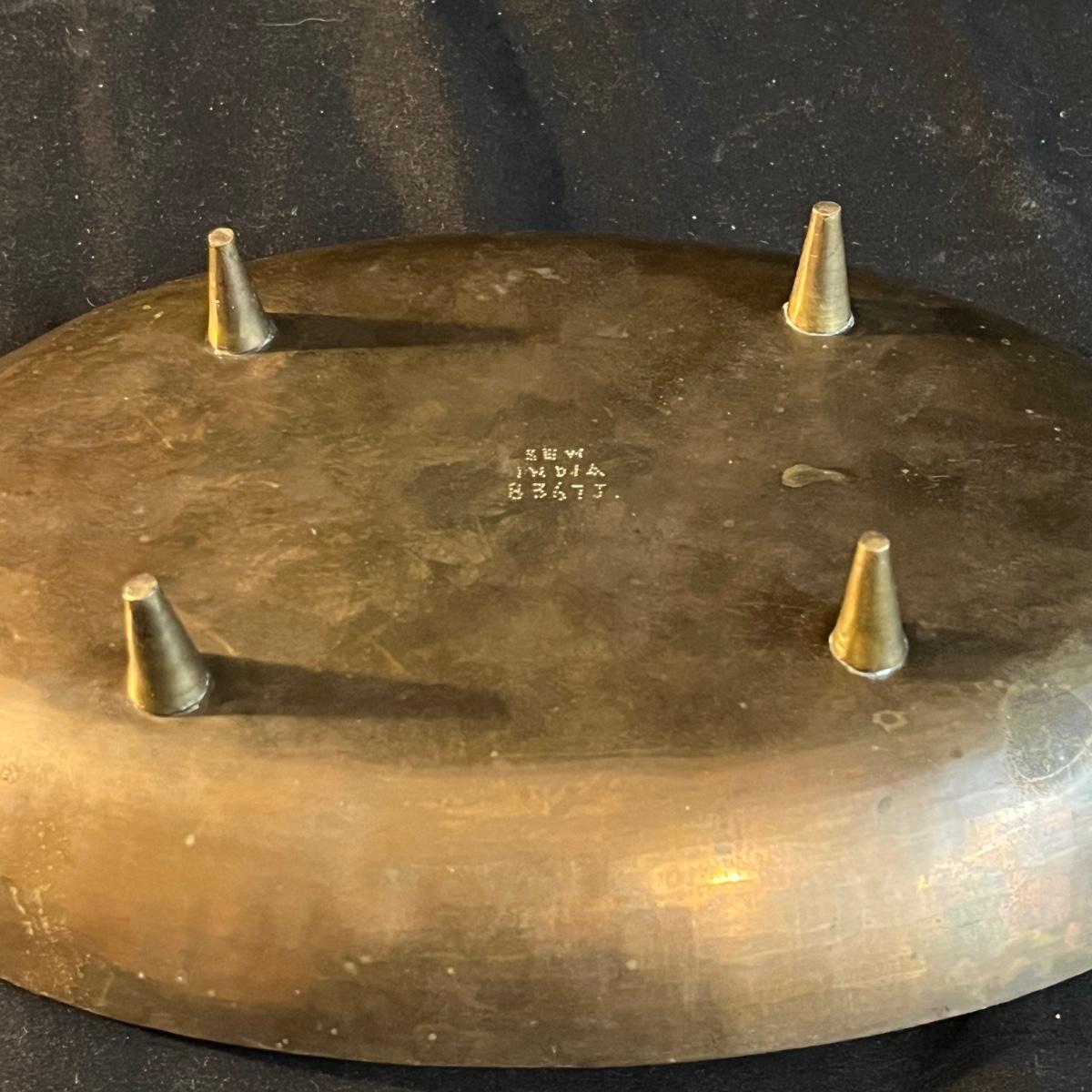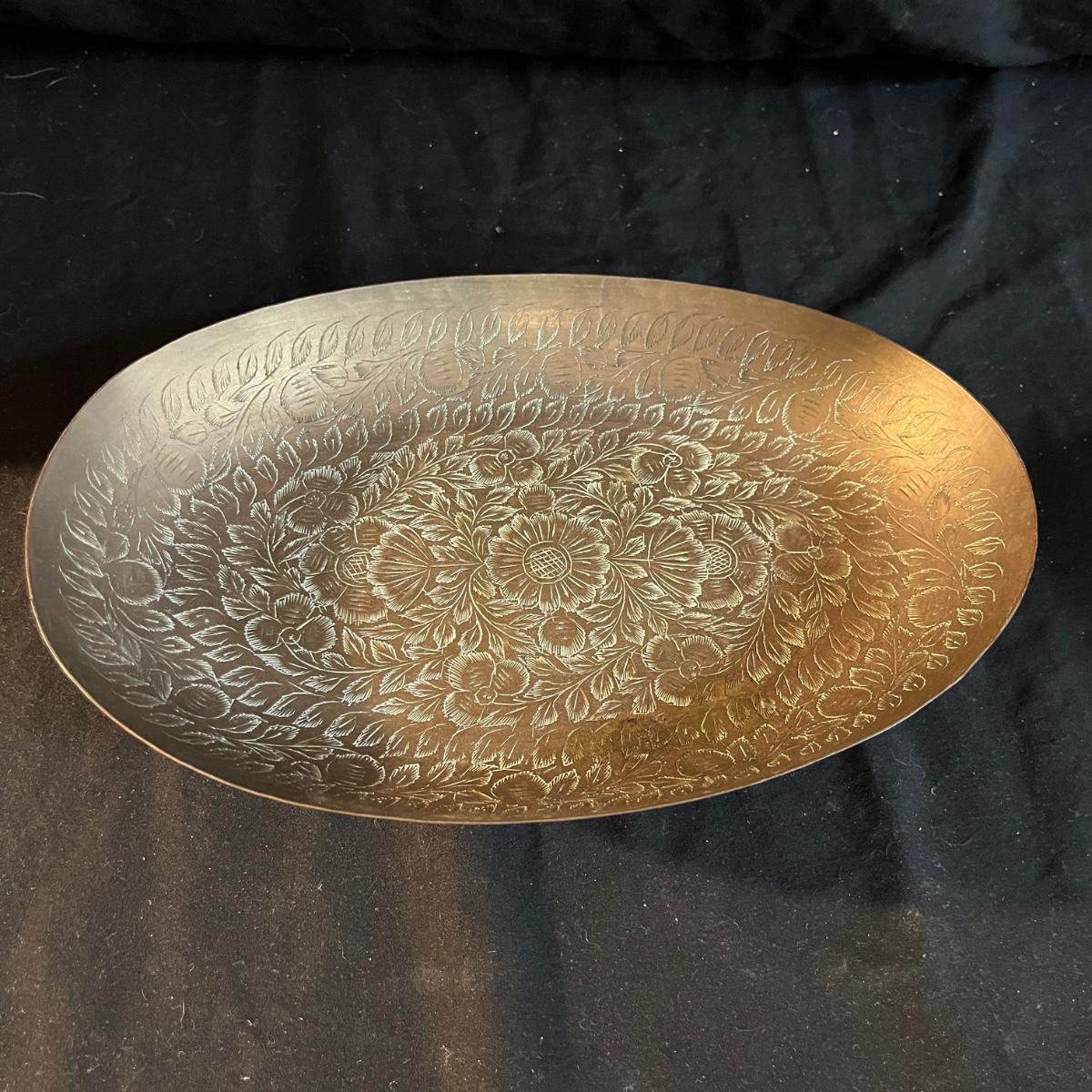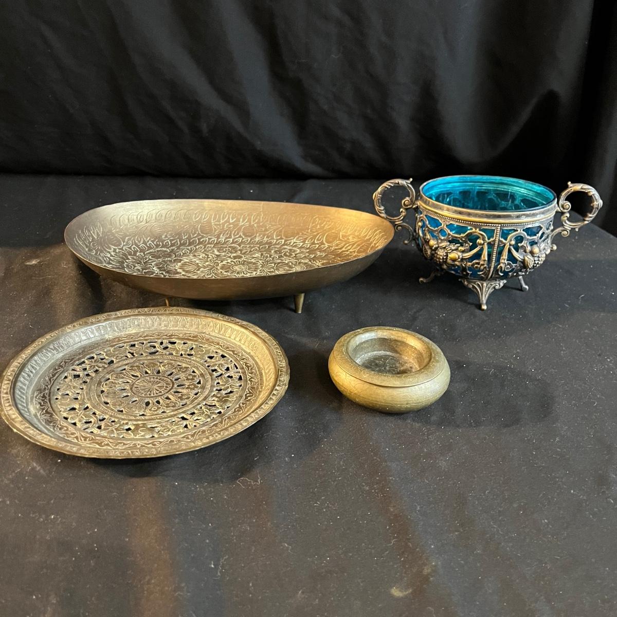 Lot includes a metal engraved bowl that is marked India, metal with blue glass insert, copper plate, brass nesting dish with lid that is missing the inserts and a metal tea scoop. Largest bowl measures 10” x 7” x 2”H.