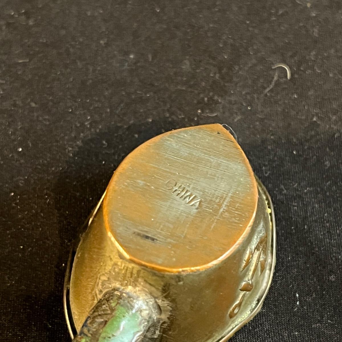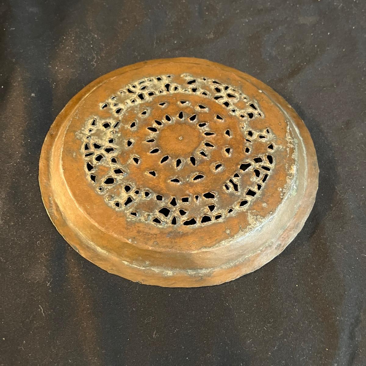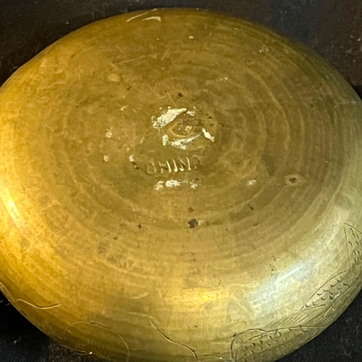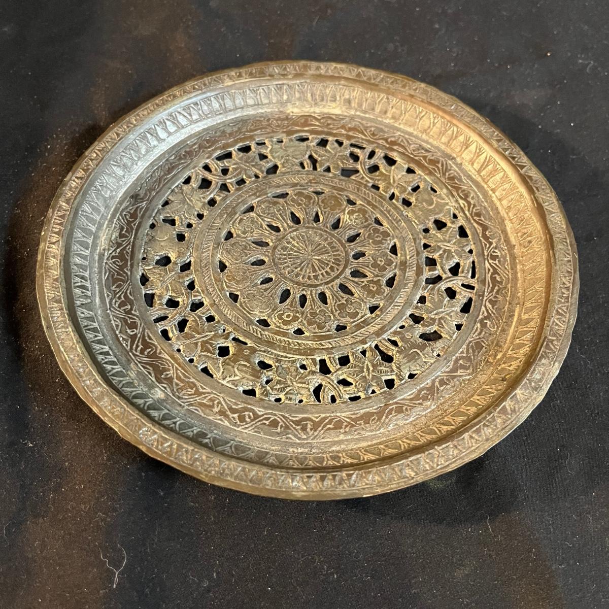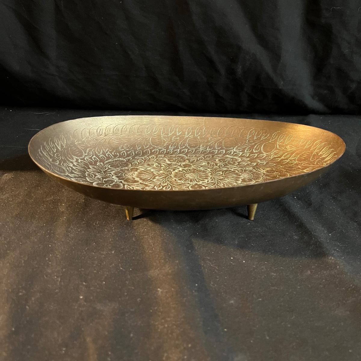 Lot includes a metal engraved bowl that is marked India, metal with blue glass insert, copper plate, brass nesting dish with lid that is missing the inserts and a metal tea scoop. Largest bowl measures 10” x 7” x 2”H.