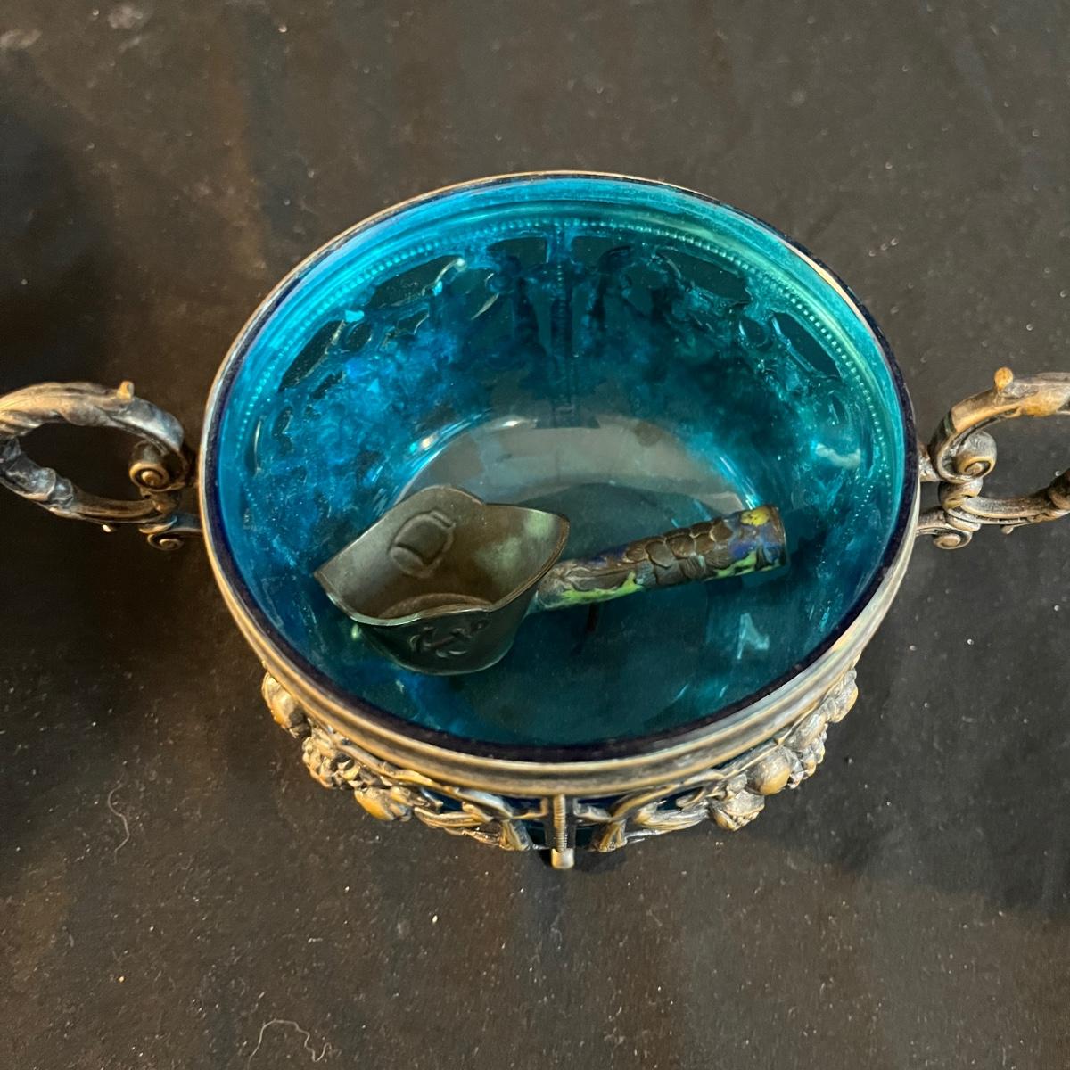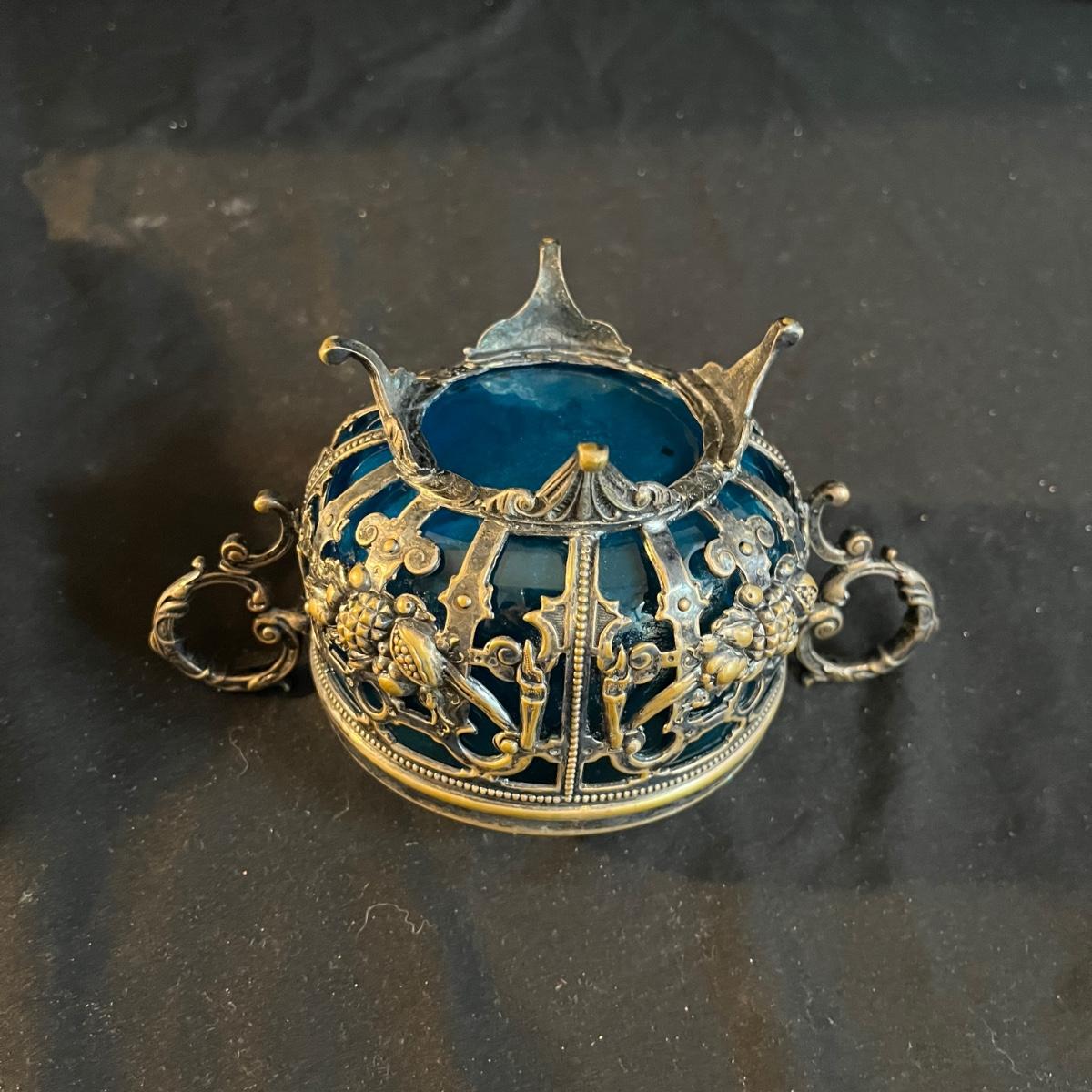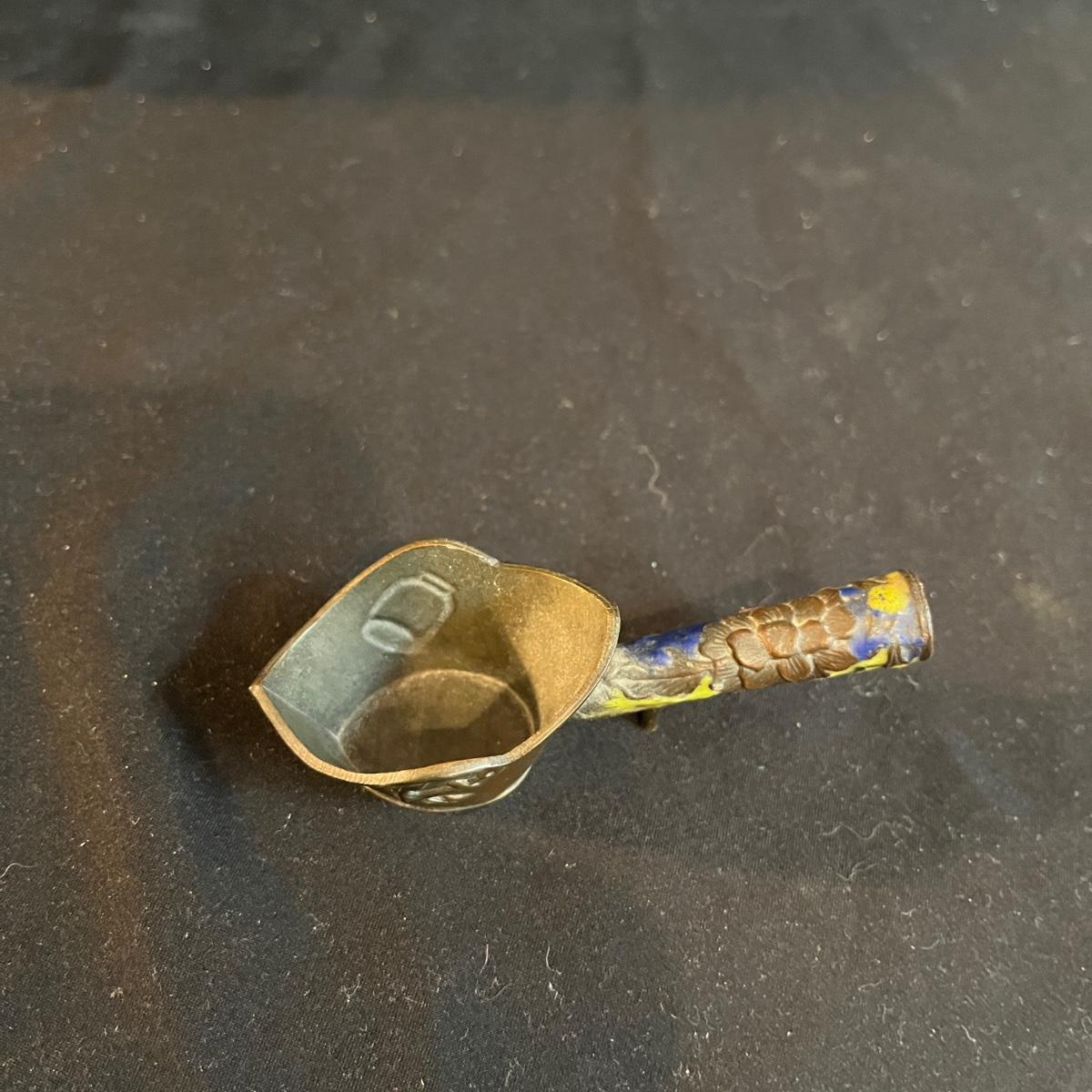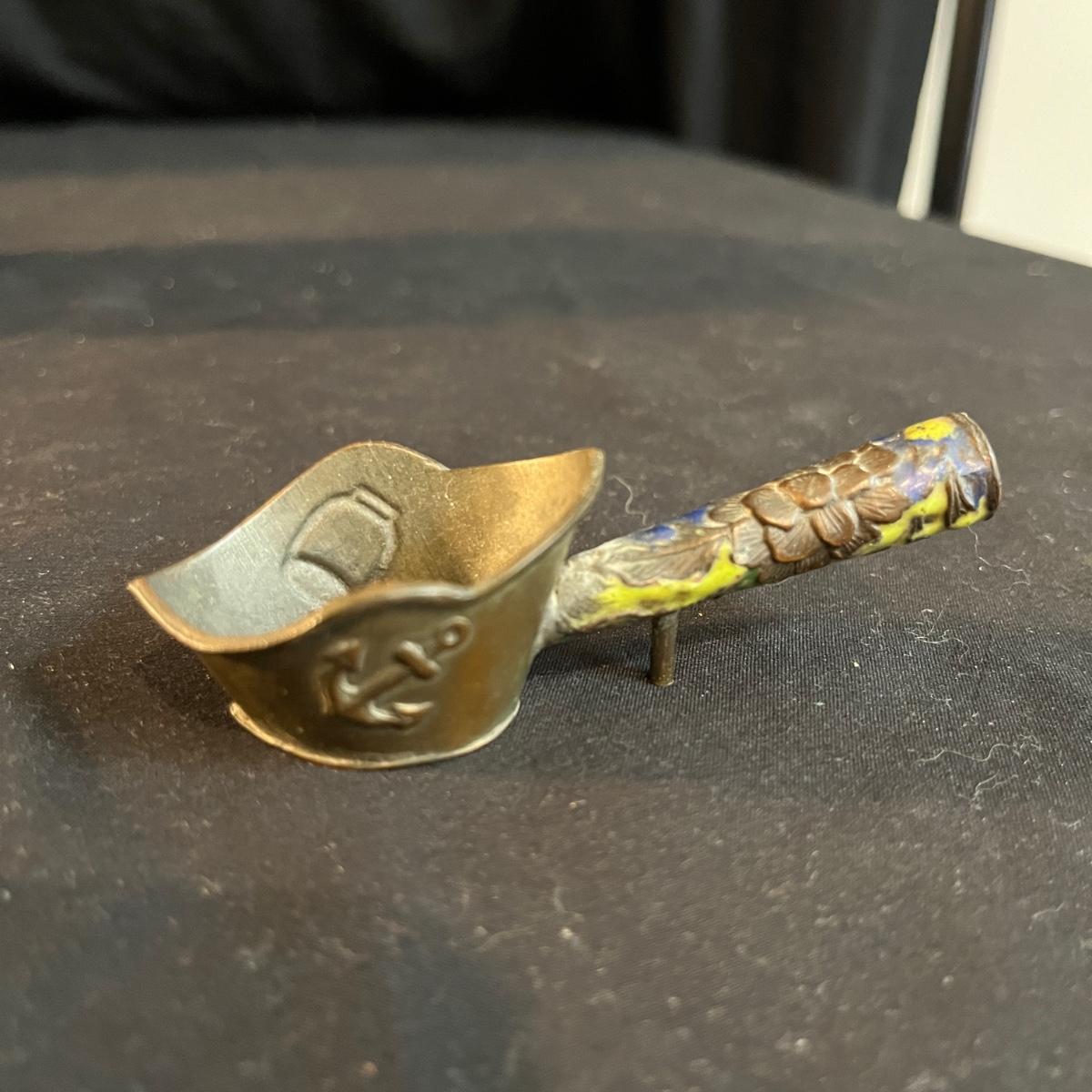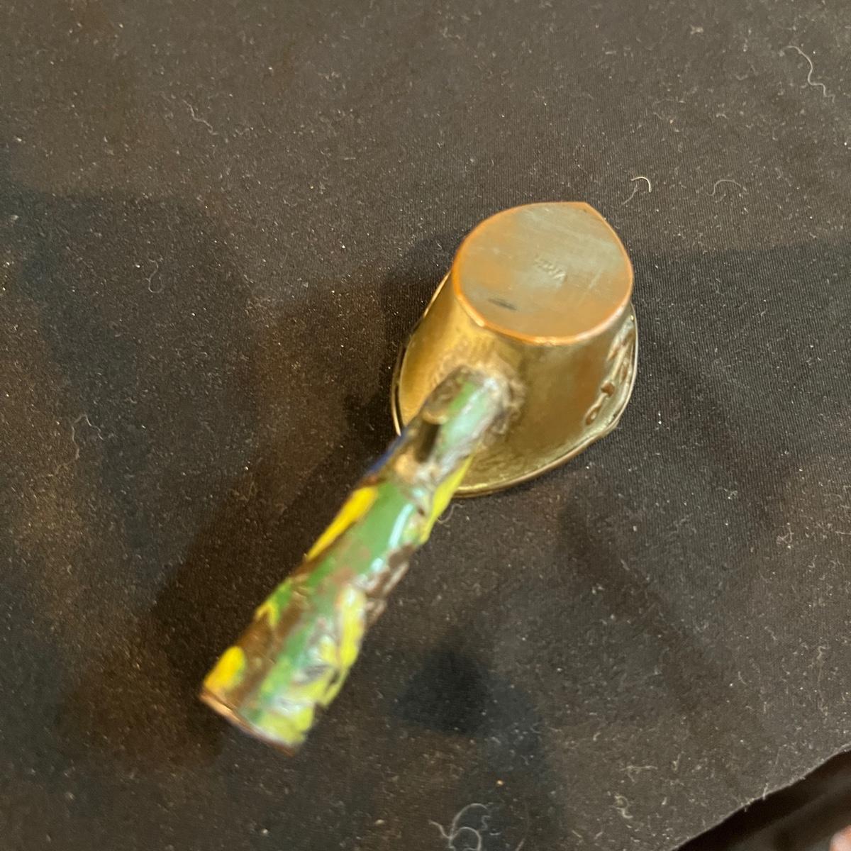 Lot includes a metal engraved bowl that is marked India, metal with blue glass insert, copper plate, brass nesting dish with lid that is missing the inserts and a metal tea scoop. Largest bowl measures 10” x 7” x 2”H.