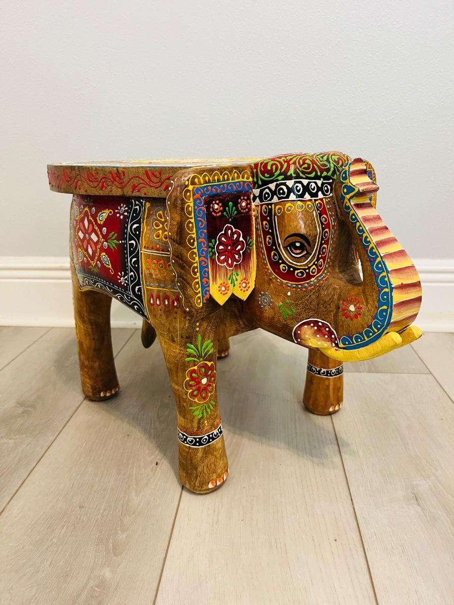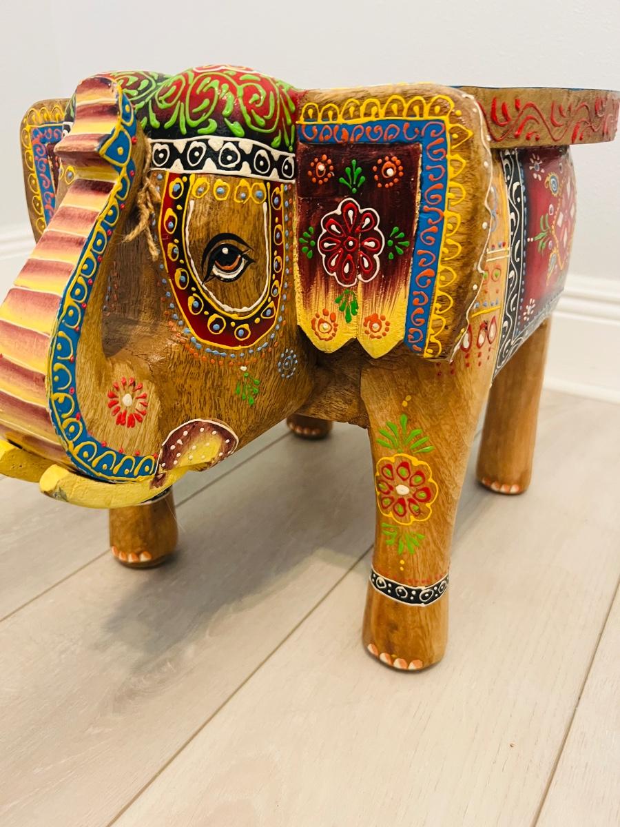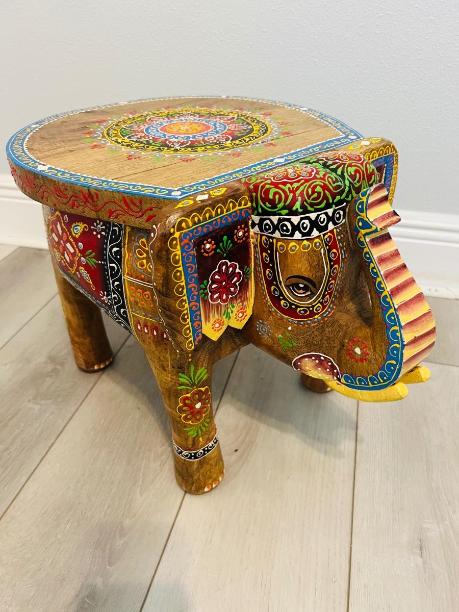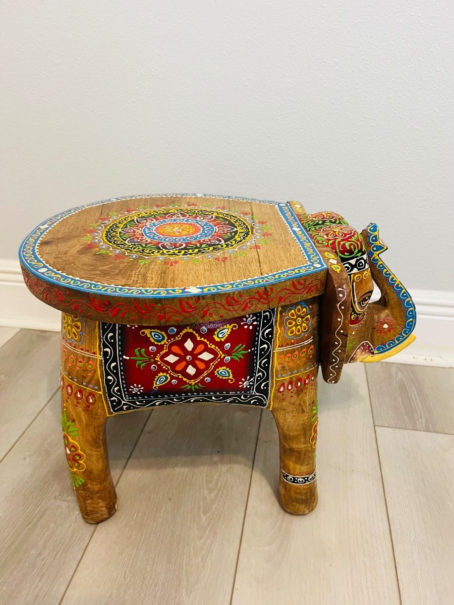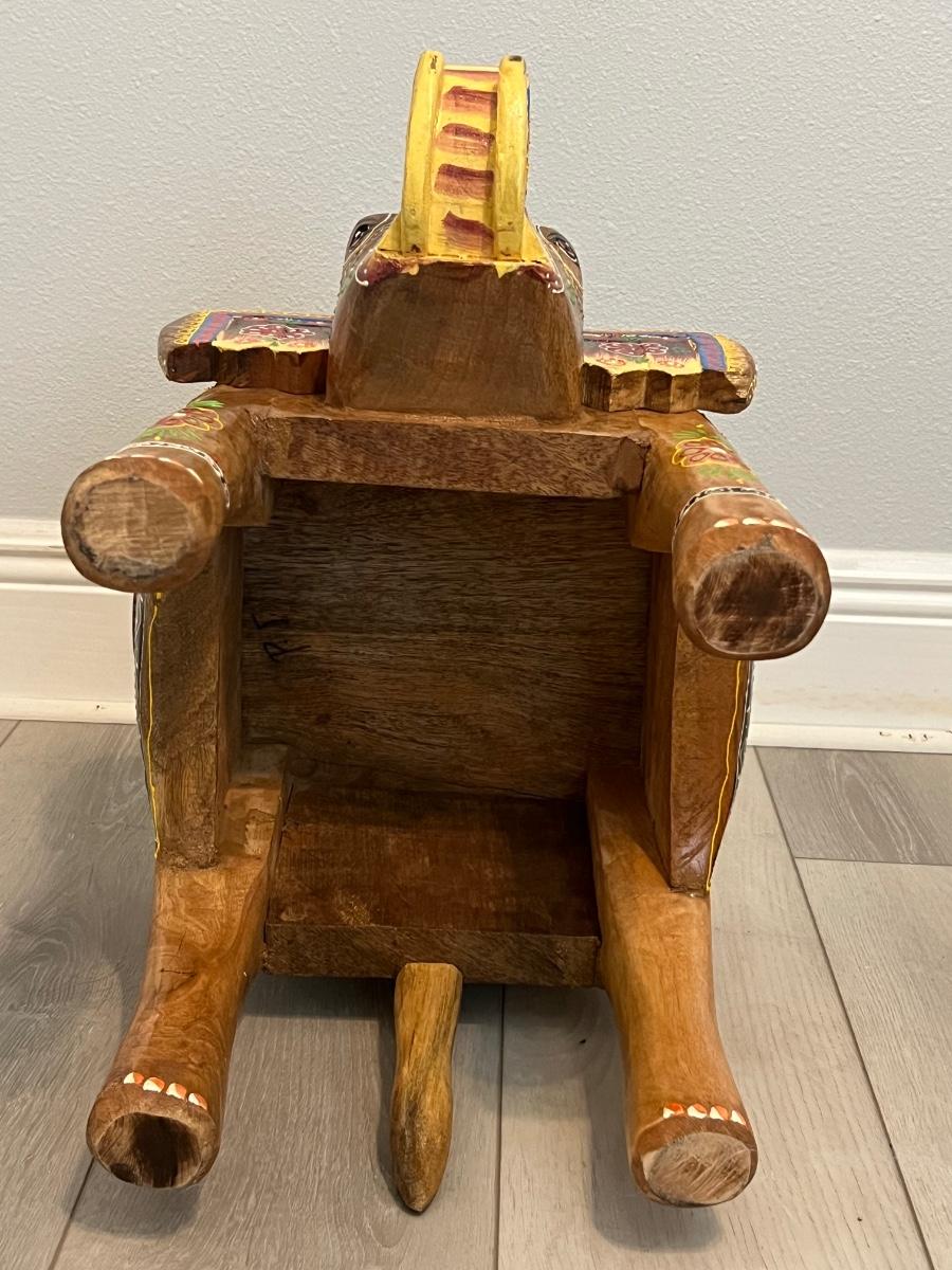 Indian Hand Carved Wooden Elephant stool. This is solid wood. Painted with vibrant colors. This is a really awesome find! Measures 13 1/2 inches tall, 18 inches deep and 13 1/2 inches wide. Like brand new!
