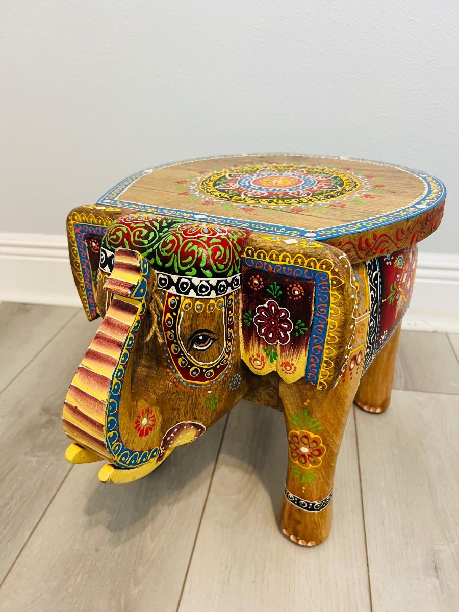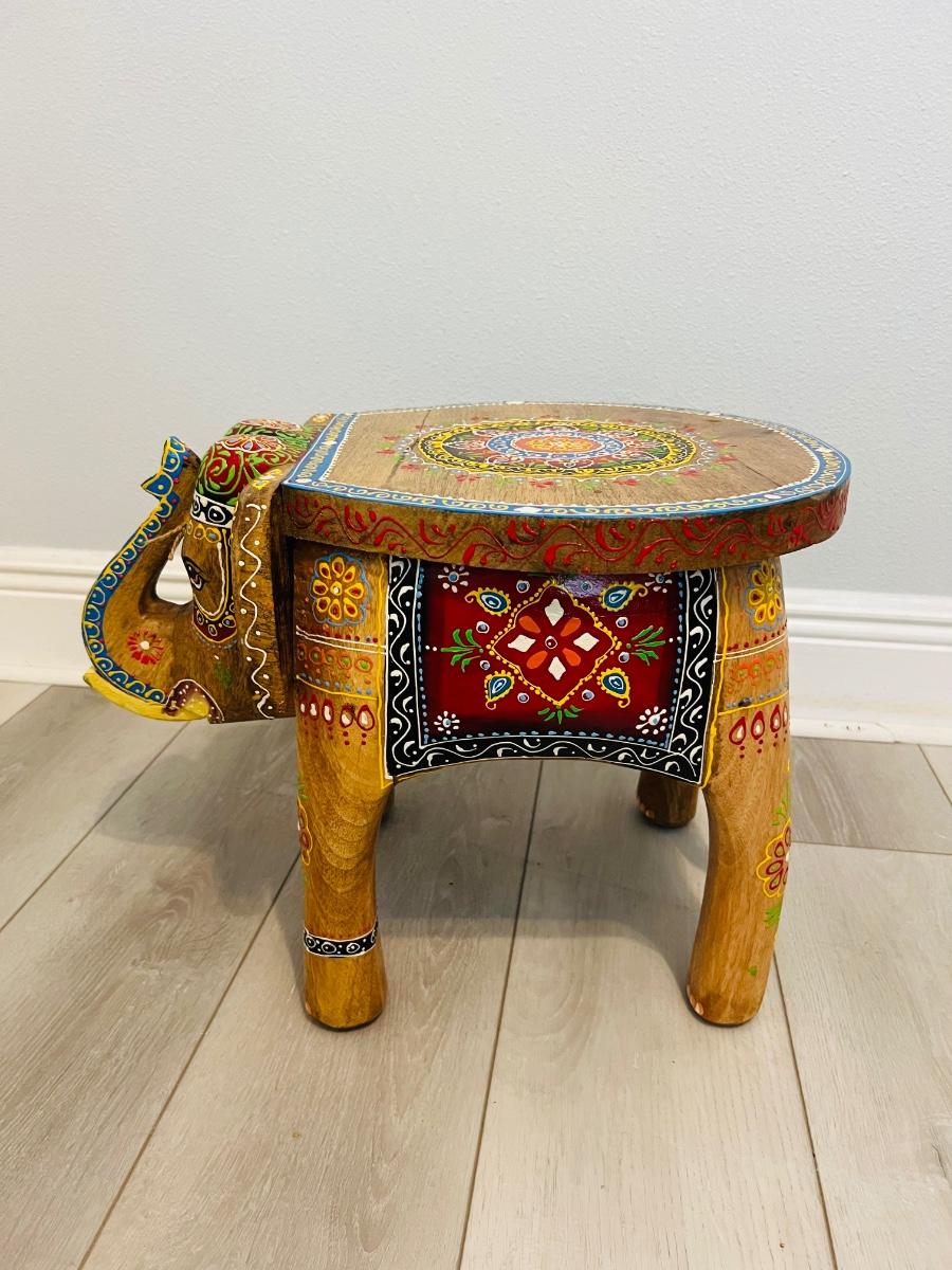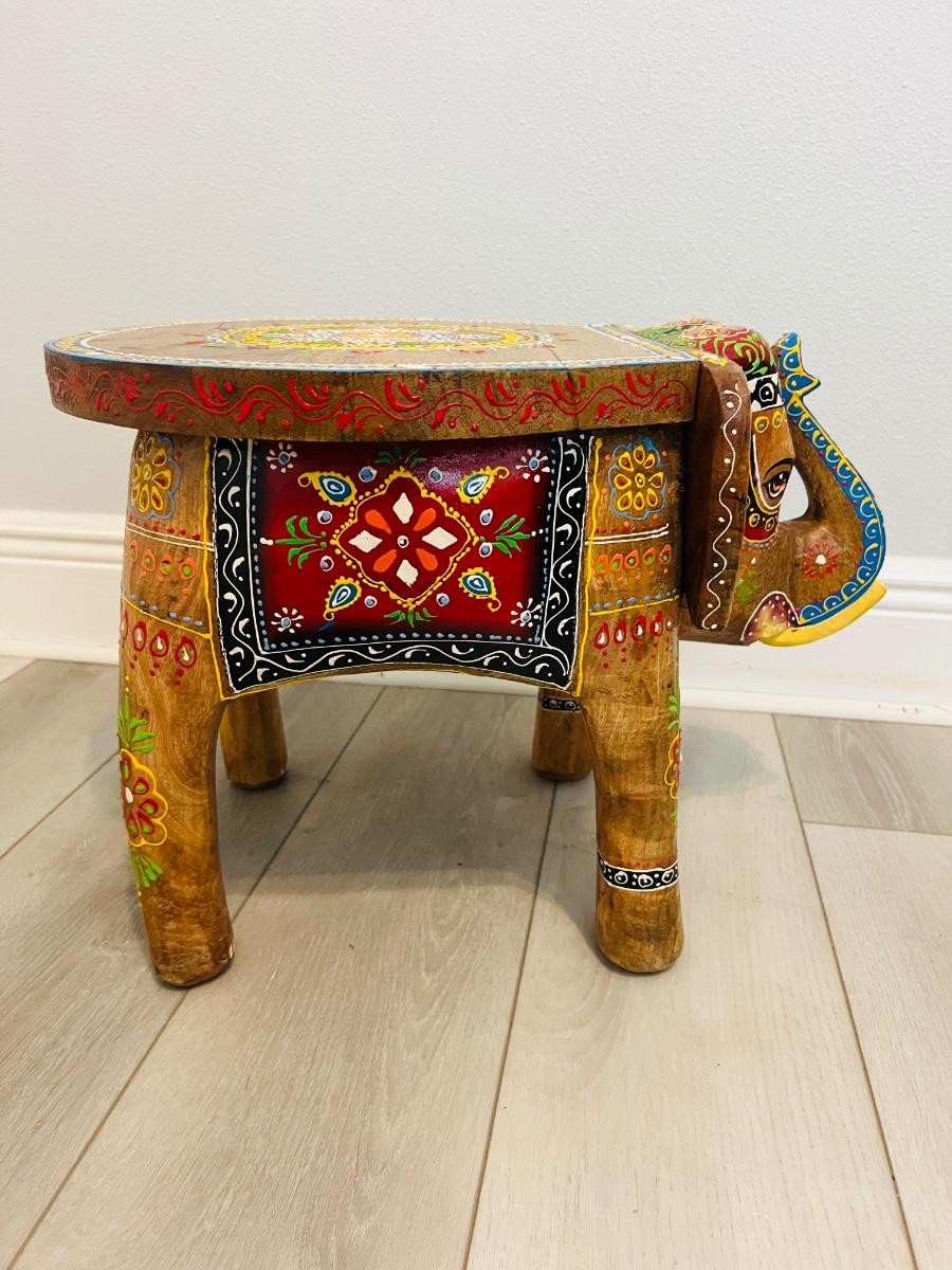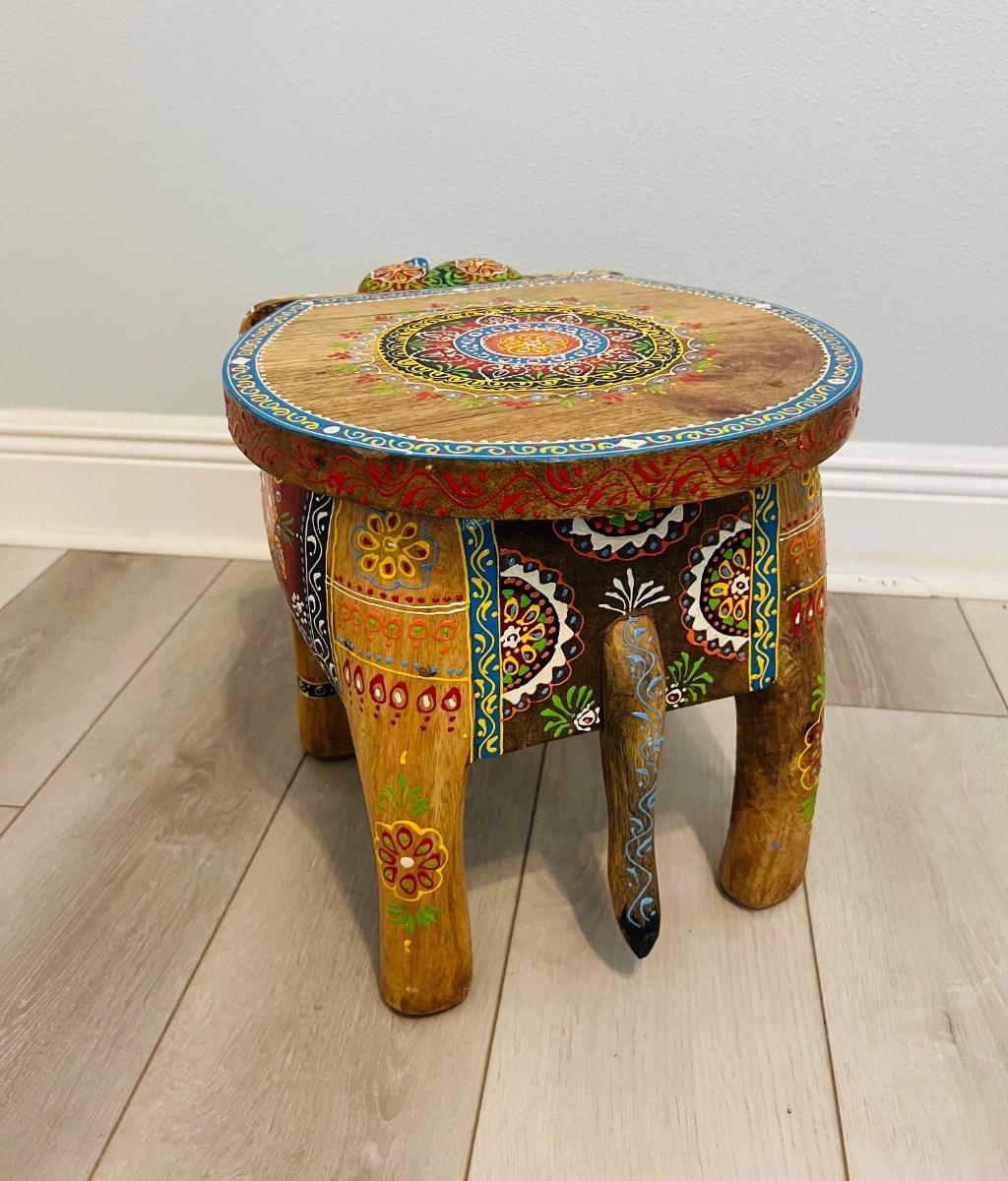 Indian Hand Carved Wooden Elephant stool. This is solid wood. Painted with vibrant colors. This is a really awesome find! Measures 13 1/2 inches tall, 18 inches deep and 13 1/2 inches wide. Like brand new!