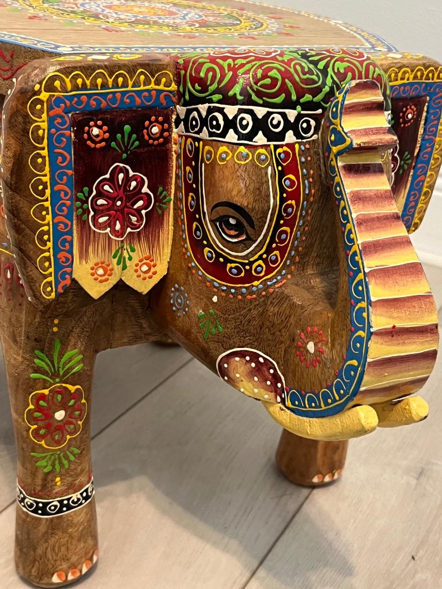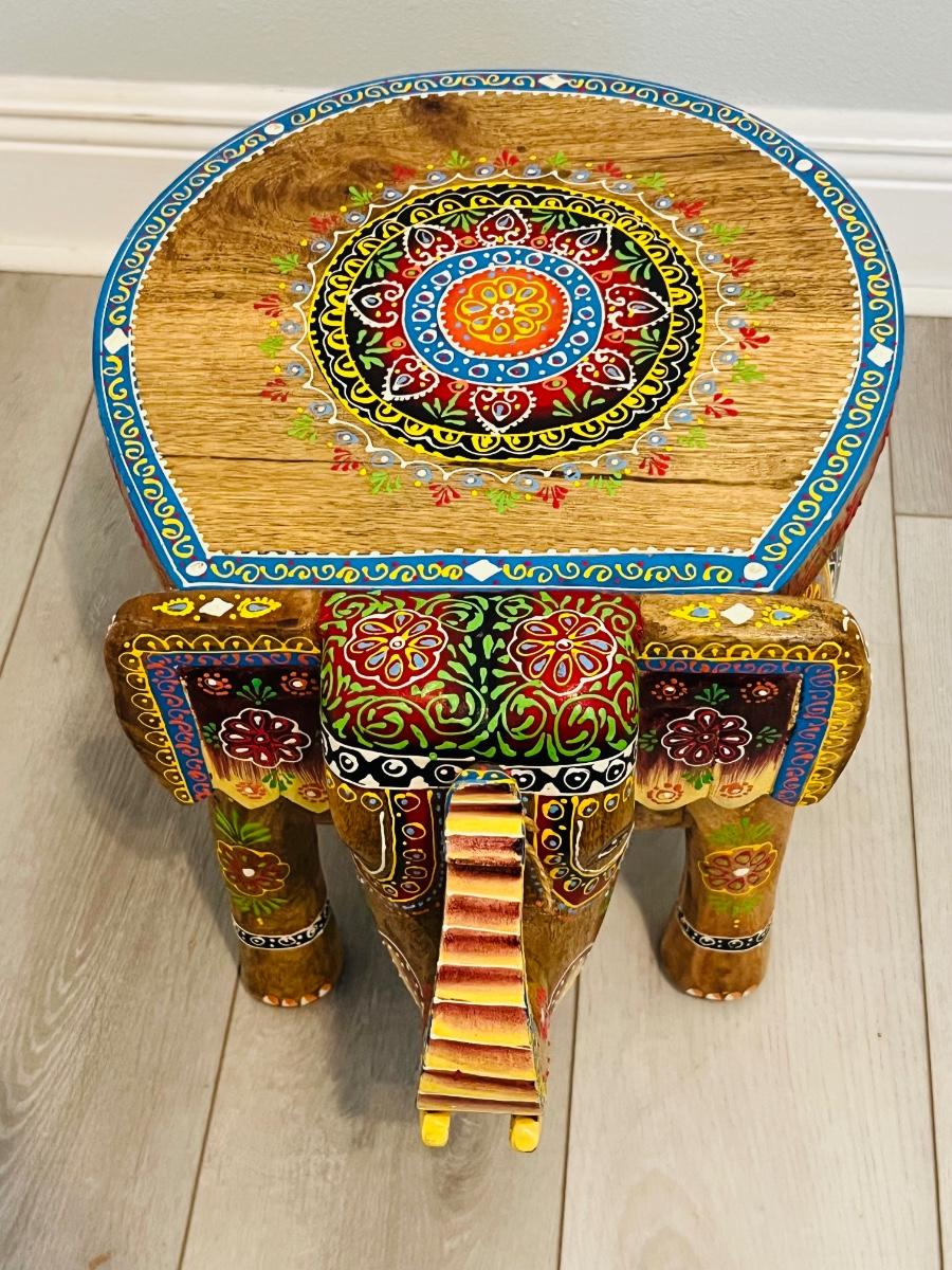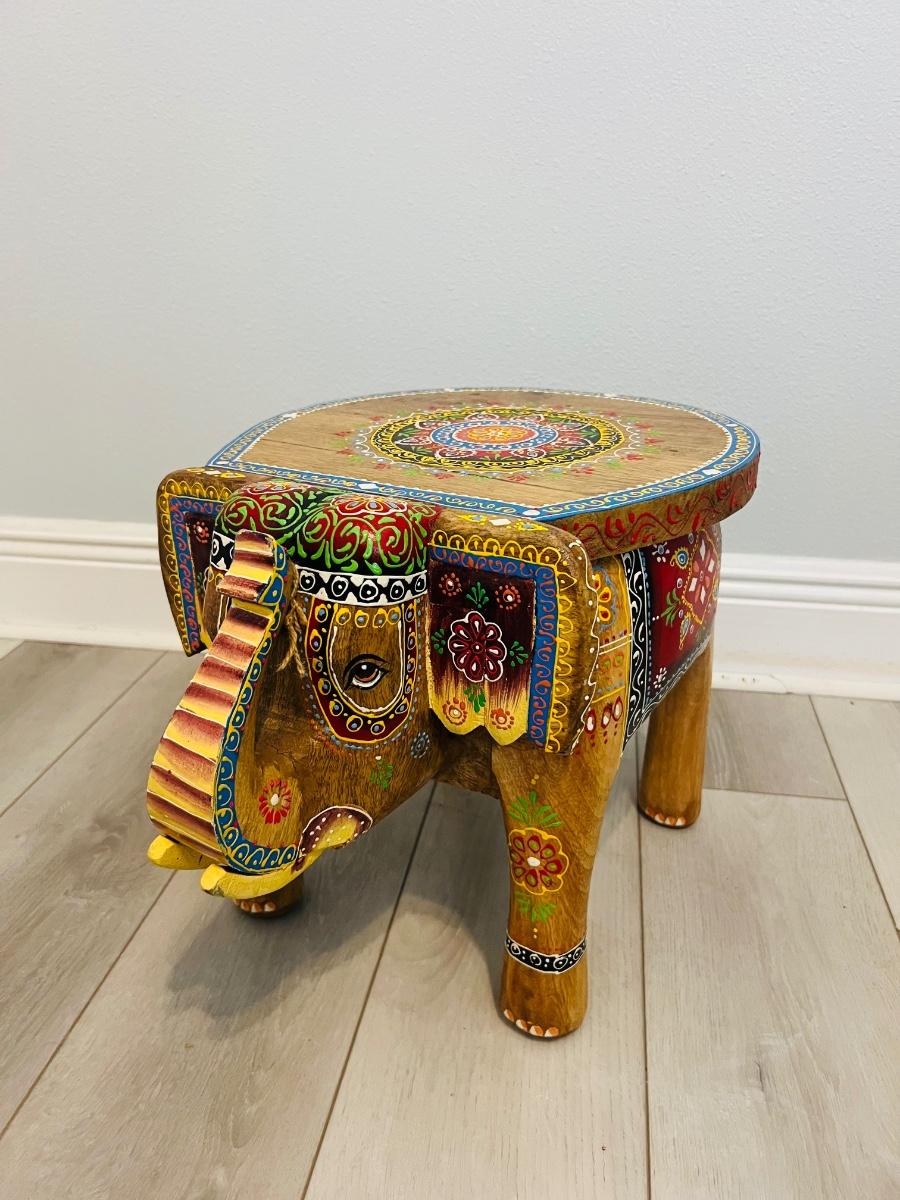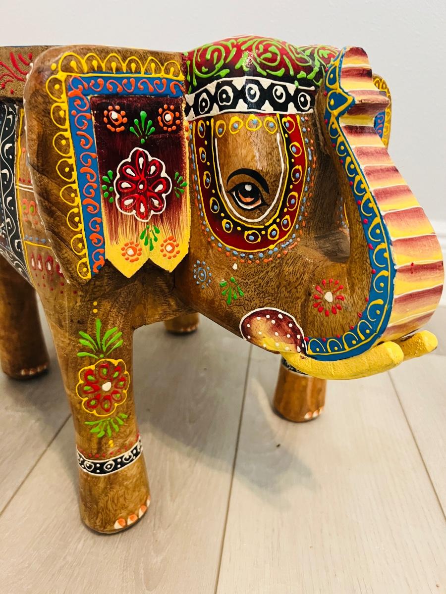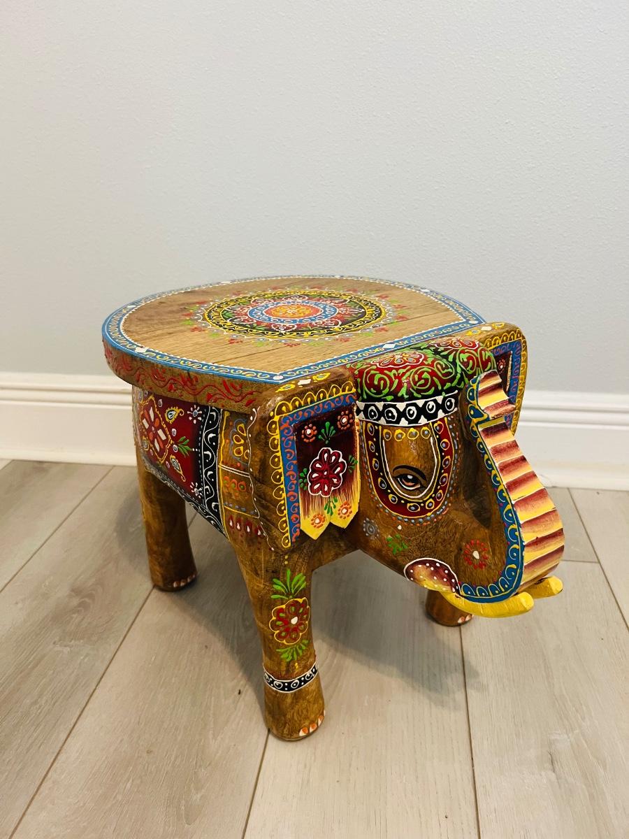 Indian Hand Carved Wooden Elephant stool. This is solid wood. Painted with vibrant colors. This is a really awesome find! Measures 13 1/2 inches tall, 18 inches deep and 13 1/2 inches wide. Like brand new!