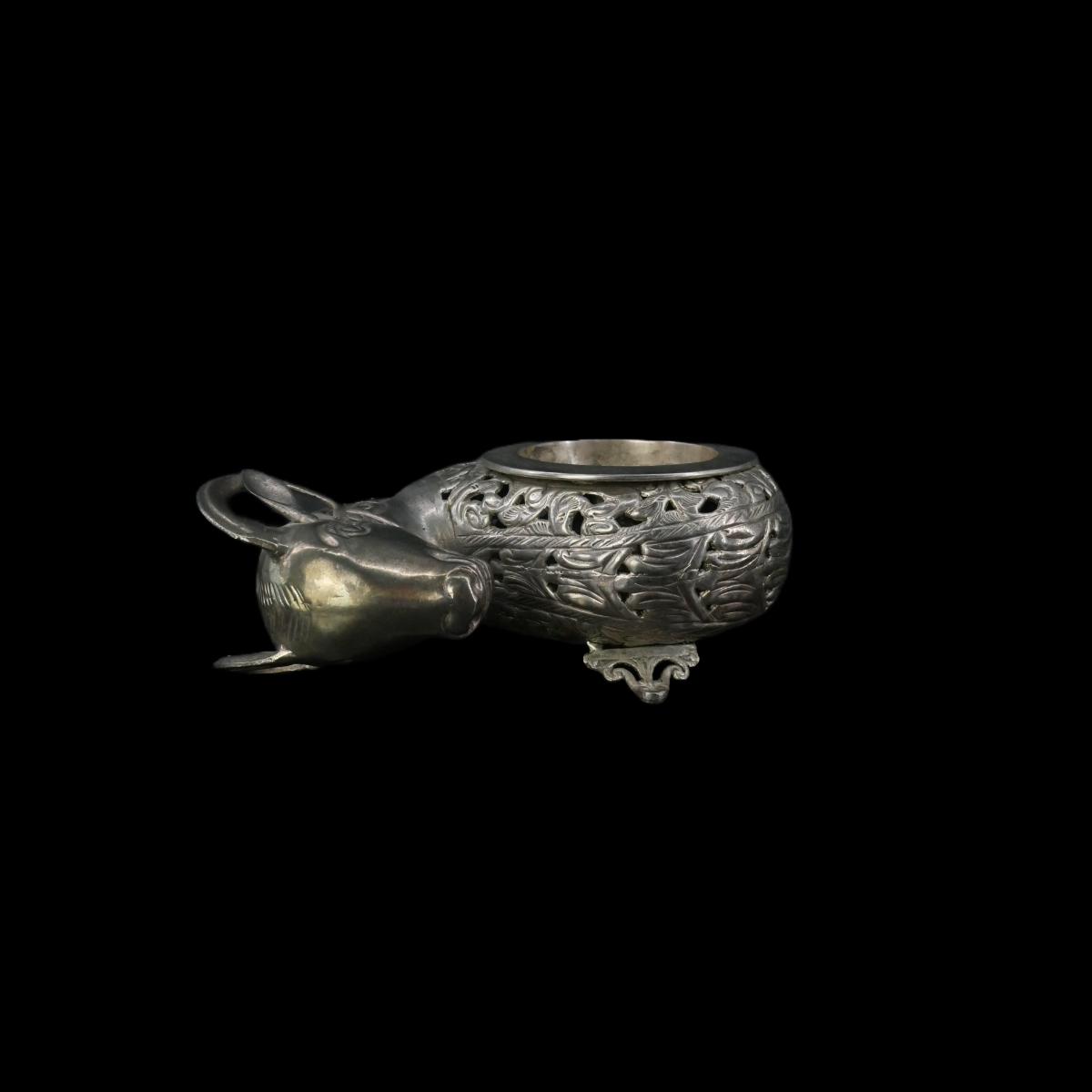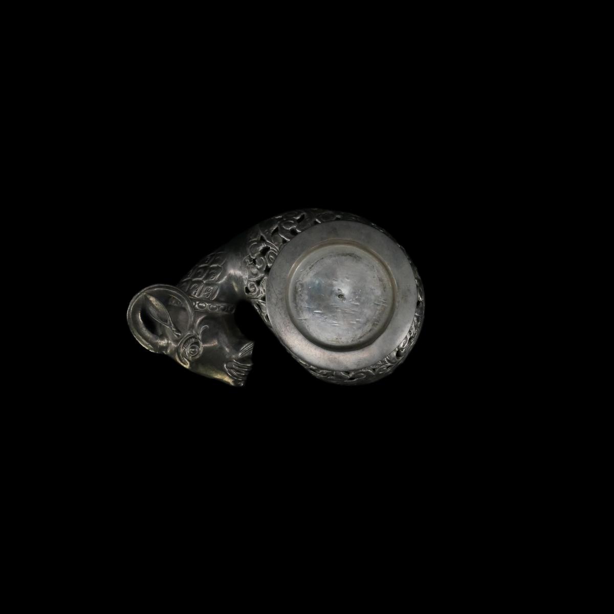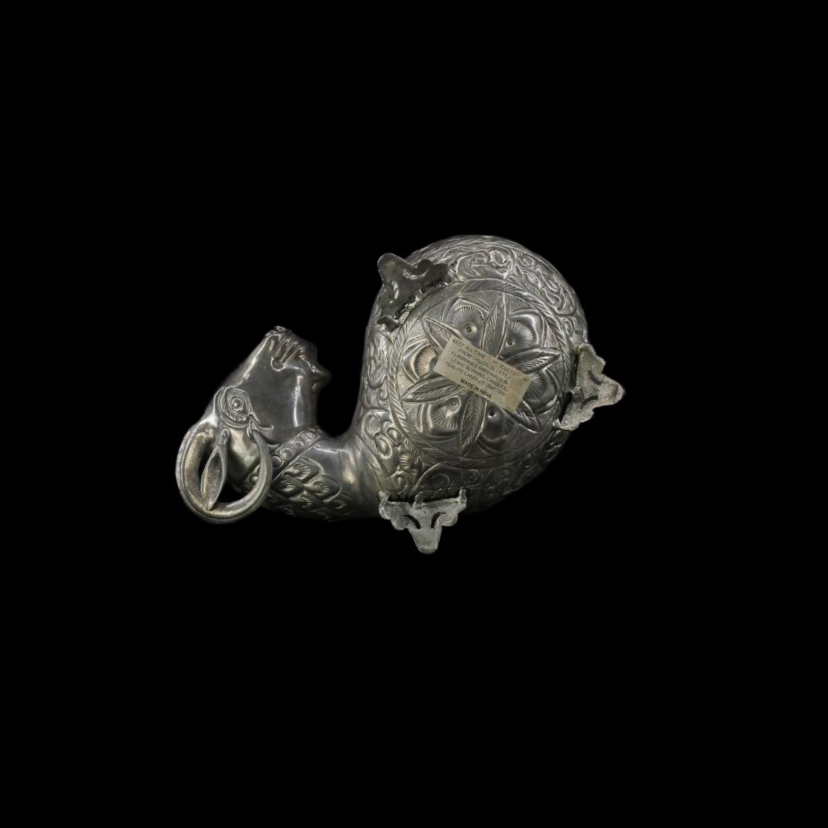 Ornate metal ram candle holder, made in India. Beautifully intricate design throughout. Has some tarnish, but can be polished if desired. Excellent condition! Diameter of candle holder is 3". Entire piece is L 9" x H 3" x W 5", weighs 1 lb 12 oz. (D97)
