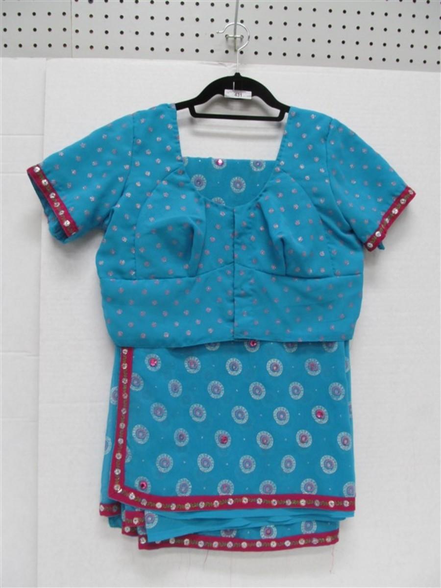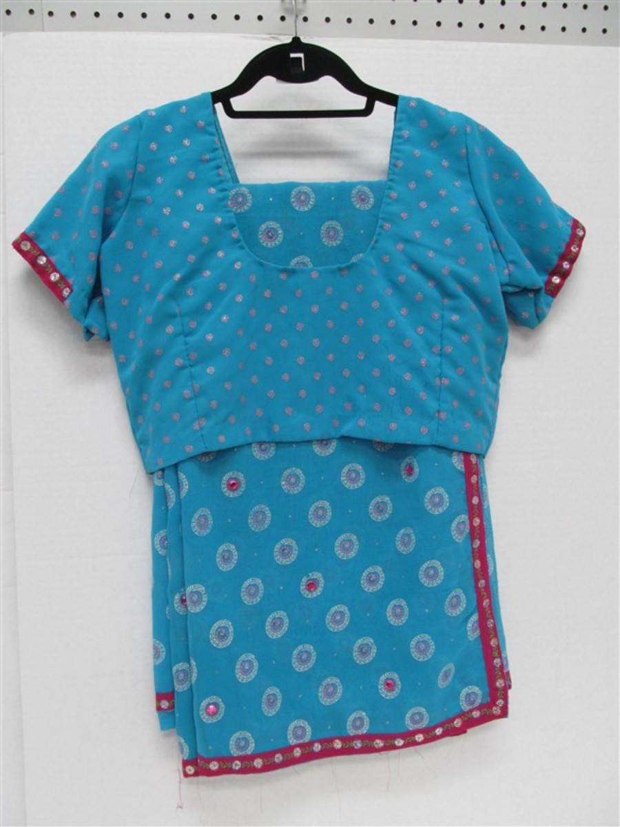 INDIAN SARI SAREE BRIGHT BLUE WITH RHINESTONES & SEQUINS WITH PINK TRIM BONUS TOP